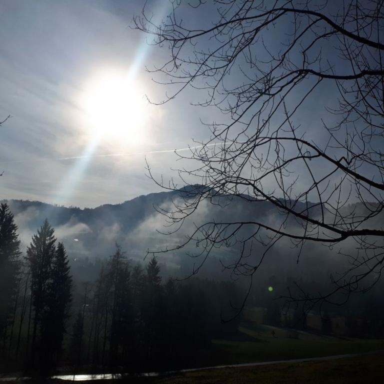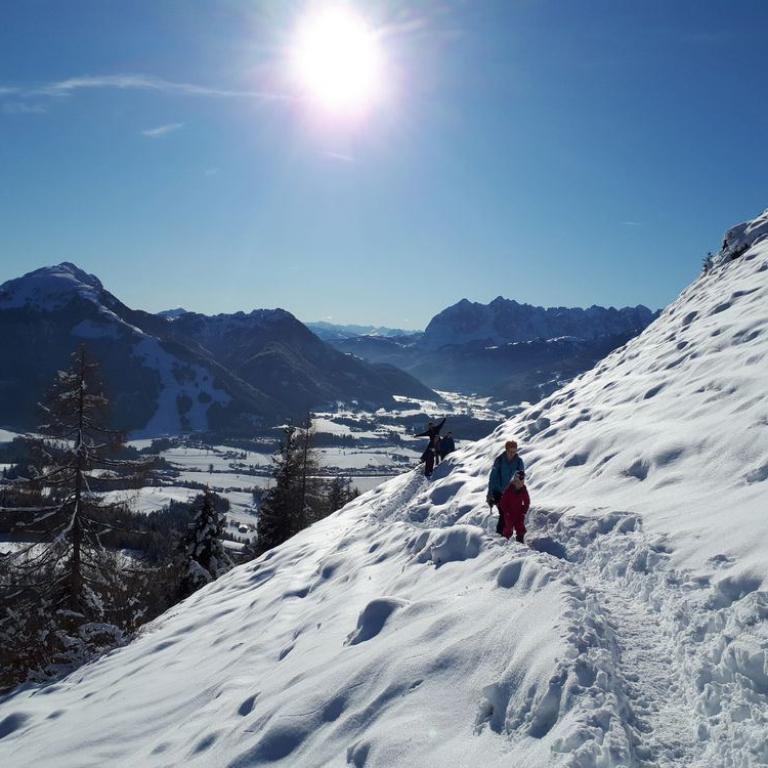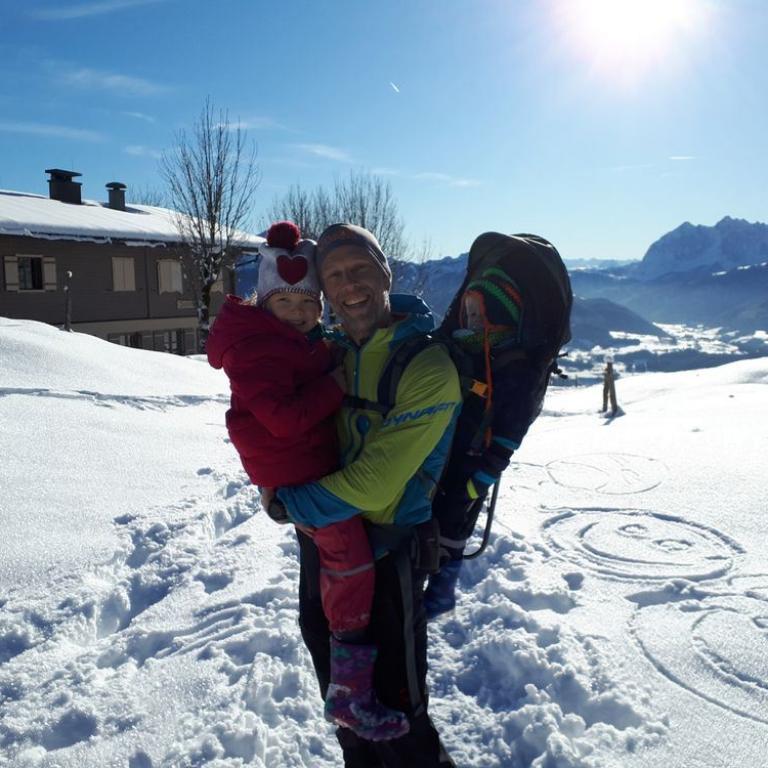 Die ersten Sonnenstrahlen begrüßten uns durch das Fenster. Ich zog meine Laufklamotten an und lief los. Zuerst durch Grassau und dann bis zum Wanderparkplatz Strehtrumpf und von dort einen Trail bis zur Hefteralm und Rachlalm auf knapp 1000 m Höhe, die im Winter geschlossen haben. Über die Grassauer Almen lief ich dann weiter zur Zeppelinhöhe und zurück nach Grassau. Meine Zwerge und Brigitte erwarteten mich schon. Nach einer Dusche und kurzem Frühstück packten wir unsere Sachen ins Auto und fuhren zum Walchsee. Hier fanden wir ein Kaiserwetter am Wilden und Zahmen Kaiser. Am Wanderparkplatz bei Kranzach (Hallbruckhof) starteten wir unsere Wanderung zur Haraualm auf 985 m...