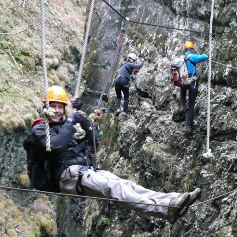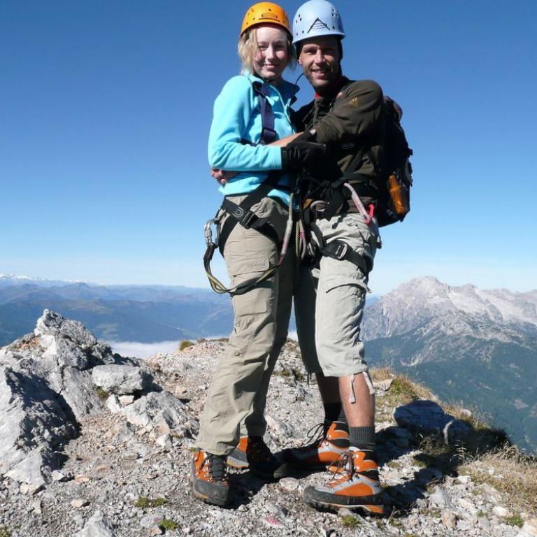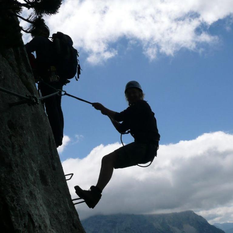 | Auf dem Gipfel des Rauschberg mit Watzmann im Hintergrund | Brigitte in Action im Drachenwand Klettersteig | Markus in Action im Pidinger Klettersteig |