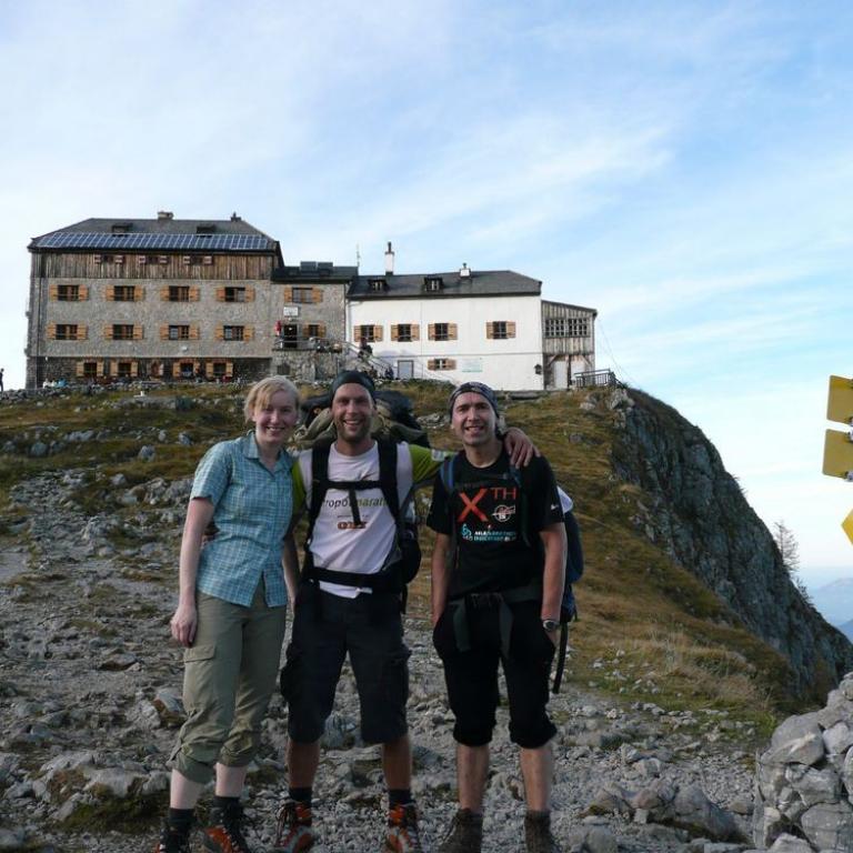 - Freitag den 8. Oktober wollten wir das Abenteuer wagen. Das Wetter sah vielversprechend aus und so starteten Wolfi, Brigitte und ich unsere Tour um 11 Uhr am Königssee. Zuerst bestiegen wir den Grünsteinklettersteig (Schwierigkeit B-C), dann gings weiter bis zur Kührointalm und dann kam der Aufstieg zum Watzmannhaus. Wir waren 6 Stunden unterwegs und legten 1300 Höhenmeter zurück.