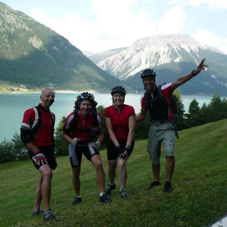 Da der Ironman erst 10 Tage her war, hatte ich leichte Bedenken den Alpencross mit dem Mountainbike zu schaffen, aber trotzdem starteten Brigitte, ihr Bruder Hans und mein Arbeitskollege Hans am Mittwoch in Garmisch. Geplant war die Via Claudia mit ein paar Spezialrouten. Zuerst fuhren wir nach Ehrwald und über den Fernpass bis Imst. Hier ging es noch hoch bis Imsterberg, wo wir in einem gemütlichem Garni übernachteten. Am 2. Tag stand die Venetalm mit 1100 Hm auf dem Programm. Vier Stunden quälten wir uns nach oben und wurden mit einer herrlichen Aussicht belohnt. Rasant ging es dann wieder abwärts bis Wenns und weiter nach Piller. Hier entschieden wir uns die Nacht zu bleiben. Am Freitag radelten wir weiter durch das herrliche Inntal bis in die Schweiz nach Martina, wo wir 400 Hm zur Norbertshöhe radelten. Von hier fuhren wir ab nach Nauders und weiter bis zum Reschensee in Südtirol. Hier übernachteten wir zum 3. Mal. Am Samstag fuhren wir den Vinschgauradweg 110 km zuerst bis Meran und weiter nach Bozen, wo wir uns ein kleines Hotel (Feichter) suchten. Am letzten Tag fuhren wir mit dem Zug von Bozen bis Brenner. Von hier radelten wir nach Insbruck und dort ging es mit dem Zug wieder zurück nach Garmisch. Insgesamt waren wir 5 Tage, 310 Kilometer und 5000 Höhenmeter unterwegs. Großer Respekt an Brigitte da sie als Mountainbikeanfängerin die Tour ohne Probleme und mit viel Spaß bewältigte.