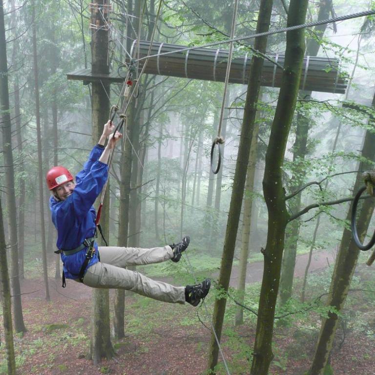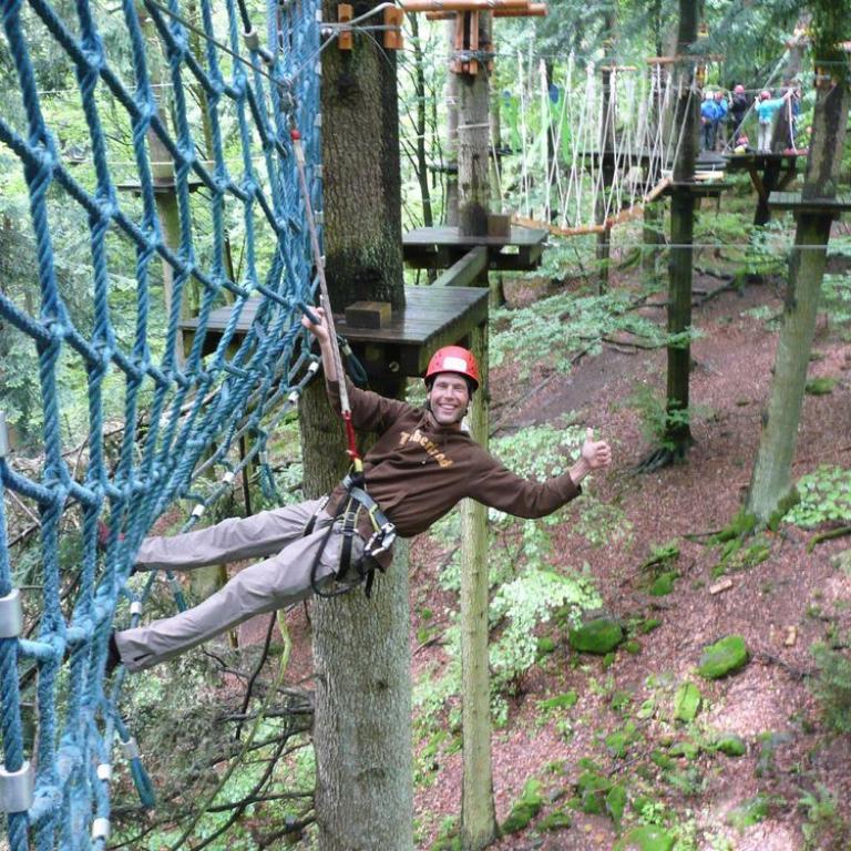 Der Eintritt kostete 39 Euro pro Person. Jockel, Hans, Brigitte und ich wurden zuerst eingewiesen und durften dann so ziemlich selbstständig durch die Bäume sausen und die Herausforderungen meistern. Das Ganze machte uns natürlich wieder sehr viel Spaß und wir genossen den Adrenalinkick. Nach ca. 2 Stunden in den Bäumen hatten wir über 12 Flying Fox Stationen wieder festen Boden erreicht. Direkt daneben gab es im Turmstüberl noch eine kleine Brotzeit und ein gutes Weißbier.