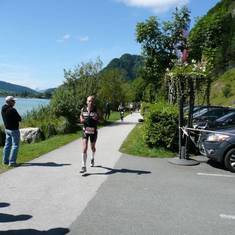Die unglückliche Bayernniederlage am Tag zuvor, war um 4 Uhr morgens, als der Wecker klingelte, schnell vergessen. Ich richtetet meine Wettkampfsachen her, bevor wir zum gemeinsamen Frühstück gingen. Um kurz nach 5 Uhr fuhren wir zur Eventarena. Ein letztes Mal gingen wir in die Wechselzone, kontrollierten den Reifendruck und überprüften nochmals die Wechselbeutel. Im Anschluß marschierten wir zum ersten See, wo auch der Start erfolgen wird. Geschwommen wurde in 2 Seen, das heißt dazwischen mussten wir ca. 300 Meter am Land mit Neopren laufen, bevor wir in den 2. See springen konnten. Es wurde in verschiedenen Wellen, nach Altersklasse, Profis und Geschlecht aufgeteilt. Um 7 Uhr starteten die Profis mit riesigem Beifall. Meine Altersklasse war um 7.55 Uhr an der Reihe. Langsam wurde ich nervös....