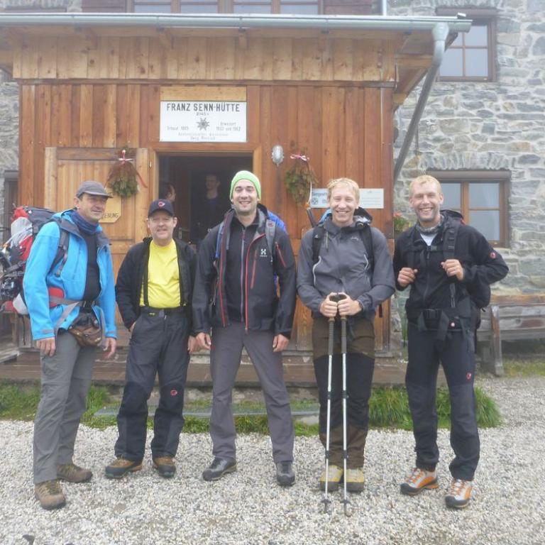 Diesmal starteten Wolfi, Hans, Brigitte und ich mit unserem Kursleiter Martin und zwei weiteren Teilnehmern des Alpenvereins Regensburg Roland und Wolf ins Stubaital. Stützpunkt war die Franz Senn Hütte auf 2149 m. Nach dem Aufstieg übten wir vor der Hütte gleich die Spaltenbergung. Am Freitag war die erste Tour auf den Gletscher angesagt. Mit Seil, Steigeisen und Pickel bewaffnet ging es über den Arperer Turm Ferner auf den Vorderen Wilder Turm mit seinen 3177 m (Mein 11. Dreitausender). Am 3. Tag übten wir am Sommerwandferner die Spaltenbergung in der Praxis, genauso wie man sich am Gletscher mit Steigeisen bewegt. Am Abreisetag bezwangen wir noch einen klasse Schluchtenklettersteig und bekamen bei einem Abschlußkaffee noch etwas Theorie auf der Hütte vermittelt. Der Kurs hatte sehr viel Spaß gemacht und natürlich Lust auf mehr Gletscher...