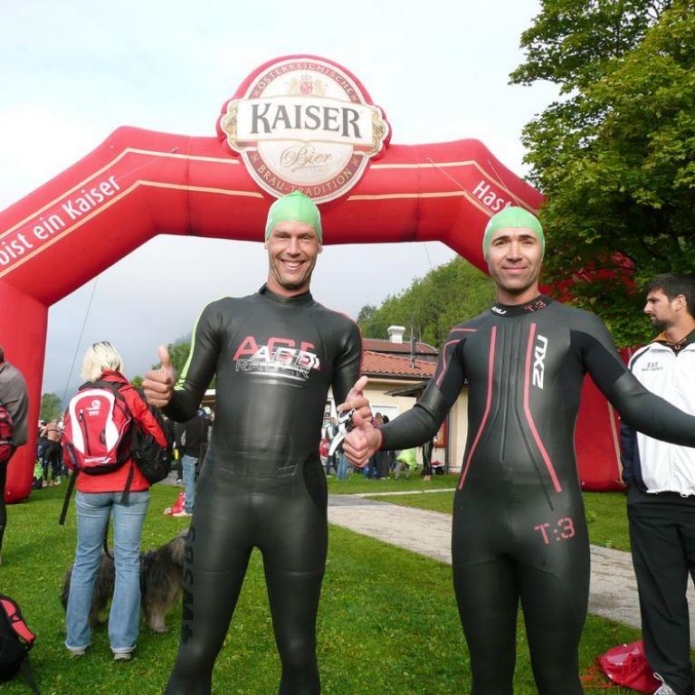 Die unglückliche Bayernniederlage am Tag zuvor, war um 4 Uhr morgens, als der Wecker klingelte, schnell vergessen. Ich richtetet meine Wettkampfsachen her, bevor wir zum gemeinsamen Frühstück gingen. Um kurz nach 5 Uhr fuhren wir zur Eventarena. Ein letztes Mal gingen wir in die Wechselzone, kontrollierten den Reifendruck und überprüften nochmals die Wechselbeutel. Im Anschluß marschierten wir zum ersten See, wo auch der Start erfolgen wird. Geschwommen wurde in 2 Seen, das heißt dazwischen mussten wir ca. 300 Meter am Land mit Neopren laufen, bevor wir in den 2. See springen konnten. Es wurde in verschiedenen Wellen, nach Altersklasse, Profis und Geschlecht aufgeteilt. Um 7 Uhr starteten die Profis mit riesigem Beifall. Meine Altersklasse war um 7.55 Uhr an der Reihe. Langsam wurde ich nervös....