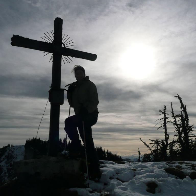 Bei herrlichstem Wetter fuhren Hans, Tom, Brigitte und ich nach Ettenhausen (Nähe Schleching), von wo aus wir den Breitenstein (Bayerische Voralpen) mit den Tourenskiern bestiegen. Bei Sonne, blauem Himmel und angenehmen Temperaturen konnten wir direkt vom Parkplatz starten. Über eine alte Skipiste ging es zuerst nach oben, bis wir an der Wuhrsteinalm vorbei kamen und weiter bis wir links einen steilen Hang empor mussten. An einer Scharte ließen wir unsere Ski stehen und marschierten noch bis zum Gipfel (1622 m), von wo wir eine herrliche Aussicht hatten. Die Abfahrt war für mich sehr schwierig, aber die Brotzeit auf der Alm entschädigte vieles :-)