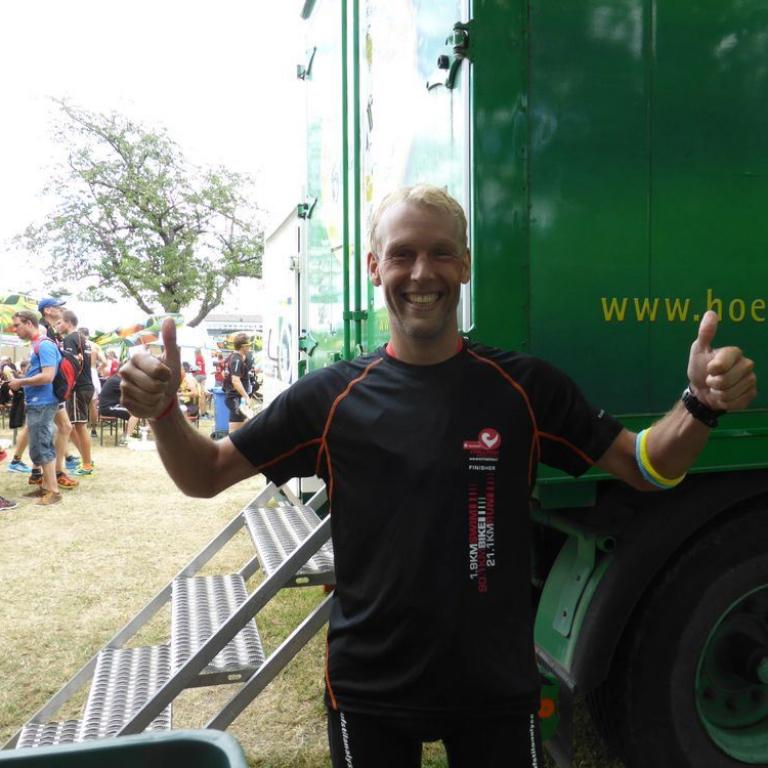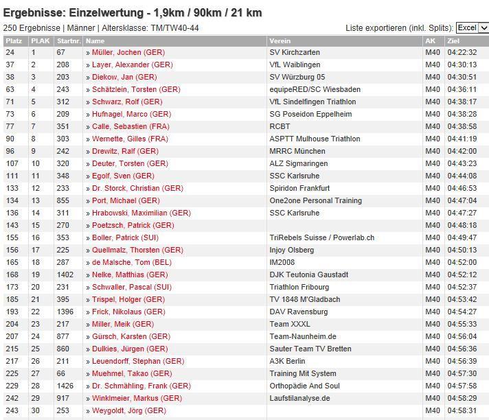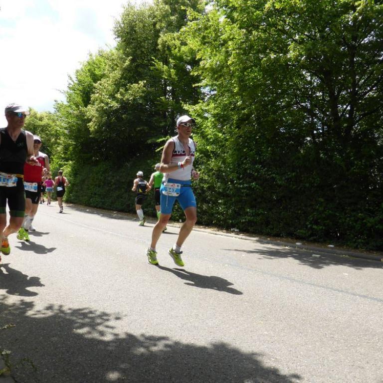 Um 6 Uhr klingelte der Wecker. Nach dem Frühstück im Hotel (nur Triathleten im Frühstücksraum), checkten wir aus und fuhren zum Schwimmstart. Hier bekamen wir die Info, dass das Neoverbot aufgehoben wurde. Wir überprüften nochmals den Reifendruck und gingen dann langsam an den Start. Es wurde in verschiedenen Wellen gestartet. Die Profis um 9, Ralf und Silvia um 5 nach 9 und der Rest von uns in den weiteren Wellen. Daniel, John und ich waren um halb 10 Uhr mit Wasserstart dran. Mit Hells Bells von AC/DC wurden wir eingestimmt. Startschuss und ab ging es durch den Hardsee. Am Anfang musste ich in dem Gedränge ganz schön kämpfen, bis es mir gelang im Wasserschatten bis zur ersten Boje zu schwimmen. Hier verlor ich leider meinen Vordermann und ich irrte etwas umher. Langsam fand ich wieder meinen Rhythmus und konnte das Schwimmen in 32:10 min zu Ende bringen. In der Wechselzone fand ich nicht gleich meinen Wechselbeutel und verlor einige Sekunden. Dafür ließ ich die Socken weg und ab zum Rad. Zuerst fuhren wir absolut eben bis nach Bad Schönborn, aber leider mit leichtem Gegenwind. Von hier ging es nach Osten, wo mir der Wind direkt ins Gesicht blies. Mein Tacho zeigte 26 km/h an. Na toll dachte ich, das kann ja lustig werden. Trotzdem war ich nur am überholen. Langsam kamen die ersten Steigungen, die aber relativ locker zu überwinden waren. Flüssiges fahren war auf der gesamten Strecke, danke der verwinkelten Streckenführung nicht möglich. Nach 30 Kilometer hatte ich immerhin einen knappen 31 Schnitt geschafft und die Radstrecke machte immer mehr Spaß, auch wenn man sehr häufig, dank der Abknickungen, Kurven und Hügel ausgebremst wurde. Ich war nur am überholen und kassierte langsam auch die Starter der Startwelle 15 Minuten vor mir. Ab 70 Kilometer hatte ich ganz schön zu kämpfen, da die letzte 10 Kilometer 3 giftige Steigungen im Weg standen. Ab Kilometer 80 hatte ich zum ersten Mal Rückenwind und ich brauste mit einem 40 er Schnitt Richtung Wechselzone. Den Radpart schaffte ich in 2h 49 min 29 sec bei 1000 Hm und 90 km. Und ab ging es auf die Laufstrecke. Ich fühlte mich gut, auch dank Caros Hypo und Pampe. Die Füße waren frisch für den Halbmarathon und ab ging es zum Überholen mit einem 4:13 er Schnitt auf der ersten 7 km Runde. Einen Athleten nach dem Anderen ließ ich hinter mir. Endlich sah ich auch Brigitte an der Strecke. Auf der Radstrecke hatte ich sie ja nicht registriert. Dies gab mir zusätzlichen Auftrieb und weiter ging es in die zweite Runde. Ich wurde etwas langsamer, aber nur unwesentlich. Die zweite Runde beendete ich mit einer 4:26 Pace. Die letzte Runde wurde natürlich etwas härter, aber auch hier konnte ich immerhin noch eine 4:39 Pace laufen. Beim Zieleinlauf versenkte ich auch noch ein paar Athleten und hatte dann eine Zeit von 4h 58 min 29 Sekunden stehen. Ich holte mir Gesamt den 242. Platz von 1569 männlichen Startern und in der Ak den 29. Platz von 250. Im Anschluss räumte ich noch das Finisher Buffet leer und nach dem Duschen (mit dem Sieger und somit Deutscher Meister Kienle Sebastian, wobei mir Ivonne van Vlerken lieber gewesen wäre :-)) ging ich zur besten Brigitte der Welt, die mich wieder einmal den ganzen Tag top unterstütze, obwohl sie ja schon in der 34 Schwangerschaftswoche war. Dankeschön an meine bessere Hälfte . Wir sahen uns noch den Zieleinlauf von Hans an und fuhren dann wieder die fast 350 Kilometer nach Hause. Der Ironman Austria in 2 Wochen kann nun kommen.