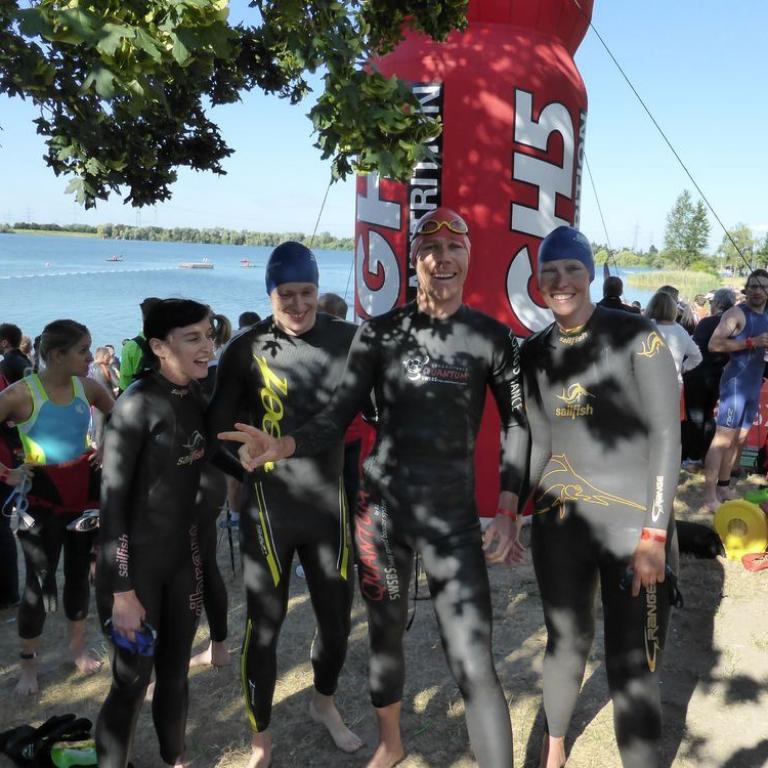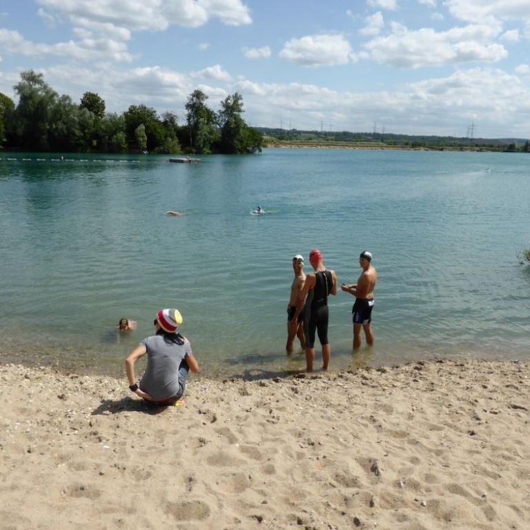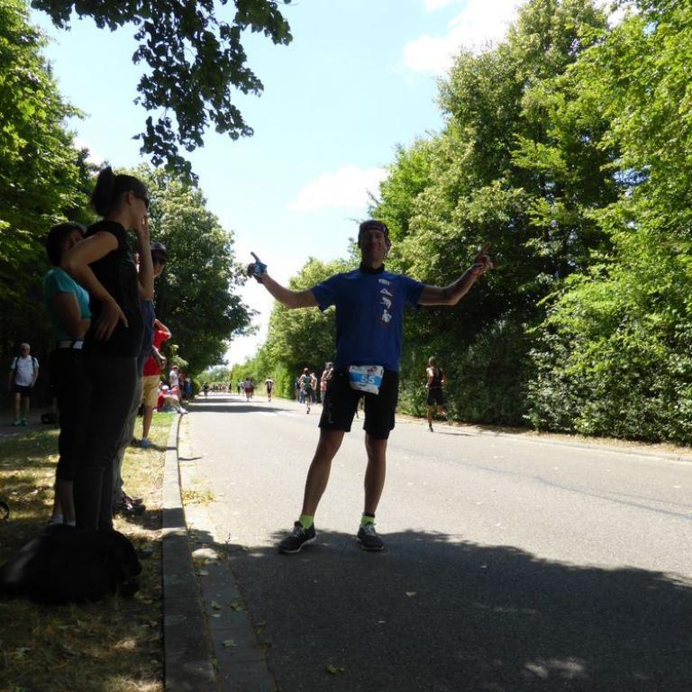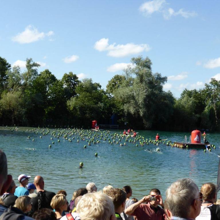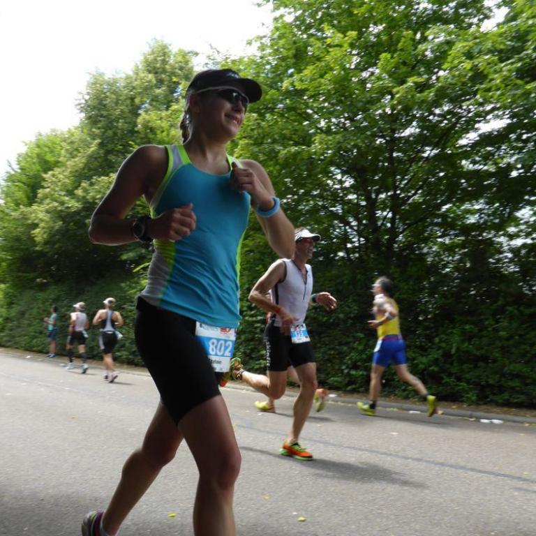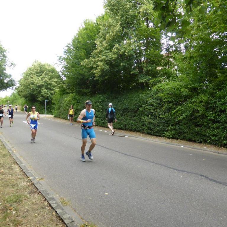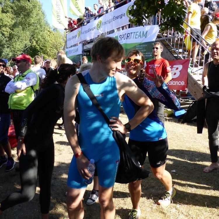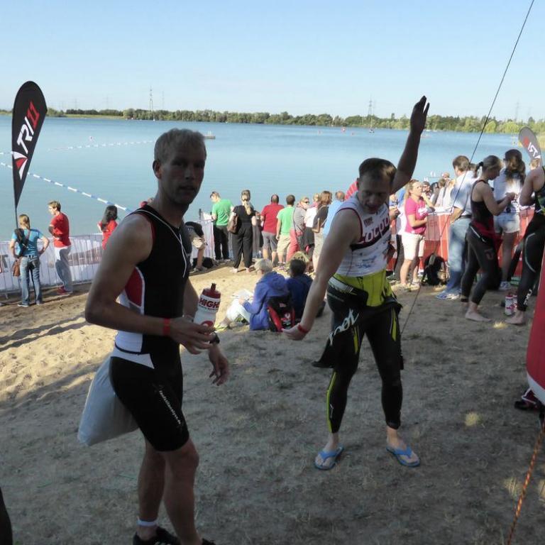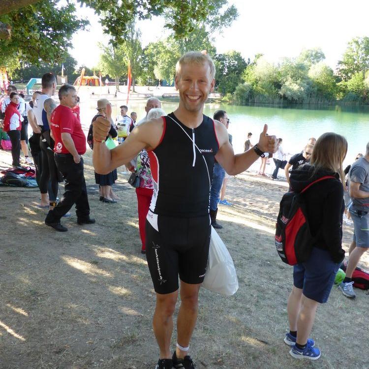 Racebericht: Gleich mal vorweg, die 5 Stunden Marke ist trotz meiner nun schon 40 Jahre geknackt . Aber erst mal alles der Reihe nach. Am Freitag feierte ich zuerst noch meinen 40. Geburtstag im Biergarten und spät am Abend richtete ich noch meine Sachen für den Wettkampf her. Samstagfrüh fuhren Brigitte und ich nach Bad Schönborn im Kraichgau. Zuerst holten wir die Startunterlagen ab und bezogen dann unser Hotel in St. Leon-Rot 10 km entfernt. Brigitte gönnte sich eine Pause, während ich eine halbe Stunde locker radelte und noch 10 min joggte. Am Nachmittag fuhren wir dann an den Hardsee, wo der Schwimmstart sein wird. Wir trafen uns mit Ralf und noch ein paar weiteren Laufstilanalyseathleten. Ralf, Daniel und ich legten noch eine kurze Schwimmeinheit ein. Ich musste locker machen, da ich am Freitag mal wieder einen Krampf im rechten Fuß bekommen hatte. Diesmal fehlte nichts. Im Anschluss checkten wir noch unsere Räder in der Wechselzone ein. Danach fuhren wir wieder in den Zielort Bad Schönborn wo die Wettkampfbesprechung und Pastaparty stattfand. Brigitte gewann sogar ein paar New Balance Laufschuhe, die ich von Ivonne van Vlerken auf der Bühne abholen durfte. Viele weitere Profis werden am nächsten Tag am Start sein. Der Favorit war natürlich Sebi Kienle.