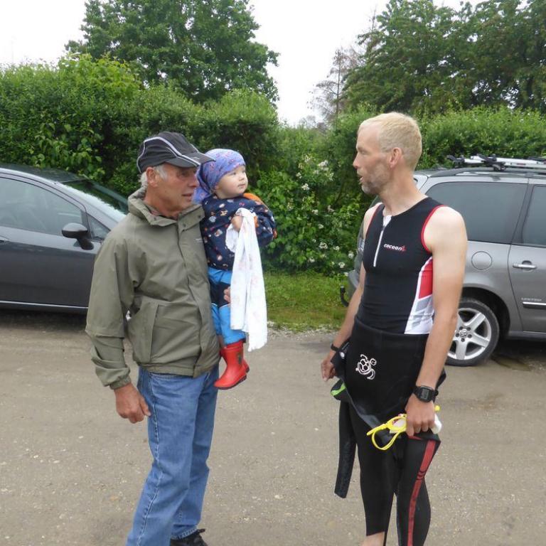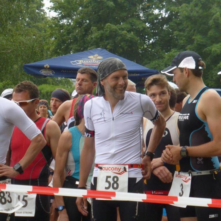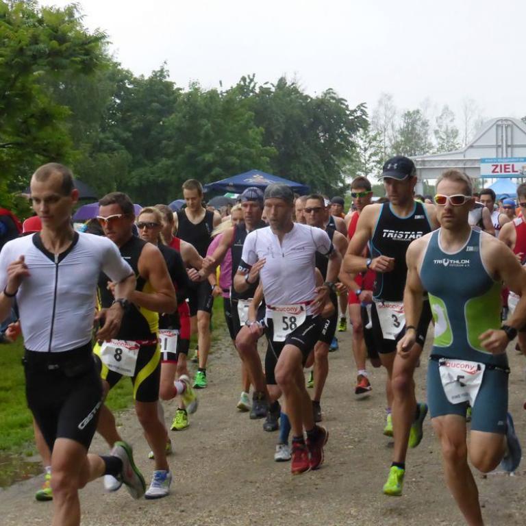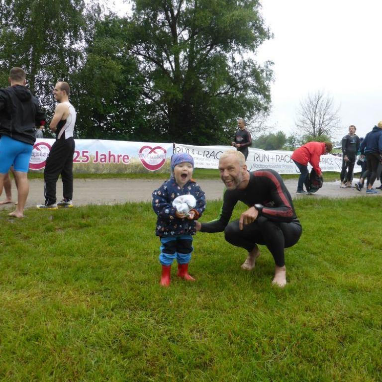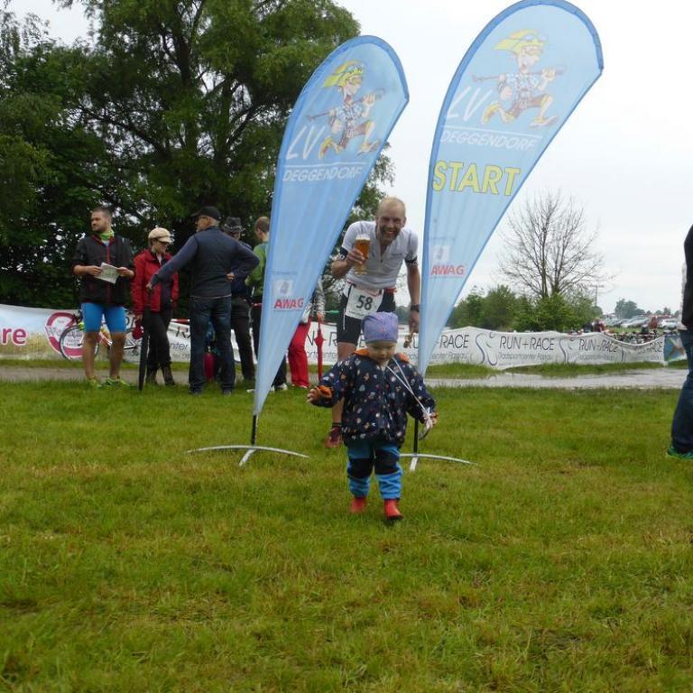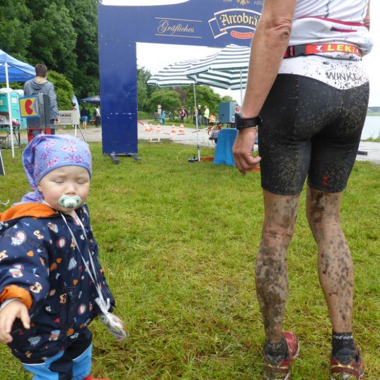 Eigentlich konnte das Event in Deggendorf nicht so richtig was werden. Vor zwei Wochen waren wir im hammerharten Trainingslager in Kaltern. Letzte Woche vernichtete ich mich beim Ultratrail Lamer Winkel auf 53 km 2700 Höhenmetern und gestern fand das Abschlußkoppeltraining von Laufstilanalyse statt. 128 km Bike im 30 er Schnitt bei 1400 Hm und 10 km Run im 4:16 er Schnitt. Schwere Füße waren angesagt und leider plagte mich schon seit Wochen der linke Hüftknochen mit einer Knochenhautentzündung :-( Aber Kämpfer braucht das Land, so fuhr ich um halb 8 nach Deggendorf, bzw. zum Hackerweiher, wo die 10. Auflage des Deggendorf Triathlons statt finden sollte. Es sah nach Regen aus und Gewitter waren vorhergesagt. Es war aber ziemlich kühl mit 14 Grad, was für eine Schwimmeinheit nicht gerade die passenden Temperaturen waren. Ich holte meine Startunterlagen ab und traf gleich mal die halbe Laufstilanalyse :-) Kurz vor dem Start kamen meine treuen Fans, meine Mama und Papa, Brigitte und natürlich mein größter Fan, meine kleine Emmamaus, die mich wieder lautstark anfeuern wollte. Kurz vor dem Start wurde bekanntgegeben, das aus dem Triathlon dank der Gewitterwarnung und Donnern im Hintergrund, ein Duathlon wird. Schade, aber Sicherheit geht vor. Lob an den Veranstalter wenn so gehandelt wird. Klar wollte ich für den Ironman in 3 Wochen noch ein wenig Wechsel und Schwimmroutine sammeln, aber den Wechsel hab ich auch beim Duathlon. Um halb 10 Uhr fiel dann der Startschuß. Wir hatten 5 km zu laufen, bevor es auf das Rad ging. Oh leck hatte ich schwere Füße, aber ich setzte gleich mal Zeichen und hielt mich an der 3. Stelle, die ich aber bald abgeben musste. Trotzdem lief es ganz gut und ich kam als 5. Platzierter in 18:16 min in die Wechselzone. Emma`s "Schneller Papa" motivierte mich zusätzlich. Am Rad hatte ich von Anfang an Probleme. Meine Oberschenkel schmerzten und ich bekam keinen Druck auf die Pedale. Immer wieder wurde ich überholt. Es regnete stärker und ich kämpfte um überhaupt einen 36 er Schnitt zu halten. Nach 38 Kilometer und 1 h 04 min 36 sec kam ich wieder in die Wechselzone. Ich hatte viele Plätze hergeben müssen, die ich mir jetzt beim 10 km Lauf wieder zurückholen wollte. Aber auch zum Laufen waren meine Füße nicht mehr so richtig fit. Das werden lange 10 Kilometer. Die Wendepunktstrecke war mittlerweile schlammig und aufgeweicht. Erst nach der ersten Wende bei Kilometer 2,5 wurde ich wieder und konnte meine Pace gut unter den 4 er Schnitt schrauben. Meine Schuhe waren voller Schlamm und wurden immer schwerer :-) Ich konnte wieder Plätze gut machen, aber für die Top 10 reichte es nicht mehr. Den 10 km Lauf schaffte ich in 39:52 min. Ich wurde 14. Gesamt und in der Altersklasse Vierter. In der Niederbayerischen Meisterschaft konnte ich mir in der Altersklasse den 2. Platz von ganzen 3 Teilnehmern sichern :-) Trotzdem konnte ich nach den vielen Belastungen in den letzten Wochen und Monaten ganz zufrieden sein und mal schauen was ich in 3 Wochen beim Ironman reißen werde :-)