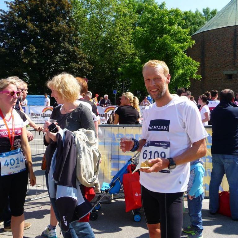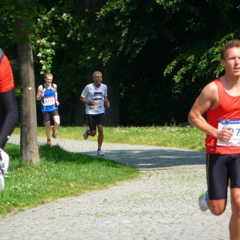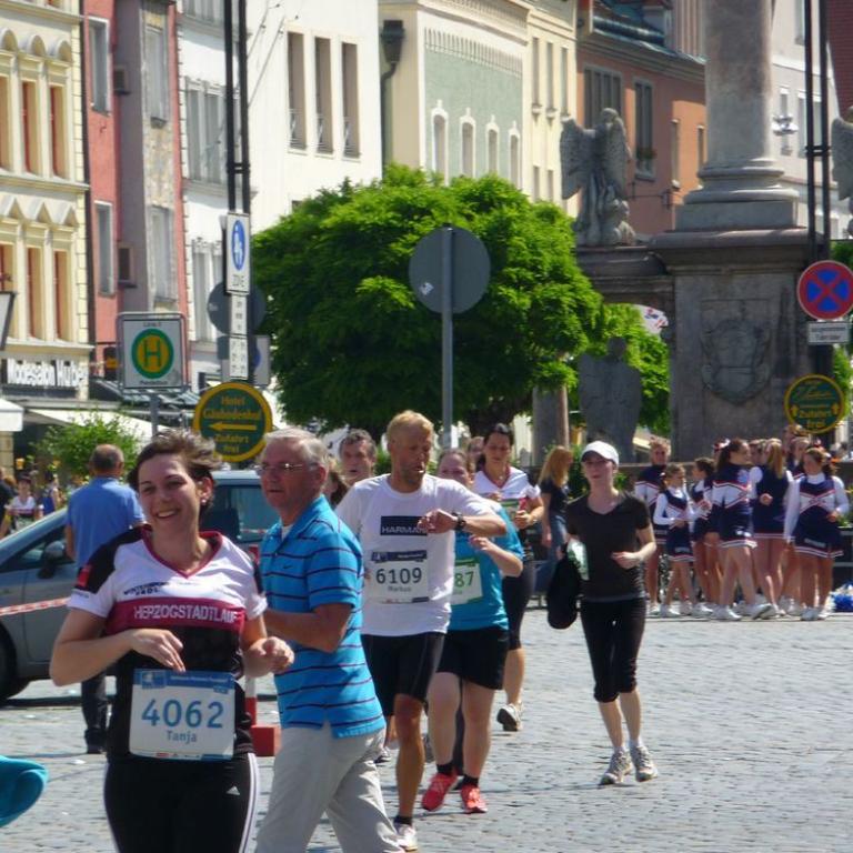 Von Mittwoch bis Samstag war ich mit Laufstilanalyse.de im Trainingslager in Bad Kötzting. 3 Schwimmkilometer, knapp 400 Radkilometer mit ca. 7000 Höhenmetern und 3 Bergläufen auf den Kaitersberger Kreuzfelsen steckten in den Füßen. Aber ich hatte zugesagt bei einer Harman Staffel (Harman&Friends) auf der 10 Kilometer Strecke zu starten, also fuhr ich mit Brigitte zur Unterstützung und schweren Beinen am Sonntag nach Straubing. Um halb 10 Uhr trafen wir uns mit den anderen Harmanläufern zum Fototermin. Um 10 Uhr stand ich dann am Start des 3. Herzogstadtlaufes mit über 3000 weiteren Läufern und Nordic Walkern (HM, 10 km, 5 km). Ich schaffte es in die vordersten Reihen mit den ganzen Hochkarätern und wartete auf den Startschuss. Und los ging es Richtung Tierpark. Ich versuchte so gut es ging an der Spitze dran zu bleiben, aber der Schnurrenberger Sebastian und ein paar weitere legten ein Tempo vor, dem ich nicht folgen konnte. Schon die erste Steigung machte mir extrem zu schaffen und ich merkte die fehlende Energie. Die Führungsgruppe machte sich aus dem Staub und ich folgte mit drei weiteren Läufern. Der Abstand wurde immer größer. Wir liefen zuerst durch die Fußgängerzone und dann weiter Richtung Straubinger Osten. Meine Uhr zeigte erst 5 km an und ich war fix und fertig. Ich wurde dann von der späteren Halbmarathon Siegerin Fischl Tina und vom Halbmarathon 5. Hermann Schmaderer überholt. Das spornte mich wieder an und ich blieb ihnen auf den Fersen. Es ging dann wieder ziemlich verwinkelt in Richtung Eisstadion. Ich hatte noch 1 1/2 Kilometer und die konnte ich nur noch mit Kampf die letzten Steigungen meistern. Die letzten Meter sprintete ich über den Stadtplatz und ich überholte ein paar 5 Kilometer Läufer. Auf der Zielgeraden gab ich nochmal alles und schaffte tatsächlich noch eine Zeit von 37:59 Minuten. Gesamt holte ich mir den 6. Platz, was mich aber am meisten freute, war der Staffelgesamtsieg mit der Harman&Friends Staffel. Jeder gab alles und zusammen erreichten wir eine Zeit von 2:55:32 h und waren somit knappe 26 Sekunden schneller als die 2. platzierte Mannschaft. Respekt an meine drei Mitstreiter. Die gewonnen Biermarkerl und Hendlmarkerl hatten wir uns verdient :-)