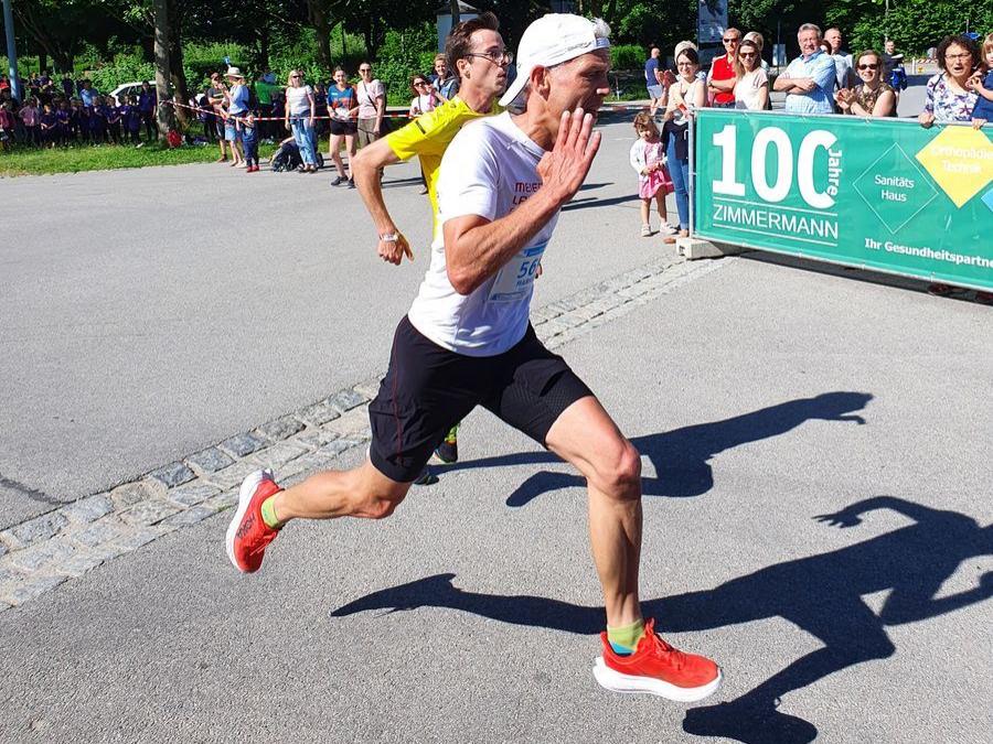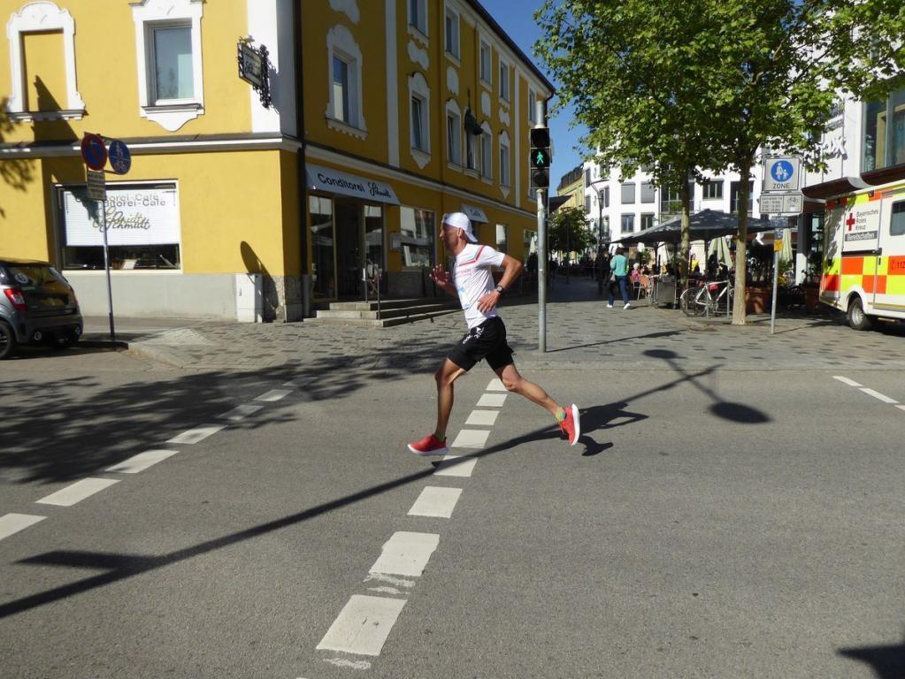 Vor dem Eisstadion ging es nach rechts und an den Schrebergärten vorbei. Ich lief am Anschlag mit einer 3:30 min/km Pace. Dann kam eine leichte Steigung in Richtung Theresiencenter. Die 5 Führenden konnten sich leicht absetzten. Hinter mir hörte ich schon zwei Konkurrenten schnaufen. Auf der Bahnhofsstraße holten mich die beiden ein. Frank bot mir an, im Windschatten mitzulaufen, was ich dankend annahm. Im Dreierteam liefen wir über den Stadtplatz und weiter zur "Persiluhr". Entlang des Allachbaches musste ich leider abreißen lassen. Nach ca. 7 Kilometer war bei mir der Ofen aus. Naja nicht ganz. Ein weiterer Läufer überholte mich und das schmeckte mir so ganz und gar nicht. Ich mobilisierte alle meine Kräfte und blieb an ihm dran. Wir liefen über den Stadtplatz, ab wo der letzte Kilometer in Richtung Hagen auf uns wartete. Jetzt hieß es alles oder nichts. Beim Zielsprint explodierten meine Füße und ich konnte den 21 Jahre jüngeren Gegner um einen Schritt hinter mir lassen.