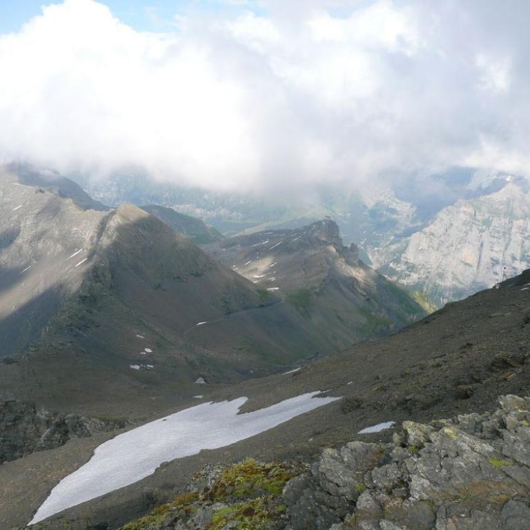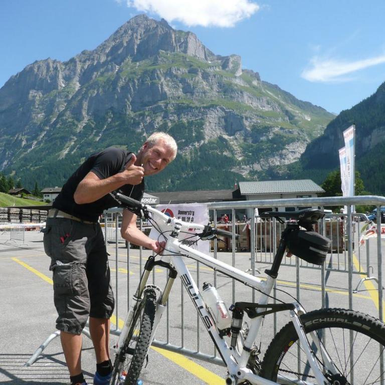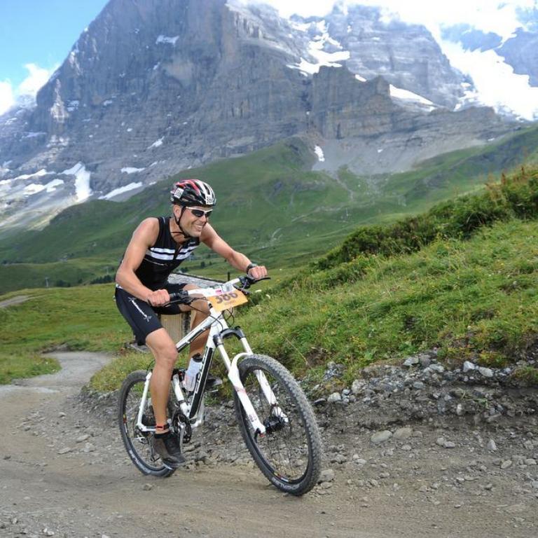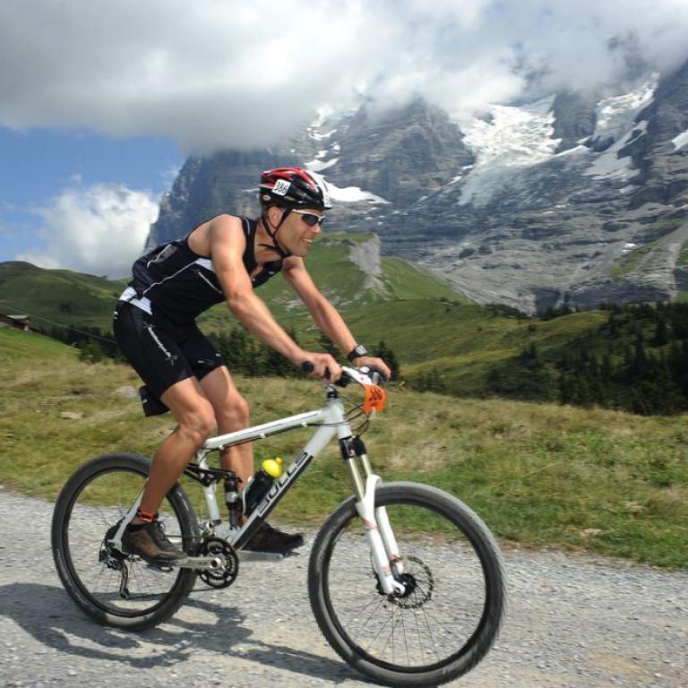 Zuerst musste ich ein paar hundert Meter auf einem Trail fahren, bevor es sofort steil nach oben ging. Meine Füße waren Matsch. Ich hatte nur noch den Gedanken ans aufhören. Ich strampelte trotzdem weiter nach oben. Die Bergkulisse ist gigantisch, aber zu dem Zeitpunkt konnte ich nichts damit anfangen. Auch auf dem Mountainbike wurde ich immer wieder überholt und in der Platzierung durchgereicht. Das Ziel kleine Scheidegg auf 2100 Metern war unendlich weit weg. Zuerst fuhren wir noch auf Teerstraße und dann Schotter, was mir noch schwerer fiel. Nach gefühlten 100 Stunden biken nach oben fuhr ich wieder auf Fritz auf. Auch er hatte große Probleme und wir beschlossen nicht mehr auf die Laufstrecke zu gehen. Wir waren beide einfach zu kaputt, aber erstmal mussten wir auf die kleine Scheidegg gelangen. Dann sahen wir die Passhöhe. Die letzten 200 Höhenmeter schoben fast alle, da es einfach zu steil war. Oben trank ich erstmal und aß etwas in der Verpflegungsstation. Von nun ging es zuerst einen Forstweg nach unten. Alleine das Bremsen war anstrengend. Nach 1000 Höhenmetern bergab ging es einen schmalen Trail in den Wald, noch steiler nach unten. Ich kam ins rutschen, bremste mit der Vorderradbremse und schon machte ich einen Salto vorwärts. Scheiße dachte ich, jetzt ist Schluß, ich mag nicht mehr. Trotzdem stieg ich, nur mit ein paar Kratzern, wieder aufs Bike und fuhr bis ins Tal. Wir mussten dann noch 5 Kilometer auf der Straße bis nach Stechelberg zur letzten Wechselzone. Ich benötigte bei diesem Part für 30 km 1200 Höhenmeter 2 Stunden 59 Minuten. Hier kam kurz hinter mir auch Fritz an. Na gut auf die Laufstrecke gehen wir noch, aber in Mürren wollte ich aussteigen...