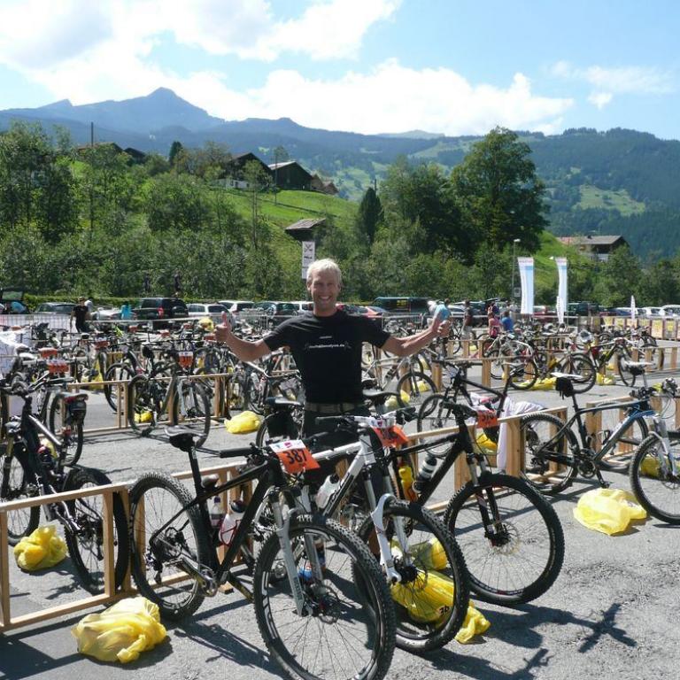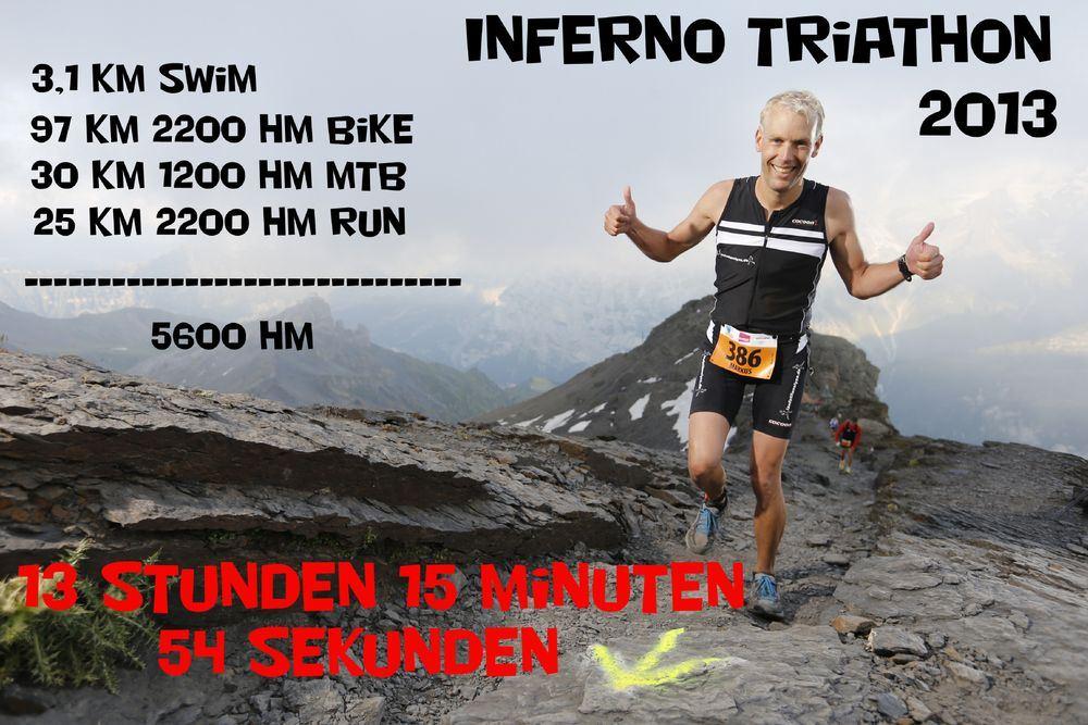 Inferno - mein bisher härtester Wettkampf: 3,1 km Swim, 97 km 2200 Hm Bike, 30 km 1200 Hm MTB, 25 km 2200 Hm Run mit Ziel Schildhorn auf 2970 m in 13 Stunden und 15 Minuten. Als ich mich letztes Jahr für dieses Event angemeldet hatte, wusste ich nicht so recht was auf mich zukommen würde. Ich kann schon mal vorab sagen, es gab noch nie ein Event bei dem ich so häufig ans Austeigen gedacht hatte. Aber nun mal von vorne. Am Mittwoch Nachmittag ging ich von der Arbeit raus und merkte ein leichtes kratzen im Hals, was mich noch nicht beunruhigte. Als ich dann am Donnerstag früh schweißgebadet und verschnupft aufwachte, rechnete ich schon fest mit einem Nichtantritt. Ich hielt mich an diesem Tag ziemlich ruhig und wartete auf die Nacht. Freitag um halb 6 Uhr klingelte der Wecker. Es ging mir so lala, aber ich entschied das wir als erstes die Reise in die Schweiz antraten. Brigitte fuhr die gesamten 600 km bis zum Thuner See in den Berner Alpen. Unser erstes Ziel war Oberhofen, wo die Wechselzone fürs Roadbike war. Hier gab ich mein Tribike ab (großer Fehler: bei insgesamt 2200 Hm mit teilweise 15 % Steigung wäre ein Rennrad angesagt gewesen). Bei herrlichem Wetter fuhren wir weiter bis nach Grindelwald, wo ich dann mein Mountainbike deponieren konnte. Hier hatten wir schon eine wahnsinns Aussicht auf die Jungfrau, Mönch und Eiger. Als letzes fuhren wir dann nach Stechelberg, wo ich meinen Runbeutel abgeben konnte. Langsam wurde mir immer mehr bewusst, was dieses Event bedeutet. Es wird hart werden. Zum Einen war ich gesundheitlich angeschlagen, der Ironman Ende Juni steckte sicherlich noch in den Füßen und in den letzten Wochen konnte ich fast nicht mit dem Rad trainieren, da wir ja 2 Wochen auf Hochzeitsreise waren und ich dort nicht die Lust und Möglichkeit hatte und auch die anstrengende Olpererbesteigung letzten Sonntag war sicher auch nicht optimal. Mittlerweile war es schon 16 Uhr, als wir im super schönem Hostel von Lauterbrunnen ankamen. Fritz und Westy mit ihren Mädels waren ja schon einen Tag vorher angereist. Am Abend fuhren wir dann alle zusammen mit der Seilbahn nach Mürren, ein autofreies Bergdorf oberhalb von Stechelberg. Hier fand im Sportzentrum die Pastaparty und Wettkampfbesprechung statt. Uns wurde nochmals der gesamte Ablauf erklärt. Die Wassertemperatur betrug 17 Grad, das Wetter sollte schön werden mit bis zu knapp 30 Grad, nur Abends könnten Gewitter auftreten. Insgesamt waren knapp 400 Teilnehmer und innen am Start. So viele Verrückte auf einen Haufen....