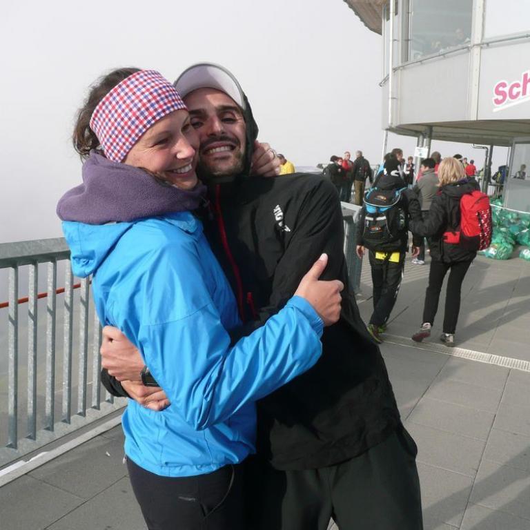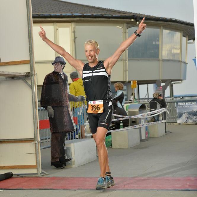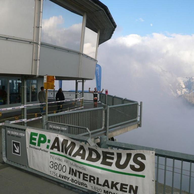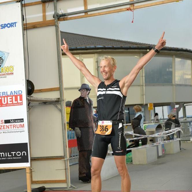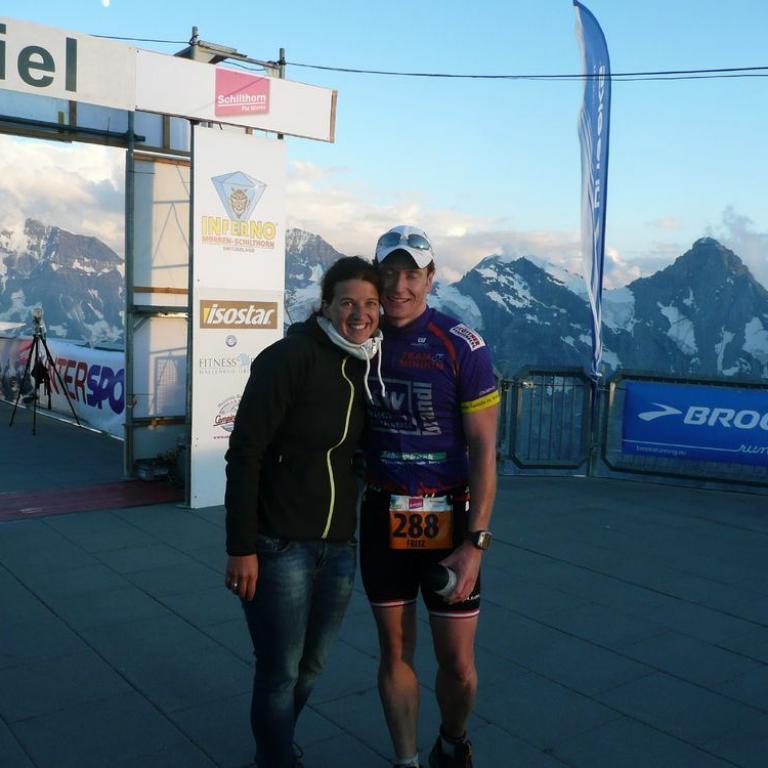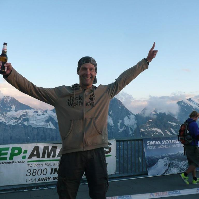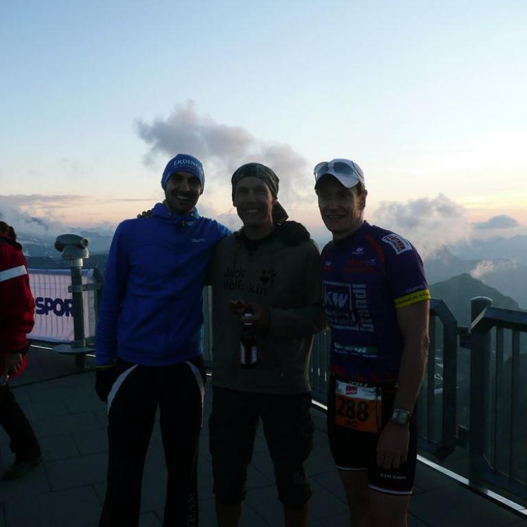 Raus aus der Wechselzone und ab auf die Laufstrecke. Unsere Mädels müssten ja auch schon langsam auf dem 2970 m hohen Schildhorn eingetroffen sein. Sie wollten nach dem Frühstück loswandern und uns im Ziel auf dem Gipfel empfangen. Mich trennten also nur noch 2200 Höhenmeter und 25 Kilometer vom Ziel und Brigitte. Mit Matschbeinen lief ich dann los. Die ersten 5 Kilometer bis nach Lauterbrunnen waren flach und ich konnte einen 5 er Schnitt halten. In Lauterbrunnen ging es dann gleich mal steil nach oben und es war nur noch zügiges gehen möglich. Mein erstes Ziel war das auf 1600 Metern gelegene Mürren. Hier nahm ich mir fest vor auszusteigen. Ich quälte mich, kämpfte, schrie mich selbst an und erreichte nach insgesamt über 11 Stunden das Sportzentrum. Kurz vor Mürren war es wieder etwas flacher und ich konnte wieder Laufen, so weit man einen 8 er Schnitt Laufen bezeichnen konnte. In Mürren wurde von einem Moderator und vielen vielen Zuschauern angefeuert, was mich wieder motivierte. Ich schaute auf die Uhr. Es war 17:40 Uhr. Die Cut Off Zeit war bei 20:30 Uhr. Ich hatte noch 8 Kilometer und 1400 Höhenmeter vor mir. Es sollte aber zu schaffen sein. Ich dachte mir, scheiß auf alle, ich zieh das jetzt durch, ich komme auf diesen blöden Gipfel und wenn es das letzte ist, was ich tue. Gesagt getan ich quälte mich weiter. An Laufen war bei dieser Steigung nicht mehr zu denken. Kampf war angesagt. Extremer Kampf mit mir selbst und dem Berg. Ich sah wie sich auch alle anderen Athleten auf der Strecke quälten. Irgendwann kam ich dann zur Schilthornhütte auf 2500 m. Ich war restlos am Ende. Immer wieder hatte ich Schwindelanfälle. Ich konnte mich kaum noch auf den Füßen halten, trotzdem kämpfte ich mich weiter nach oben. Mit Cola, Caros Pampe und Salztabletten versuchte ich den körperlichen Verfall zu verlangsamen. Um ca. 19 Uhr sah ich dann den Gipfel vor mir. Steile Felsen und unendliche Höhenmeter musste ich noch überwinden, aber er kam näher. Langsam wurde mir klar. Ich komme vor der Cut Off Zeit ins Ziel. Die letzten 200 Höhenmeter musste ich teilweise über Felsen klettern. Immer wieder hielt ich an, da mir schwindlig war und ich kaum noch vorwärts kam. Auf einmal stand ich kurz vor dem Gipfel (2970 m) mit seiner riesen Aussichtsplattform und Restaurant und ich war wieder voll da. Mir erhobenen Armen lief ich durchs Ziel und freute mich unendlich Brigitte zu sehen und dieses wahnsinns Event geschafft zu haben. Insgesamt benötigte ich 13 Stunden, 15 Minuten und 54 Sekunden, d.h. 45 Minuten vor der Cut Off Zeit kam ich ins Ziel. Ich wurde Gesamt 201. und schaffte in der Altersklasse den 96. Platz. Westy schaffte das Event sensationell mit 10 Stunden und 58 Minuten und Fritz kam knapp nach mir ins Ziel. Aber die Zeit ist bei solch einem Event zweitrangig. Jeder Finisher ist ein Sieger. Im Ziel spielten sich noch Dramen ab. Athleten kippten um, benötigten Infusionen und übergaben sich in der Seilbahn. Einfach nur krass...
