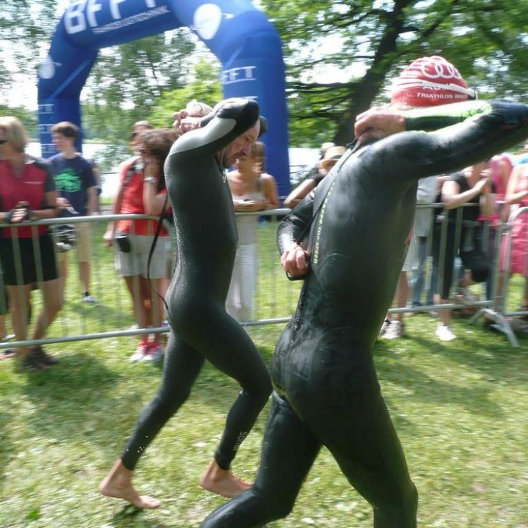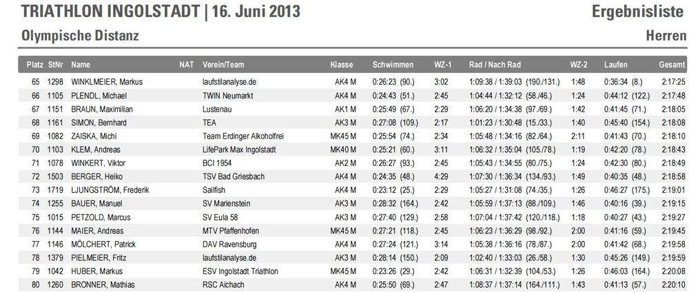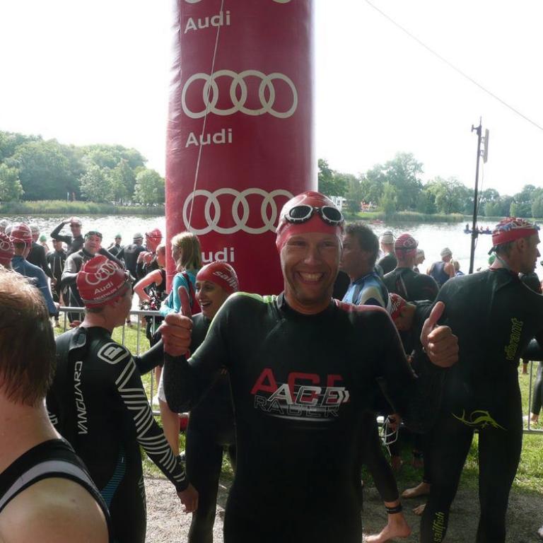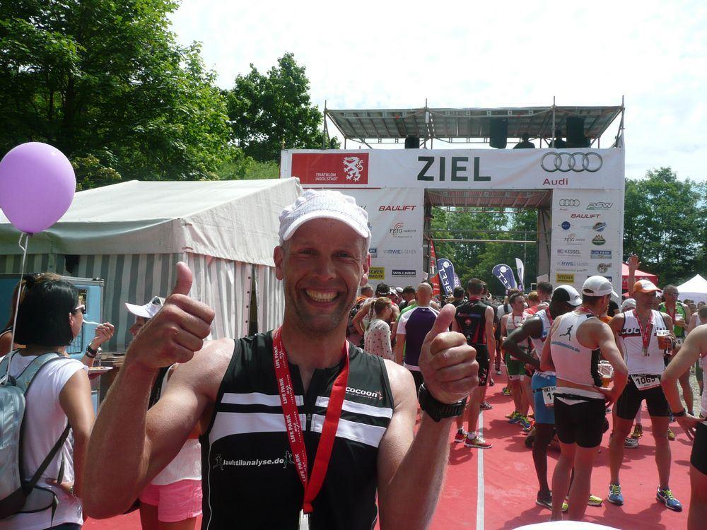 In Ingolstadt startete ich über die Olympische Distanz, als letzter Test für den Ironman in 2 Wochen. Früh aufstehen war leider angesagt. So richtig ausgeschlafen hatte ich um viertel nach 4 nicht. Auch eine kleine Vorbelastung steckte noch vom Tag davor in den Füßen, knapp 100 km Rad und im Anschluß 10 km Lauf, aber es sollte ja nur ein Test sein. Insgesamt waren 2500 Teilnehmer und auch viele Profis bei dem Event am Start (Mitteldistanz, Kurz und Sprintdistanz). Die meisten der Laufstilanalyseathleten, einschließlich unserem Coach Ralf (holte sich einen sensationellen 3. Gesamtplatz) wollten ebenfalls die Olympische Distanz meistern. Brigitte war natürlich wieder als große Unterstützung an der Strecke mit dabei. Nach dem Radeinchecken, hatten wir noch einiges an Zeit, aber auch die verging wie im Flug. Schon hatte ich meinen Neo an und stand in der 2. Startwelle mit Fritz, Wolfi, Christoph, Randy, Mane, Falti, Alex, Eva, Silvia und noch einigen weiteren Laufstilanalyseathleten. Startschuß und Go. Es war ein gewaltiges Gehaue, aber irgendwie fand ich eine gute Linie und konnte viel im Wasserschatten schwimmen. Ich fühlte mich richtig gut im Wasser und konnte noch einen Zahn zulegen, was eher ungewohnt bei mir war. Deshalb kam ich auch schon nach 26:23 min aus dem Wasser. Der Wechsel dauerte wie immer sehr lange (das muss ich üben). Am Rad hatte ich anfangs Probleme, aber ich bekam nach und nach lockere Füße. Wie immer auf dem Rad wurde ich überholt, aber es hielt sich in Grenzen. Die 40 Kilometer schaffte ich in 1:09:38 in einem 34,1 Schnitt, was für mich schon eine Leistung war. Den Wechsel zum Lauf schaffte ich etwas schneller. Ich merkte sofort, das ich heute Gas geben konnte und das machte ich auch. Mit einer 3:48 Pace lief ich die knapp 10 Kilometer in einer super Zeit von 36:34, was natürlich mega Spaß machte, da ich ja nur am Überholen war. Belohnt wurde ich mit einer Gesamtzeit von 2h 17min 25 sec, was wieder einen neuen persönlicher Rekord auf der Kurzdistanz bedeutete. Insgesamt wurde ich 65. von 411 bei den Herren und in meiner Altersklasse holte ich mir den 11. Platz von 61. Was mich ebenfalls noch sehr positiv stimmte, waren die frischen Beine und die top Laufperformance. Ironman Klagenfurt kann kommen :-)