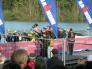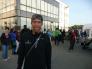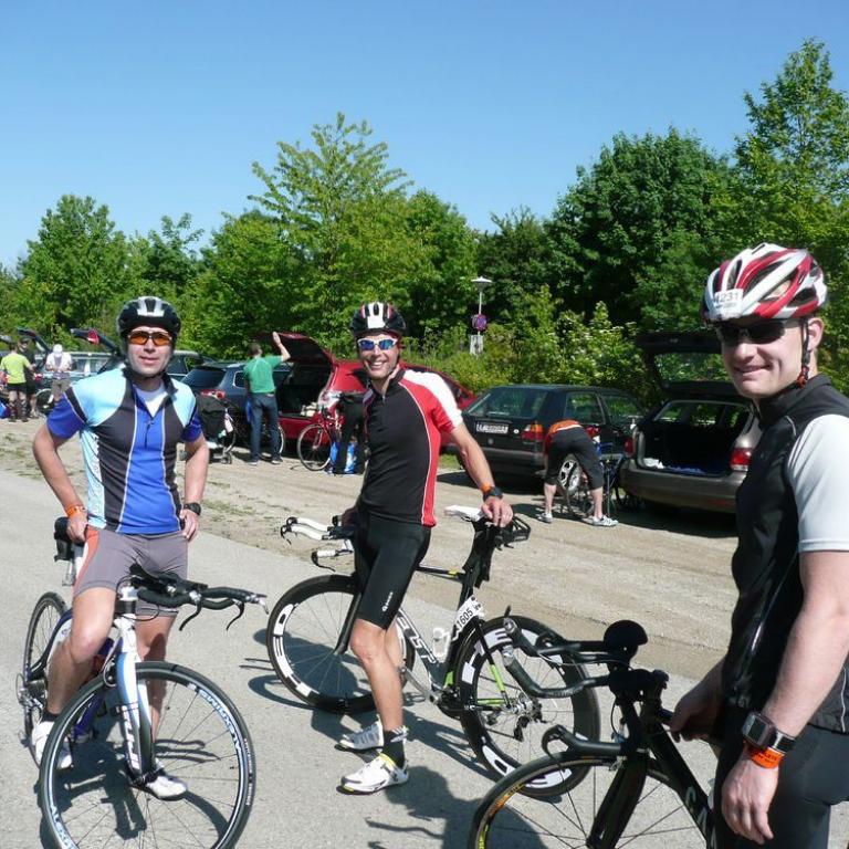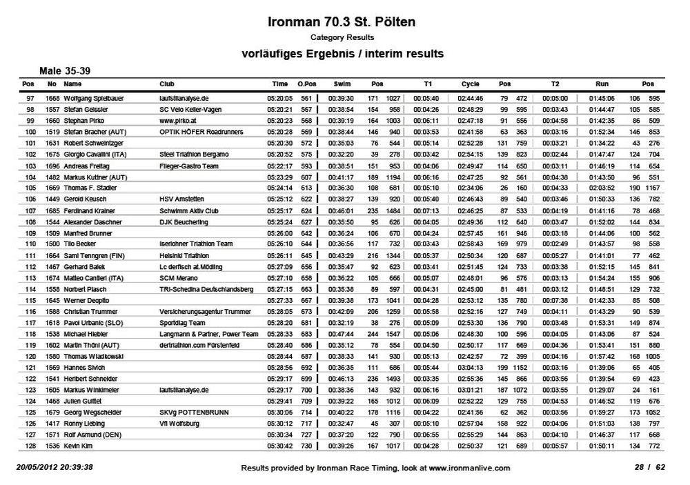 Die unglückliche Bayernniederlage am Tag zuvor, war um 4 Uhr morgens, als der Wecker klingelte, schnell vergessen. Ich richtetet meine Wettkampfsachen her, bevor wir zum gemeinsamen Frühstück gingen. Um kurz nach 5 Uhr fuhren wir zur Eventarena. Ein letztes Mal gingen wir in die Wechselzone, kontrollierten den Reifendruck und überprüften nochmals die Wechselbeutel. Im Anschluß marschierten wir zum ersten See, wo auch der Start erfolgen wird. Geschwommen wurde in 2 Seen, das heißt dazwischen mussten wir ca. 300 Meter am Land mit Neopren laufen, bevor wir in den 2. See springen konnten. Es wurde in verschiedenen Wellen, nach Altersklasse, Profis und Geschlecht aufgeteilt. Um 7 Uhr starteten die Profis mit riesigem Beifall. Meine Altersklasse war um 7.55 Uhr an der Reihe. Langsam wurde ich nervös. Brigitte wünschte mir noch viel Glück und Spaß. Mit mir war auch Ralf, Wolfi, Tobi und Frank am Start. 5 Minuten vorher durften wir ins eisige Wasser. Bis ich mich versah fiel auch schon der Startschuß. Am Anfang gab es einige Kämpfe incl. Schläge bis sich das Feld etwas auseinander zog. Nur an den Markierungsbojen gab es wieder einige Kämpfe. Ich schwomm im Mittelfeld sehr ruhig mein Tempo. Nach 1000 Metern mussten wir aus dem Wasser, über eine Brücke laufen und in den nächsten See wieder rein. Auch hier machte das Schwimmen richtig Spaß, weil ich ganz gut vorwärts kam. Wenn man bedenkt wie schlecht ich vor einem halben Jahr geschwommen bin, war ich sehr zufrieden mit meiner Schwimmzeit von 38 Minuten. Nach weiteren 900 Metern ging es wieder raus aus dem Wasser und in Richtung Wechselzone. Ich griff mir meinen Bike-Wechselbeutel und ab ging es ins Zelt. Hier zog ich den Neo aus, rein in die Radschuhe, Helm auf, Socken an und weiter zum Rad. Schon war ich auf der 90 Kilometer Radstrecke und registrierte mein erstes Problem. Ich hatte meine Radbrille im Wechselbeutel vergessen. Hoffentlich tränen meine Augen nicht und auch die Fliegen und Mücken waren nicht ohne. Aber es half nichts. Zuerst fuhren wir auf ein 20 Kilometer Autobahnstück. Auf der Geraden hatte ich wie immer Probleme mit der Geschwindigkeit. ich konnte nur mit ca. 33 Km/h fahren und wurde ganz schön häufig überholt. Erst beim ersten Berg mit ca. 200 Höhenmeter konnte ich überholen. Die Strecke führte uns an der Donau entlang. Nach ca. 50 kilometer musste ich dringend auf die Toilette und mir blieb nichts anderes übrig und anzuhalten. Dann konnte ich wieder erleichtert weiter fahren :-) Nach ca. 60 Kilometer kam ein 8 km langer Anstieg nach Gansbach. Viele kämpften gewaltig, den Berg hoch zu kommen. ich tat mich relativ leicht und war nur am Überholen. Dann ging es lange bergab und ich brachte sogar einen Höchstgeschwindigkeit von 68 km/h zusammen. Noch einmal ging es nach der rasanten Abfahrt kurz nach oben, bevor ich auch schon wieder in der Wechselzone nach 90 Kilometer und 3 Stunden ankam. Zuerst stellt ich mein Rad ab und lief zum Wechselbeutel, zog meine Laufschuhe an, Käppi auf und ab ging es auf die Laufstrecke, die uns zuerst durch die Eventarena führte und dann auf 2 Runden teilweise einen Damm entlang. ich fühlte mich sehr gut und konnte zuerst auch einen 4 er Schnitt halten. Bei ca. 7 oder 8 Kilometer brach ich immer mehr ein und lief teilweise nur noch mit einem 5 er Schnitt. Trotzdem war ich nur am Überholen, was sehr viel Spaß machte. Bei ca. 17 Kilometer konnte ich nochmals richtig Gas geben und freute mich schon auf den Zieleinlauf und dann kam mein 2. Problem. Der Zieleinlauf war sehr schlecht beschrieben und eigentlich sollte der Läufer noch auf eine 1 Kilometer extra Runde durch die Arena. Diese letzte Runde versäumte ich irgendwie und bog gleich in den Zielkanal ein. Bis ich mich im Eifer des Gefechtes versah, war ich auch schon durch das Ziel hindurch und mir wurde eine Medaille verliehen. Mir war sofort klar, das ich den letzten Kilometer nicht gelaufen war und was dies bedeutete. Disqualfikiation. Ich war so sehr angefressen und verärgert über mich selbst und über den Veranstalter, das ich mich zuerst überhaupt nicht über den geschafften Ironman 70.3 freuen konnte. Leider bekam dies auch Brigitte ab. Mittlerweile waren alle Laufstilanalyseathleten im Ziel und auch 4 anderen ging es so wie mir. Positiv war, das ich mit meiner Zeit sehr zufrieden war und relativ fit aus dem Wettkampf ging. Wir holten noch das Finsher Shirt und tranken alkoholfreies Bier. Am Abend bei der Siegerehrung wurde bekannt gegeben, das 200 weitere Athleten falsch liefen und keiner Disqualifiziert wurde. Jeder bekam eine Zeitstrafe von 10 Minuten, womit ich natürlich sehr gut leben konnte. Damit war der Tag und Abend gerettet und wir konnten zu feiern beginnen. Mein erster Ironman 70.3 ging doch noch gut zu Ende und wir begossen das Ergebnis mit einem gutem Hauswein im Hotel.