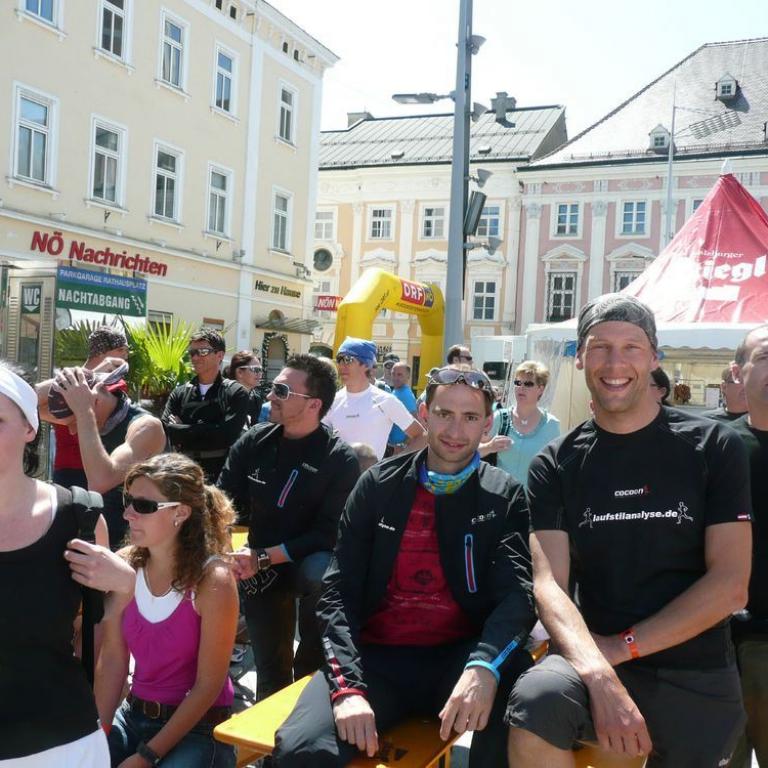 Am 17. Mai fuhren über 20 Athleten der Laufstilanalyse teilweise mit Partner und Familie nach St. Pölten um den Ironman 70.3 zu finishen. Zuerst holten Brigitte und ich die Startunterlagen im Rathaus von St. Pölten. Hier war schon ziemlich was geboten mit großer Sportmesse und vielem mehr. Nach dem Bezug unseres Zimmers im Hotel Walther in der Ortschaft Wilhelmsburg (10 km von St. Pölten entfernt) stand um 16 Uhr gleich Radtraining auf dem Programm. Knapp über 2 Stunden radelten wir teilweise auch auf der Ironmanstrecke. Am Abend gab es noch ein gemütliches Abendessen im Hotel.