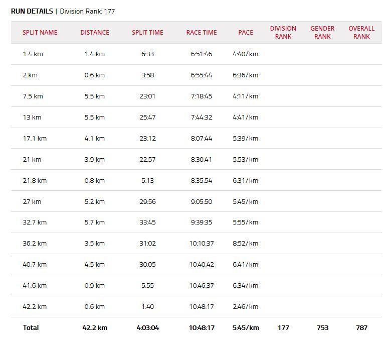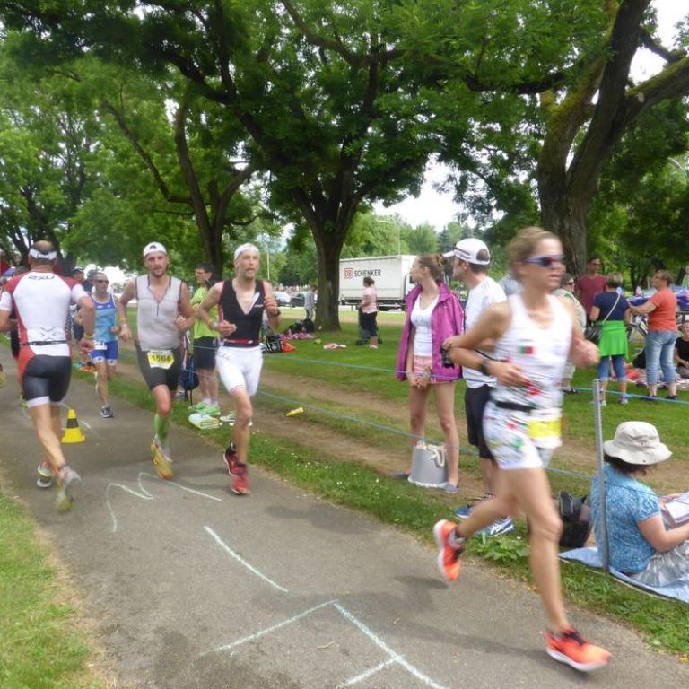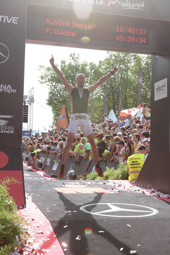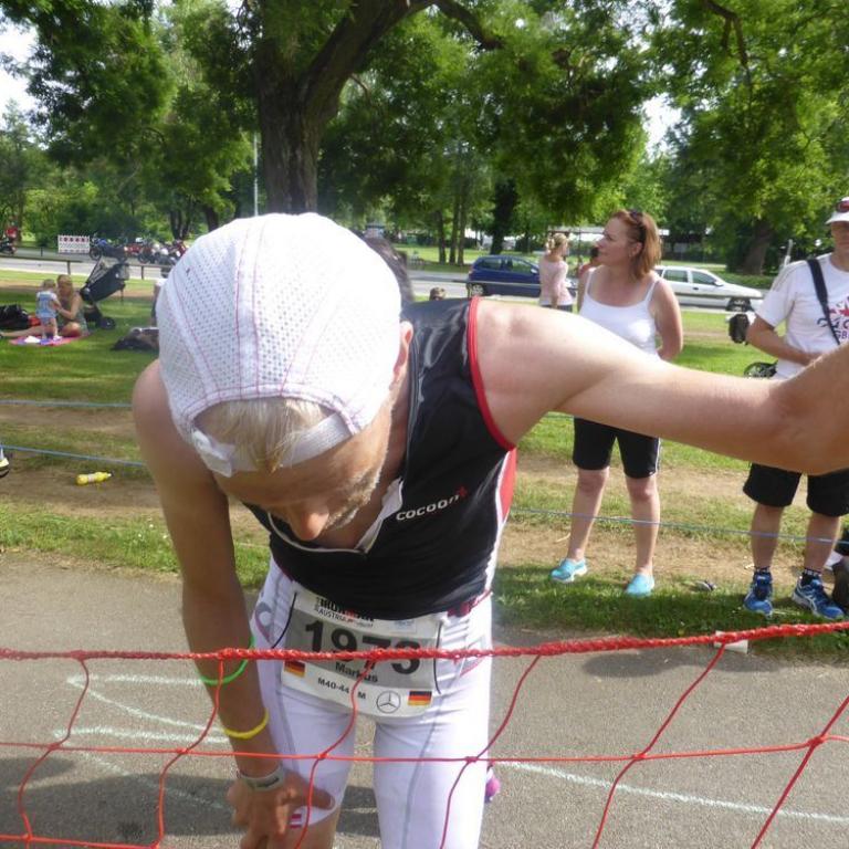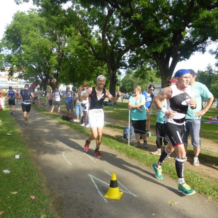 Diesmal stellte ich mich nicht so blöd beim Wechsel an. Ich fand sofort meinen Platz fürs Rad und auch meinen Wechselbeutel. Nach 3:58 Minuten war ich auf der Laufstecke. Die Zuschauer klatschten frenetisch Beifall, was natürlich riesig Spaß machte. Ich war noch im Soll. Ich dürfte 3h 19 min für den Marathon brauchen um die Sub 10 zu schaffen. Das sollte möglich sein. Ich lief mit einem 4:15 er Schnitt los. Meine Hüfte schmerzte, aber nach ca. 3 Kilometer ließ der Schmerz nach und war auch bis zum Ende des Wettkampfes kein Problem mehr. Ich fühlte mich klasse, meine Füße waren frisch und nach 10 Kilometer hatte ich einen 4:11 Schnitt stehen. Hier kam ich vorbei an Brigitte und Emma, die ein feuchtes Bussi bekam :-) Leider fing mein Magen zu rumoren an. Ich hatte schon Angst das sich ein Häufchen selbstständig machen könnte. Da war meine weiße Wettkampfhose nicht gerade von Vorteil. Bei Kilometer 14 musste ich ein Dixi aufsuchen. Hier musste ich zuerst warten bis ich rein durfte, aber es half leider nichts. So kann man Zeit vergeuden. Ich lief weiter aber es lief nicht mehr rund. Bei Kilometer 17 oder 18 kam er dann, der Mann mit dem Dampfhammer. Er zog so richtig durch und traf mich mit voller Wucht. Ab da war ich einfach nur leer. Ich brachte nichts mehr in mich rein, kein Geel, Cola oder eßbares. Nur Wasser ging schluckweise. Mir war sofort klar, das ich die Sub 10 knicken konnte. Nach 21 Kilometer und schon einigen Gehpausen, war auch die persönliche Bestzeit in Gefahr. Ich quälte mich von Kilometer zu Kilometer. Im nachhinein kann man das schlecht beschreiben. Eigentlich will man aufhören, denkt an nie wieder, aber trotzdem quält man sich weiter. Viele weitere Athleten hatten ähnliche Probleme. Zum 2. Mal kam ich an meinen Mäusen vorbei, die versuchten mich zu motivieren. Zu dem Zeitpunkt war auch meine persönliche Bestzeit schon abgeschrieben. Jetzt hieß es nur noch das ganze ins Ziel zu bringen. Die letzten 5 Kilometer taten so richtig weh. Ich brachte keinen Fuß mehr nach dem anderen. Ich hatte keine Kraft mehr. Winkl wankte aber fiel nicht. Es war ein Kampf mit mir selbst. Beim Film Das Leben des Brian hieß es "Jeder nur ein Kreuz". Ich hatte 10 Kreuze bekommen :-) Ich schleppt mich vorwärts. Wenn ich mal gelaufen bin, dann nur einen 6 er Schnitt. Endlich kam der letzte Kilometer. Nochmal vorbei an Emma und Brigitte und rein in die Zielgerade. Ich war so kaputt, mir war Schwindlig, der Magen rebellierte, aber im Zielbogen schaffte ich tatsächlich noch einen Winkl X-Jump nach 3,8 km Swim, 180 km Bike, 42,2 km Run und 10h 48 min 17 Sekunden. Endlich stehen bleiben und hinsitzen. Nach einem Bier, einer Dusche und einer Kleinigkeit zum Essen sah die Welt schon wieder viel besser aus :-) Ich war froh meine Mäuse zu sehen und in den Arm zu nehmen...
