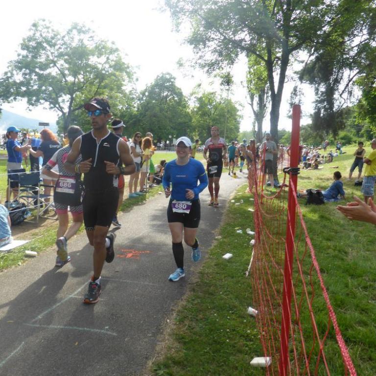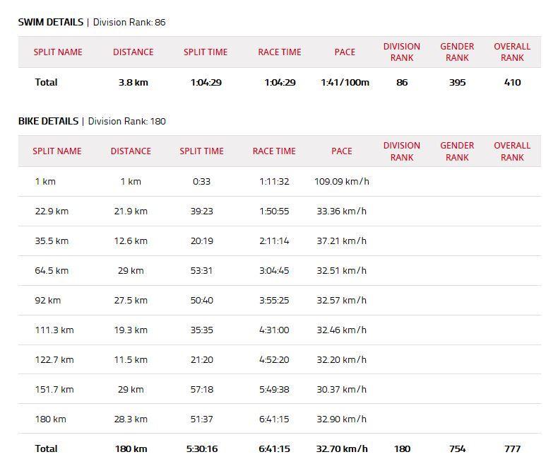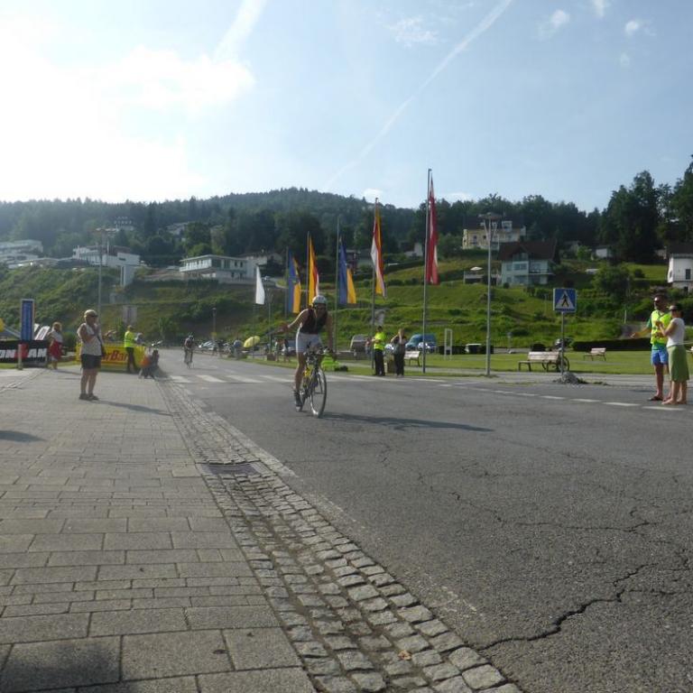 Ich lief vorbei an den vielen Zuschauern bis zur Wechselzone und schnappte mir den Bikewechselbeutel. Sofort beim Öffnen stellte ich fest, das dies nicht meine Sachen waren. Himmel noch mal was soll das. Ich schaute auf die Nummer am Beutel und sah 1974. Ich hatte doch 1973. Irgendwie brachte ich meine Startnummer mit meinem Geburtsjahr durcheinander. Also wieder zurück, richtigen Beutel greifen und rein ins Wechselzelt.Beim Laufen merkt ich leider meine Hüfte, aber es ging. Zuerst mal schauen das ich den Radpart überlebe. Immer eines nach dem Anderen. Schnell hatte ich den Neo herunten, Helm auf und Schuhe an und weiter lief ich zum Bike. Ich hatte mir gestern noch extra die Position eingeprägt. Nach dem Dixi links und wo lief ich heute hin? Vor dem Dixi links. Ich konnte mich in den Arsch beißen als ich bei der Nummer 1473 stand und das auch nicht mein Rad war. Also weiter in die richtige Reihe. Hier fand ich dann mein Rad brachte es aber nicht aus der Halterung und musste deshalb nochmals auf die andere Seite. Und um noch einen drauf zu setzen lief ich nach rechts anstatt links und das bdeutete wieder ein kleiner Umweg. Trotzdem schaffte ich den Wechsel doch irgendwie in 6:30 Minuten :-) Endlich war ich auf der Radstrecke. Zuerst vorbei an vielen, vielen Zuschauern und dann am Westufer des Wörthersses entlang in Richtung Reifnitz, wo mich Brigitte und Emma schon empfingen. Meine Körper musste sich nach dem Schwimmen erst an die Aeroposition auf dem Rad gewöhnen. Leider merkte ich meinen Hals, als ob was festhängen würde. Das Schlucken tat einfach weh. Ich drückte zum Faaker See hoch und auch der steile Rupertiberg ging ganz gut. Viele fuhren Windschatten, aber ich hielt mich immer mit etwas Abstand zurück. Nach knapp über 2 h 40 min hatte ich auch schon die ersten 90 Kilometer hinter mir. Und ab ging es in die 2. Runde. Aero war jetzt nicht mehr so leicht, da sich mein Genick langsam verspannte. Ein Gruppe von ungefähr 20 Personen überholten mich und ich setzte mich hinten mit Abstand dran. Kurz vor dem Faaker See fing es dann stark zu regnen an. Im Hintergrund hörte man es Donnern. Na toll, als ob das ganze nicht eh schon anstrengend genug wäre. Bergauf schwitzte ich und bergab fror ich, da ich ja pitschnass war. Endlich war ich zum 2. Mal am Rupertiberg angekommen.Den 10 Prozenter schaffte ich nochmals und ab hier konnte ich es laufen lassen. Nach 5:30:16 und einem 32,7 er Schnitt gelangte ich in die Wechselzone. Pünktlich hörte es auch zu regnen auf.