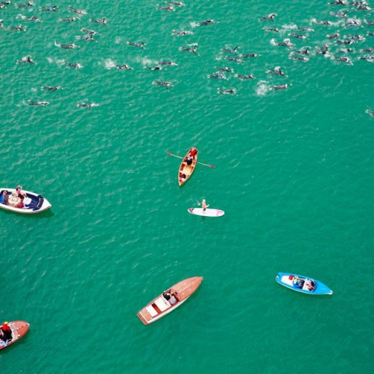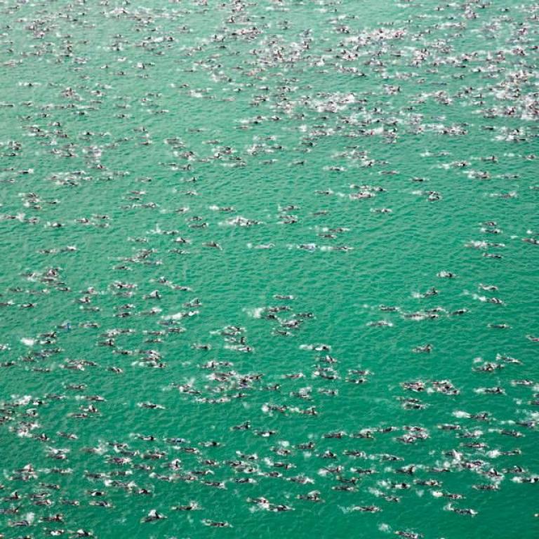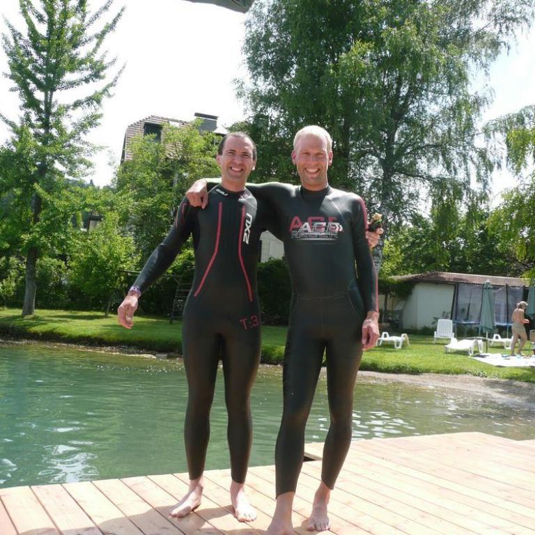 Um dreiviertel 4 klingelte der Wecker. Ich war sofort hellwach. Winklworld in Action war angesagt. Dies war wieder so ein Tag: Lebe deine Träume !!!! Zum Frühstück gab es Semmel mit Honig. Im Convoy fuhren wir von unserem Hotel Sille am Südufer des Wörthersees nach Klagenfurt. Zuerst überprüften wir nochmals unser Rad, wie auch 3000 weitere Teilnehmer des Ironman Austria. Langsam kam bei mir die Nervosität. Langsam marschierten wir Richtung Schwimmstart. Tausende Zuschauer, Angehörige und natürlich die Athleten versammelten sich um den Start. Kaum hatte ich den Neopren an pflügte die erste Startwelle mit den Profis plus 400 Amateure durch den See. Wir kämpften uns dann ebenfalls an den Start. Mane und ich standen in der 3. Reihe. 7 Uhr, 2600 Athleten, Tausende Zuschauer, ein lauter Krach, stimmt der Startschuß und los liefen wir in den Wörthersee. Am Anfang war es ein Gehaue und Gedränge, was sich aber langsam entzerrte. Leider beschlug mir die Brille, so das ich fast nichts mehr sah. Großartig aus konnte ich bei der Teilnehmeranzahl eh nicht. Erste Boje, irgendwie flutschte das Schwimmen, 2. Boje, weiter Richtung Südufer, 3. Boje und schon schwammen die Massen wieder zurück. Ziel war ein 10 m breiter Kanal, den wir auf 800 m Länge durchschwimmen mussten. So entspannt es im See war, umso rabiater wurde es, je näher wir Richtung Kanal kamen. Alle drückten in den Kanal hinein. Ich kam leider mit der Masse an. Ich bekam Schläge an den Kopf, schwamm gegen einen Steg, lief auf Grund, aber ich kam durch und das gar nicht so schlecht. Ich benötigte 1h 06min 40 sec für die 3,8 km. Mit riesen Schritten lief ich zur Wechselzone. Hans und Brigitte feuerten mich lautstark an. Raus aus dem Neo, Helm und Brille auf, Radschuhe an und ab ging es nach 5 min 15 sec Wechselzeit auf die Radstrecke.