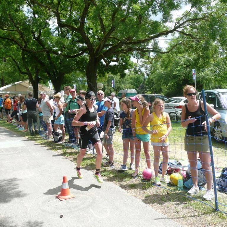 Zuerst mussten wir eine 2 km Schleife drehen, bevor es auf die eigentliche Radstrecke ging. Erstes Ziel war Velden am anderen Ende des Wörthersees. Meine Beine fühlten sich top an. Zuerst trank ich eine halbe Flasche Hypo, damit ich wieder Energie bekam. Im Pulk sausten wir am Ufer entlang. Durchschnittsgeschwindigkeit 38 km/h. Für mich eher ungewöhnlich, aber natürlich brachte das Training sehr viel. Weiter ging es die ersten Hügel hinauf. Ich fühlte mich unschlagbar und fuhr mit Speed den ersten höheren Berg, den Drobollach hoch. Immer wieder konnte ich in der Gruppe fahren. Die Kampfrichter waren ziemlich human und ermahnten nur. Strafkarten sah ich während der gesamten Strecke keine einzige. Nach 60 km erreichte ich den schwierigsten Berg, den Rupertiberg mit 148 Hm auf 2,5 km. Ich tat mich ziemlich leicht und war fleißig am Überholen. Von hier ging es teilweise bergab wieder zurück nach Klagenfurt. Nach 92 km kam dann die Eigenverpflegungsstelle mit Brigitte und den Laufstilanalysemädels. Hier bekam ich 3 neue Flaschen Hypo, eine Breze und ein Bussi von Brigitte. Die 2. Runde stand vor mir. Noch immer fühlte ich mich unschlagbar, erst beim 2. Mal am Rupertiberg merkte ich die beginnende Ermüdung in den Füßen. Aber trotzdem flutschte der Radpart so richtig. Nach 5h 32min 56 sec mit einem 32,44 Schnitt auf 180 km erreichte ich unter großem Beifall der tausenden Zuschauer an der Strecke, die Wechselzone. Schon beim Lauf mit dem Rad merkte ich das heute Zeit für Rekorde war. Das Rad stellte ich an den richtigen Platz und holte mir meinen Wechselbeutel. Schnell rein in die Laufschuhe, rauf mit dem Käppi, denn mittlerweile hatte es über 25 Grad und wie schon den ganzen Tag Sonnenschein. Start auf die Laufstrecke zum Marathon. Für den Wechsel benötigte ich 3min 32 sec.