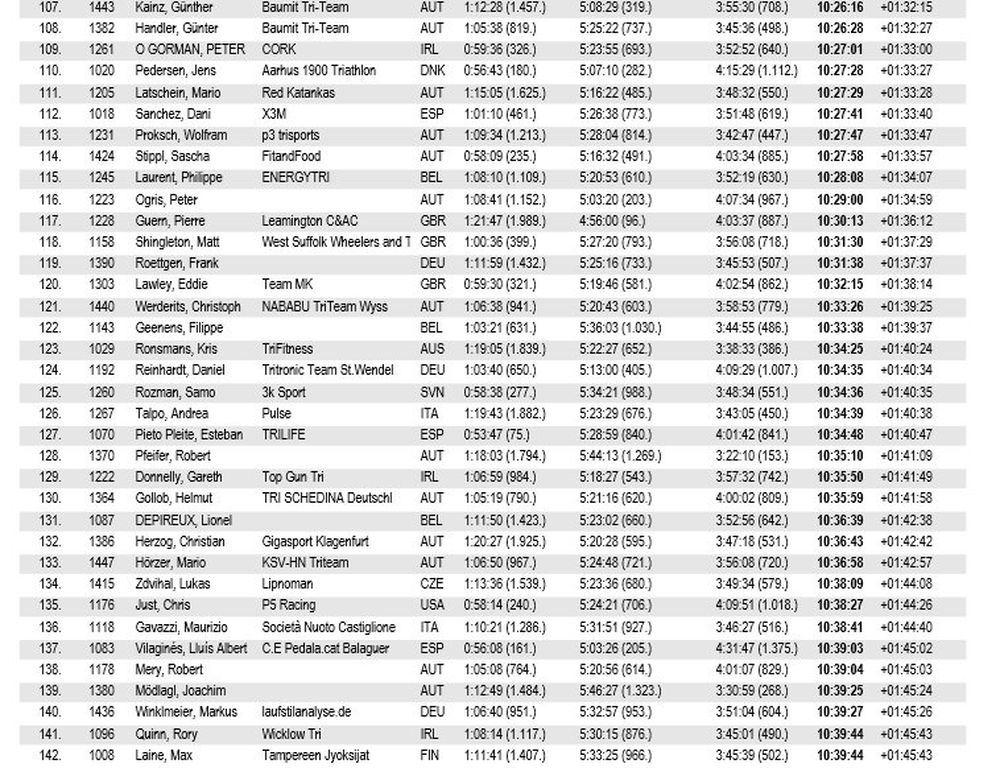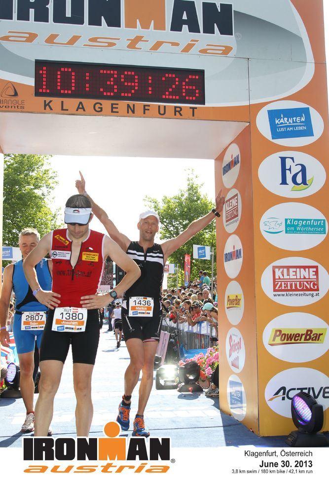 Mein Füße waren trotz der 180 km Rad und der 3,8 km Schwimmsession noch ziemlich fit. Ich schaute auf meine Gesamtzeit und sah 6 Stunden 47 min. Während ich unbewusst mit einem 4 er Schnitt losrannte, rechnete mein Gehirn. Marathon nach der Vorbelastung in 3 Stunden 13 Minuten. War das möglich. Ich wäre nicht ich, wenn die Anwort nicht sofort käme. Risiko, ein Versuch ist es wert. Also weiter ab mit einem 4:11 Schnitt. Nach 3 km kam ich an Brigitte und den ganzen Laufstilanalysefans vorbei, die mich wieder lautstark anfeuerten. Zuerst lief ich entlang des Wörthersees bis zur Wende. Hier kamen mir Alex, Mane und Silvia entgegen. Meine Euphorie war ungebremst und ich war auf Sub 10 Kurs. Aber nach 13 km musste ich auf einen 5 er Schnitt zurückfahren. Mein Magen machte Probleme und die Füße wollten nicht mehr so wie mein Kopf. Nach 21 km hatte ich eine Zeit von 1 Stunde 42 min stehen. Mir wurde langsam klar, das ich die Sub 10 knicken musste und die Erfahrung würde noch viel schmerzhafter werden. Nach jedem Kilometer ging es mir schlechter und die Pace fiel ins bodenlose. Es kamen wieder die Gedanken, warum, nie wieder, das letzte Mal...., ich hatte aber noch 21 Kilometer vor mir. Teilweise mit einem 6:30 Schnitt humpelte ich durch die Gegend. Mit Cola, Iso, Wasser und Salz versuchte ich mich von Versorgungsstand zu Versorgungsstand zu bringen. Das Leiden auf den zweiten 21 Kilometern dauerte 2 Stunden und 9 Minuten, bis ich endlich in den Zielkanal mit einem 2:56 Schnitt einbiegen durfte. In diesem Moment kam mir der Gedanke, wann und wo mache ich meinen 3. Ironman :-) Mit einer Gesamtzeit von 10 Stunden 39 Minuten und 27 Sekunden einem 699. Gesamtplatz von knapp 3000 und 140. Altersklassenplatz von 406 Teilnehmern kam ich ins Ziel. Meine Zeit vom letzten Jahr konnte ich um 1 Stunde und 9 Minuten unterbieten. Obwohl ich mich beim Marathon verzockt hatte, konnte ich trotzdem ganz zufrieden sein und es bleibt noch immer genügend Luft nach oben....