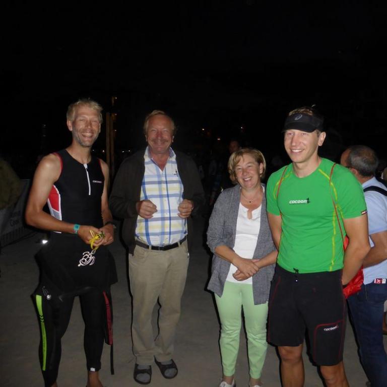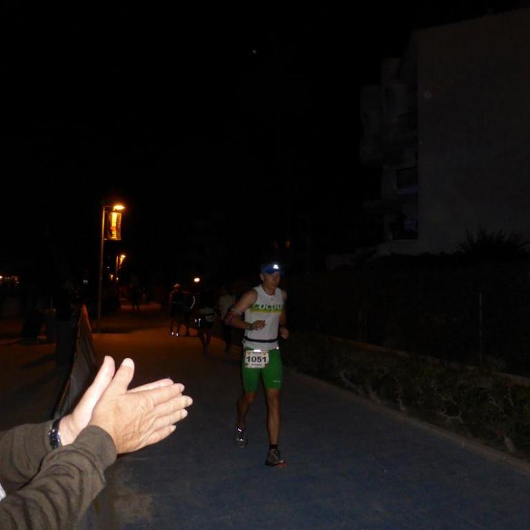 Im Wechselzelt traf ich auf Klaus und nach knapp über 5 Minuten Wechsel saß ich auch schon auf dem Rad und brauste an Brigitte, Emma, Opa und Oma vorbei. Jetzt gibt es keine Gefangenen mehr dachte ich. Eine neue Bestzeit musste her. Ich trat in die Pedale und die ersten Athleten mussten dran glauben :-) Nur eines machte mir Sorgen, auf dem linken Auge sah ich nur verschwommen. Halb so schlimm dachte ich mir, das gibt sich schon noch. Falsch gedacht, es wurde schlimmer, Gegen die Sonne sah ich fast gar nichts mehr und ich musste langsamer werden. Auch das rechte Auge war viel lichtempfindlicher. So ein Sch.... Nach 15 Kilometern hielt ich an und wusch mir das Auge mit Hypo aus, da ich nichts anderes hatte, was aber nichts half. Ich schaffte es noch bis zur ersten Verpflegungsstation, wo ich es mit Wasser versuchte. Kurzzeitig wurde es besser und ich trat wieder in die Pedale, aber nach kurzer Zeit radelte ich wieder im Blindflug. Keine Ahnung was mir fehlte, vielleicht ein bakterieller Infekt oder eine allergische Reaktion gegen Salzwasser, Wind oder Sonne. Das linke Auge brannte wie Feuer und mit rechts konnte ich trotz Sonnenbrille nicht in die Sonne schauen. Immer wieder hielt ich an und spülte meine Augen mit Wasser. Es brannte so stark das mir die Tränen kamen. Ralf hatte gestern beim Abschlussbriefing von Plan B gesprochen, aber es ich fand keinen, so sehr ich auch nachdachte. Ohne Augenlicht geht es einfach nicht. Ich kämpfte mich zur nächsten Verpflegungsstelle bei Kilometer 70. Noch 20 Kilometer und ich war wieder Alcudia, dort wollte ich entscheiden ob ich weiter mache. Teilweise musste ich blind fahren, weil ich links eh nichts sah und rechts konnte ich das Auge nicht mehr offen halten weil es überanstrengt war. Irgendwie quälte ich mich unter starken Schmerzen in beiden Augen zurück nach Alcudia, wo ich anhielt. Ich musste mir eingestehen, das es nicht mehr ging. Die innerlichen Schmerzen ein Rennen abzubrechen waren am Größten. Ich suchte mir einen Verantwortlichen in der Wechselzone um das Rennen vorzeitig zu beenden. Wenn mir die Augen nicht eh schon tränen würden hätte ich zum heulen angefangen. Ich hatte mich so sehr auf die Laufstrecke durch Alcudia gefreut, vor allem wenn mich Emma und Brigitte anfeuern würden. Tja es kommt immer alles anders als man denkt. Heute gab es für mich einen bodenlosen Sturz ins Leere. Auch mein Augenproblem war noch nicht gelöst. In einer Apotheke holte ich mir Augentropfen und seit dem hoffe ich auf Besserung. Positiv an diesem Tag war das alle anderen Laufstilanalyseathleten mit super Leistung und Hammerergebnissen finishen konnten. Gratulation von mir an alle Kämpfer. Sau starke Leistung!