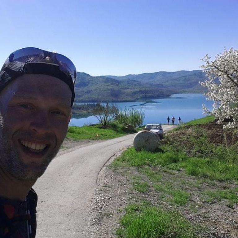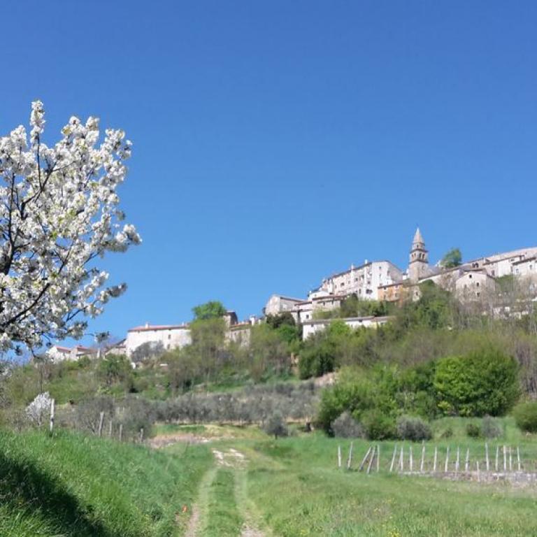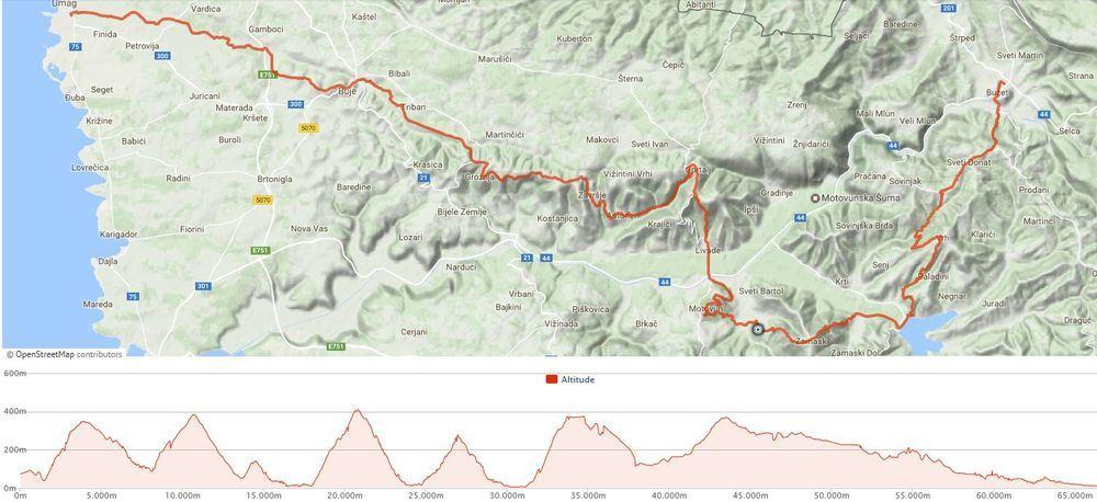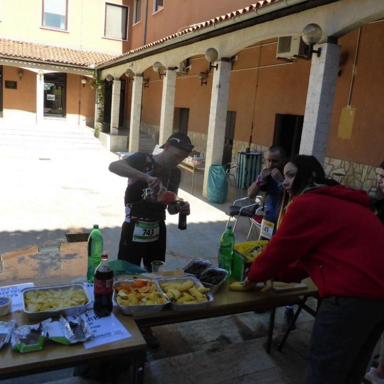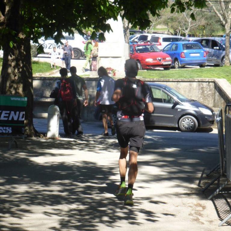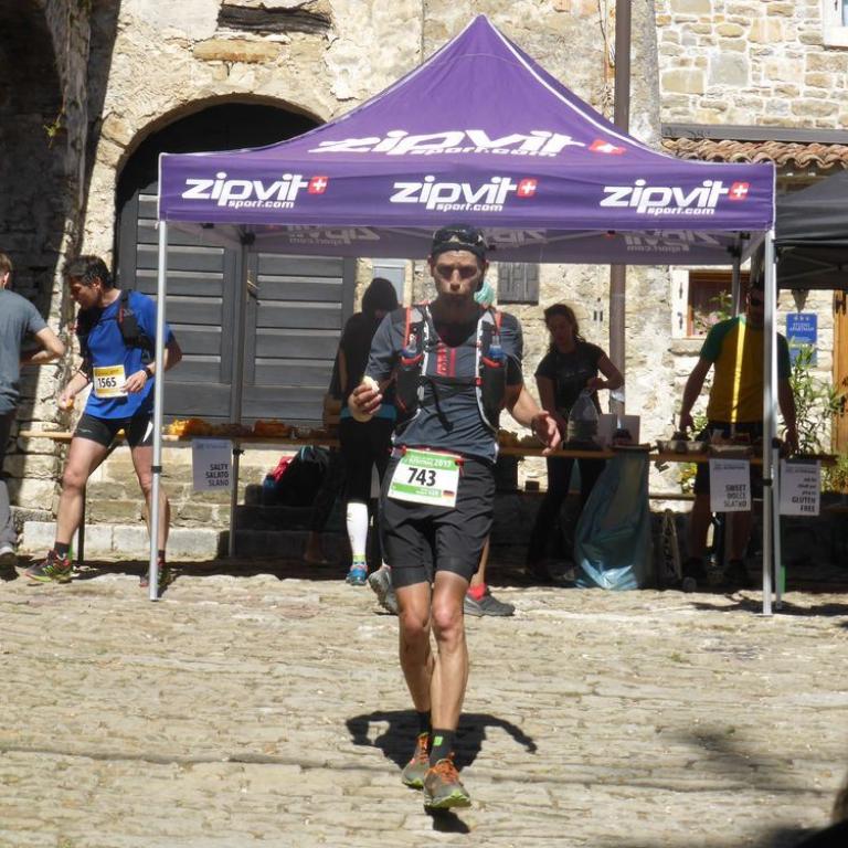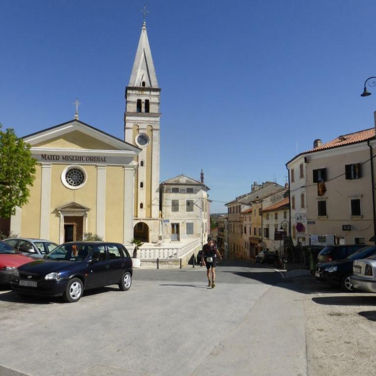 Der Wecker holte mich um dreiviertel 6 aus den Federn. Meinen Laufrucksack hatte ich gestern schon gepackt. Zur Pflichtausrüstung gehörte Regenjacke, Erste Hilfe, Stirnlampe, Rettungsdecke und 1 l Getränke. Brigitte fuhr mich zum Ziel 3 km vom Hotel entfernt, wo der Bus zum Start meines Rennens wartete. Brigitte ging dann laufen, Frühstücken und nutzte den Wellnessbereich. Ich fuhr mit dem vom Veranstalter organisierten Bus nach Buzet mit 300 weiteren Ultraverrückten. Hier war Party angesagt. Ein DJ legte gute Rockmusik auf und alle waren hochmotiviert. Es wurde wärmer und ich entledigte mich meines Pullovers und langen Hose. Um 9 Uhr fiel auch schon der Startschuss nach ACDC`s Thunderstruk. Es waren auch einige Profis mit am Start. Insgesamt waren 37 Nationen und ca. 2000 Läufer auf den 4 verschiedenen Routen gemeldet. Es gab eine 170 km, 109 km, 69 km und 42 km Strecke, die in unterschiedlichen Ortschaften und zu unterschiedlichen Zeitpunkten starteten. Ich lief im Mittelfeld los und stellte ziemlich schnell fest, dass es mir zu langsam war. Also war Ballern angesagt. Ich überholte was das Zeug hielt. Bergab ratterte ich mit einem 3:30 er Schnitt. Nach ca. 2 km ging es auch schon einen Trail steil nach oben. Auch hier überholte ich. Die meisten gingen schon. Dank meiner Übermotivation machte ich nach 4 Kilometer einen Salto nach vorne. Gut das ich von meiner Judozeit, die Judorolle noch drin hatte. Trotzdem rann mir das Blut aus dem Knie. Nur die Harten kommen in den Garten. Ich bekam Beifall von hinten, da ich nach der Rolle gleich wieder stand und weiterlief. Nach 10 km befand sich die erste Verpflegungsstation in einem urigen Bergdorf. Landschaftlich war die ganze Strecke sehr reizvoll. Immer wieder alte Dörfer, Seen, Berge, alles blühte und Trails, Trails und nochmals Trails. Ich hatte mich mittlerweile auf den 21. Platz Gesamt vorgearbeitet. Es lief richtig gut für mich, bis auf einen weiteren Sturz. Diesmal bergab bei vollem Lauf. Aber auch diesmal rollte ich perfekt ab und außer ein paar weiteren Kratzern war nix passiert. Meine Füße sahen aus wie nach einem Kampf, aber The Show must go on. Es gab nur 3 Dinge die mich halten konnte: 1. Verletzung durch Sturz, 2. Verlaufen dank der nicht immer ersichtlichen Markierung, 3. Aufgefressen werden durch einen der vielen Hunde, die teilweise frei rumliefen.