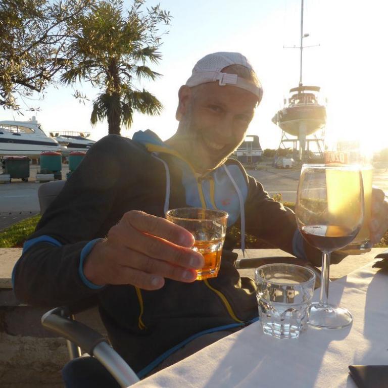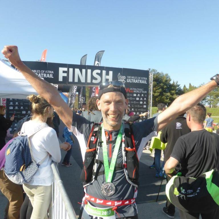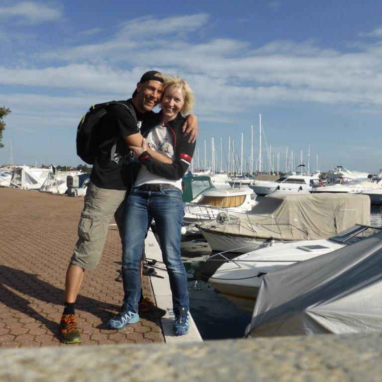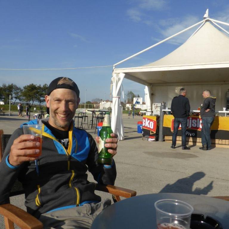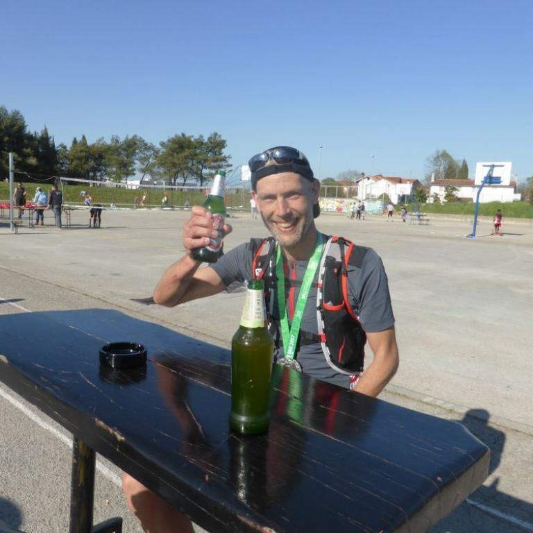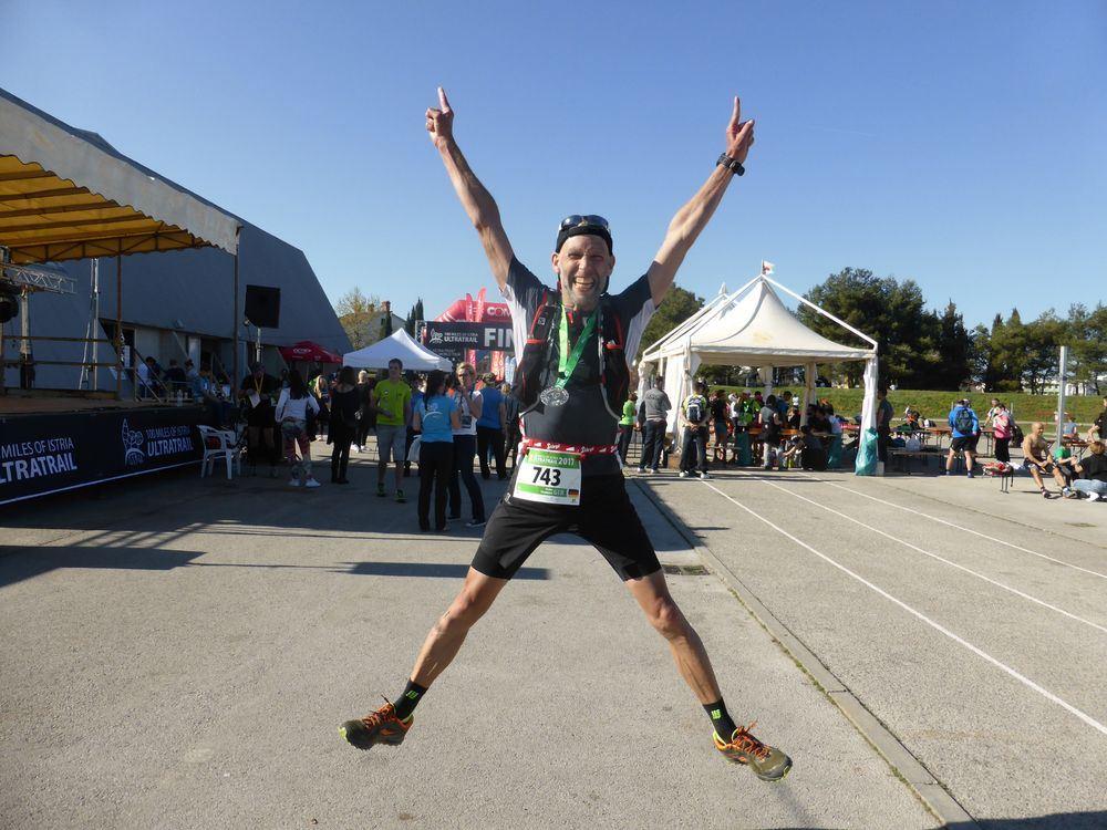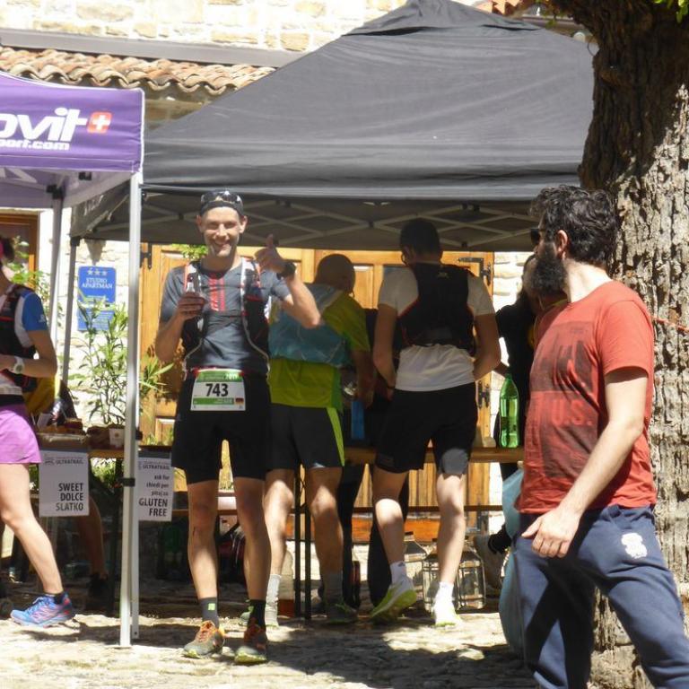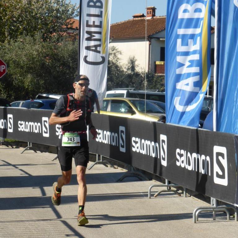 Ich ballerte auf den Trails teilweise einsam dahin. In der Sonne war es ziemlich heiß und der Schweiß rann mir ins Gesicht. Nach 3 Stunden hatte ich die Hälfte geschafft. Ich war viel schneller als geplant. So konnte es weitergehen. Die meisten Höhenmeter waren auch schon geschafft. Per Handy hielt ich Brigitte, meine Eltern und Freunde auf dem Laufenden. Bei der vorletzten Verpflegungsstation bei Kilometer 48 erwartete mich Brigitte, was mich sehr freute. Ich tankte Cola, Banane und Orangen in mich hinein. Und weiter lief ich in Richtung Ziel. Langsam wurde es hart, aber es lief noch immer. Teilweise sauste ich mit einem 4:30 Schnitt dahin. Bei Kilometer 55 traf ich beim letzten Anstieg und bei der letzten Verpflegungsstation wieder auf Brigitte. Sie pushte mich weiter und ich machte mich an die letzten 14 Kilometer. Ich lief und lief. Nur noch 10 Kilometer, nur noch 5 Kilometer. Die Pace lag nur noch zwischen einem 5:30 er und 6 er Schnitt. Die Füße wurden schwer und ich musste aufpassen keinen Krampf zu bekommen. Das letzte Geel sollte mich retten und rettete mich auch. Kurz vor dem Ziel verlief ich mich auch noch und stand auf einmal in einem Bauernhof. Ich musste nochmals zurück und sauste dann in Richtung Ziel. Ole Ole, Platz 23. Gesamt bei den Männern in 7 h 36 min in einer 6:43 Pace bei 69 km 2400 Hm. Brigitte erwartete mich schon um ihren Ultrawinkl in den Arm zu nehmen. Ein weiterer Meilenstein war geschafft. Ich habe nun 10 Punkte für den Mont Blanc, die nur 2 Jahre gültig sind. Im Ziel gab es eine Siegerhalbe. Den Abend genossen wir in der Sonne bei gutem Essen, einem Glas Wein und Aussicht auf den Hafen und Meer von Umag. Wir schlenderten dann noch am Hafen und Strand.