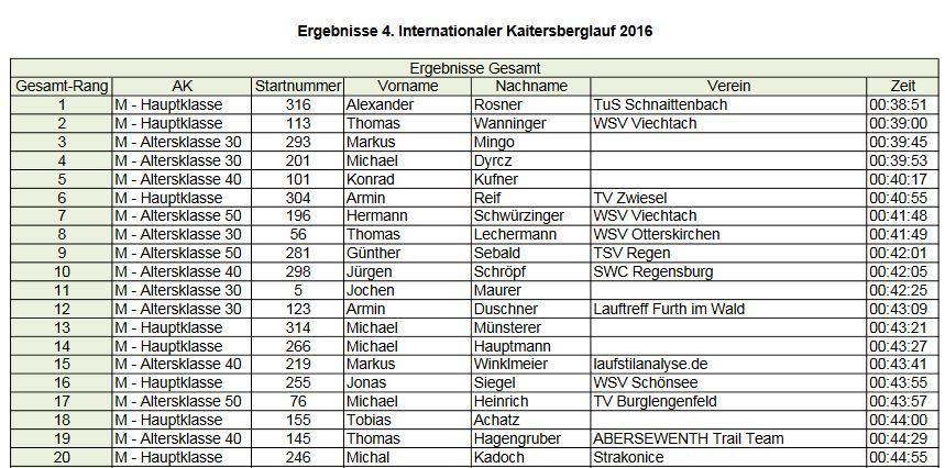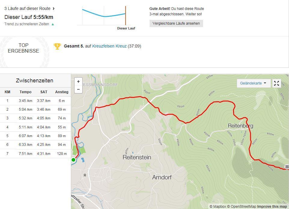 Zum 3. Mal startete ich beim "Kine vom Kaitersberg". Eigentlich sagte der Wetterbericht Regenwetter voraus. Deshalb nahm ich meine Mädels nicht mit. Dankeschön an meinen Papi, der mich dafür begleitete. Das Wetter wurde aber deutlich besser als erwartet. Das Rennen war schon lange ausverkauft, was natürlich für das Event spricht. Über 300 Starter und Starterinnen wollten den 999 m hohen Kreuzfelsen bezwingen. Die Elite der Bergläufer war auch vertreten, Mingo Markus, Wanninger Thomas, Dyrcz Michael und noch viele mehr. Wie schon am Donnerstag beim Conti Running Day fühlte ich mich so richtig gut und war ganz klar auch topmotiviert. Ich hatte anscheinend den Mont Blanc Ultra Traillauf schnell verdaut :-) Max Hochholzer und sein Team hatten wieder ganze Arbeit geleistet und das ganze Event perfekt organisiert. Um 11 Uhr fiel auch schon der Startschuß zu dem 7 km 600 Hm Trailevent. Um den Anschluss nicht zu verlieren startete ich aus der 2. Reihe. Mit einer 3:30 Pace ging es dann auch schon los, die ersten knapp 2 Kilometer ohne größere Höhenmeter aber durch eine matschige, gestern noch überschwemmte Wiese. Erst als es nach oben ging zog sich das Führungsfeld auseinander. Mein Ziel war in die Top 20 zu kommen. Mein Füße fühlten sich frisch an und ich konnte jede Steigung hoch drücken und immer wieder Plätze gut machen. Das machte Spaß. Klar pumpte meine Lunge am Anschlag und der Puls war in unendlichen Höhen, aber so ist das nun mal bei einem Speedberglauf. In Reitenberg angekommen wurden wir von vielen Zuschauern empfangen die uns begeistert anfeuerten. Dicht hinter mir hingen 2 Läufer an mir dran und vor mir waren ebenfalls 2 Läufer, die erreichbar waren. Ich lief sämtliche Steigungen um meinen Platz zu verteidigen und evtl. noch eine Attacke zu setzen. Knapp hinter der der Räuber Heigl Höhle hatte ich dann noch 500 m und 100 Hm. Also steil bergauf. Langsam ging mir der Saft aus, aber ich konnte den Abstand nach hinten erhöhen und nach vorne verringern. Dann gab ich alles und konnte beide Trailläufer vor mir am steilsten Stück einkassieren und machte mit Kraft weiter. Kurz vor dem Ziel waren so viele Zuschauer wie noch nie, die mich bis zum Kreuzfelsen mit ihren Anfeuerungsrufen begleiteten. Als 15. Gesamt in neuer persönlicher Bestzeit kam ich mit 43:41 Minuten ins Ziel, wo mich mein Papi empfing. Ich holte mir in der Altersklasse den 3. Treppchenplatz was mich natürlich sehr freute. Nach dem Lauf wanderten wir noch zur Kötztinger Hütte, wo wir uns Erbsensuppe und ein Bier schmecken ließen :-)