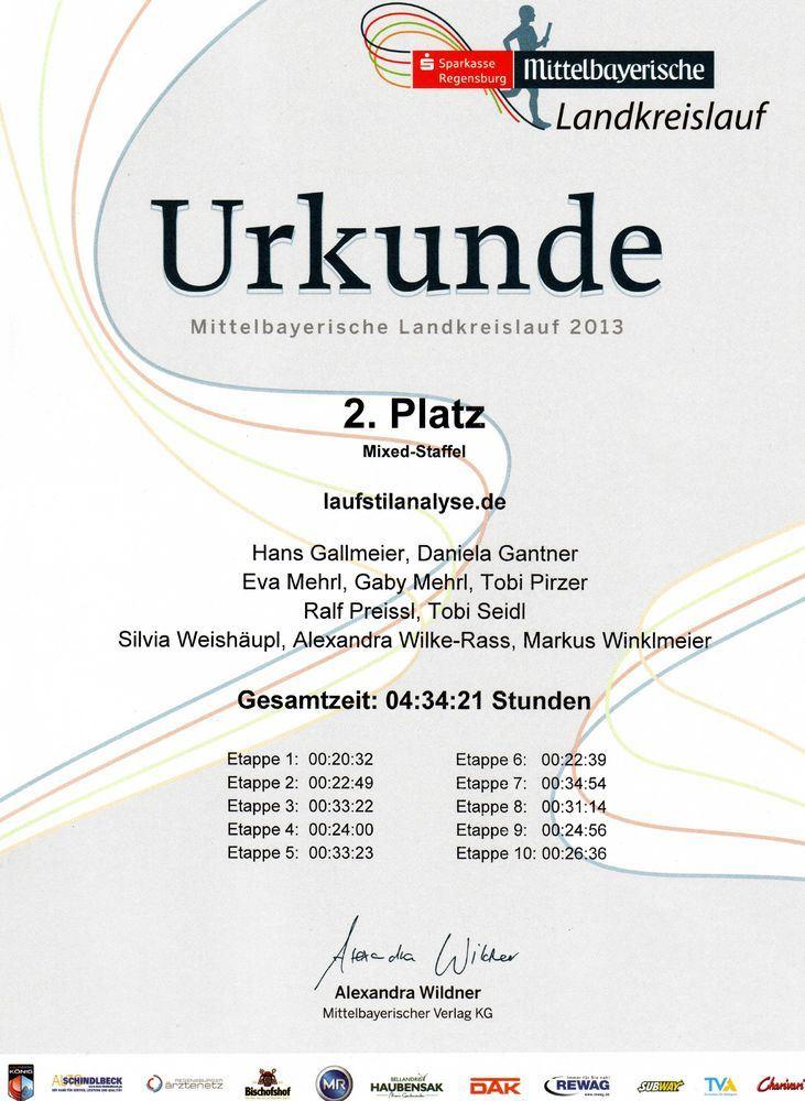 Premiere: Mein erster Staffellauf beim Landkreislauf in Regensburg. Der 4. Mittelbayerische Landkreislauf fand am 14.9.2013 statt. Als Zielort wurde Donaustauf auserkoren, Start ist in Ramspau. Schon vorab wurden wir von unserem Coach Ralf bei einem gemeinsamen Pizzaessen motiviert. Jeder wollte alles geben und jeder gab dann alles. Ich musste die 7. Etappe von 10 Etappen (62 Km Gesamt) mit 8,5 km und 160 Hm bewältigen. Am Donnerstag lief ich die Strecke nochmals ab, damit ich mich beim Wettkampf nicht verlaufe. Wolfi, Christoph und ich fuhren rechtzeitig zu den Startpunkten. Schon viel früher stand ich am Start in Hackenberg mit Alex und John. Bis ich mich versah kam auch schon Gaby und überreichte mir den Staffelstab. Zu diesem Zeitpunkt waren wir schon an 2. Stelle im Mixed Team. Die ersten knapp 2 km gingen relativ eben bis zur nächsten Ortschaft. Hochmotiviert konnte ich einen 3:40 Schnitt halten. Dann kam die erste Steigung und die Strecke verlief auf einem Forstweg. Mit extrem überhöhtem Puls (190 Schläge) lief ich bis zur Hauptstraße, auf der ich 200 m bleiben musste und dann leicht bergab wieder auf Feldwege. Weit vor mir sah ich einen Läufer und hinter mir war kein Mensch weit und breit zu sehen. Steil bergab durch den Wald ging dann ein rutschiger Singletrail bis ich wieder auf eine Straße traf. Hier lief ich auf den Läufer auf und stellte fest, das es Vinod der extraklasse Ultraläufer, war, der den Lauf in der Einzelwertung später gewann. Ich feuert ihn an und zog dann an ihm vorbei. Kurz musste ich ca. 50 m extrem steil eine Straße hinauf, bevor es wieder mit stetig leichter Steigung auf einem Feldweg weiterging. Ich war ziemlich am Ende und musste die Geschwindigkeit zurücknehmen. Dann erreichte ich wieder eine Teerstraße auf der ich wieder einen 3:50 Schnitt halten konnte. Der letzte Kilometer führte mich bergab bis nach Altenthann wo ich nochmal alles gab. Ich erreichte das Ettapenziel mit einer Zeit von 34:54 Minuten und überreichte dort Kneidl Wolfi den Staffelstab. Einige Minuten später kam Mane als Einzelstarter, den ich dann auch noch knapp 2 Kilometer begleitete und versuchte ihn zu motivieren. Mane schaffte den Lauf als Dritter von den Einzelstartern und verdient von mir den größten Respekt vor dieser Leistung. Ich wurde von Christoph und Wolfi, die 2 Etappen vor mir gelaufen waren, abgeholt und wir fuhren nach Donaustauf ins Ziel. Als Schlußläuferin kam dann Silvia und wir begleiteten sie freudestarhlend durchs Ziel. Wir hatten uns den 2. Platz in der Mixed Wertung in 4:34:21 Stunden auf knapp 62 km geholt. Unser Coach Ralf, aber auch wir selbst waren sehr Stolz wie Oskar auf unsere Leistung, die wir dann am Abend gebührend im Festzelt feierten. Mit Laufstilanalyse.de macht es einfach sau viel Spaß und Lust auf mehr :-)