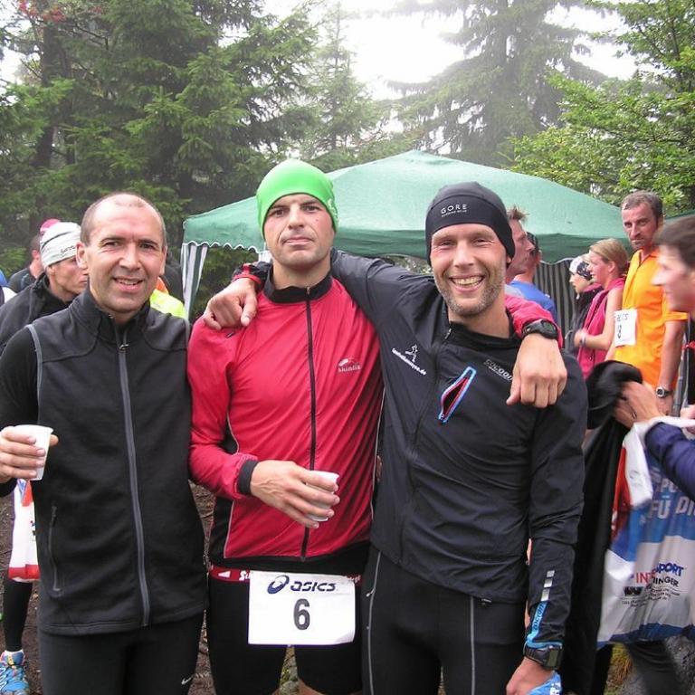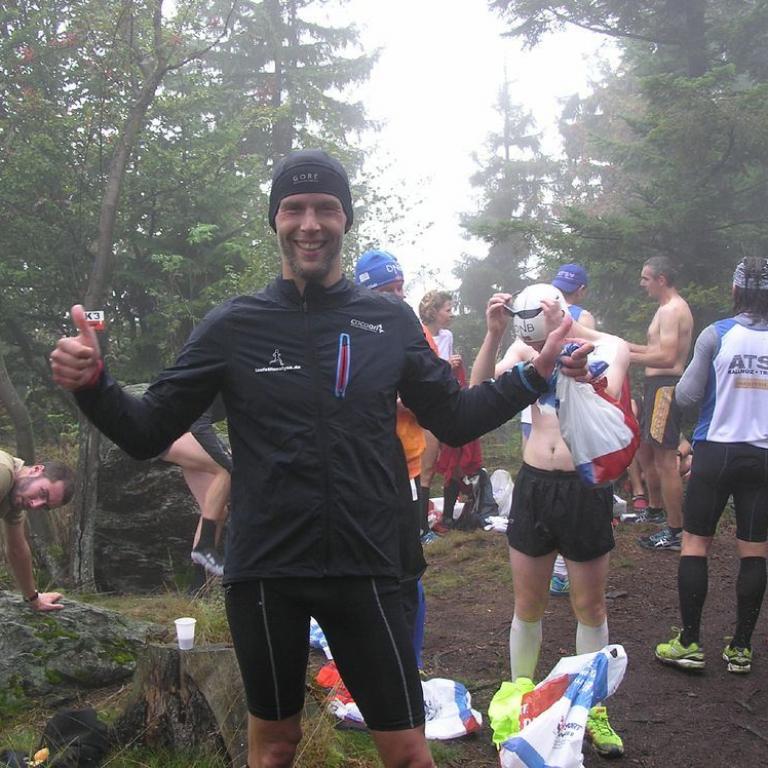 Und noch ein Event stand auf dem Programm: Der Berglauf "Da Kine vom Kaitersberg" in Bad Kötzting. Eine Strecke von 7,58 Kilometer und über 600 Höhenmetern musste überwunden werden. Mit schweren Füßen fuhren Wolfi und ich nach Bad Kötzting. Ich rechnete mir nichts aus und wollte einfach nur auf dem 999 m hohem Kreuzfelsen ankommen. Alles zwickte und auch das Warmlaufen war nicht gerade angenehm, da sämtliche Muskeln schmerzten. Es waren über 250 Läufer gemeldet. Viele Elite Läufer standen auf der Liste, natürlich auch der Berglaufspezialist Schönberger Korbinian, aber auch internationale Läufer aus Polen, Tschechien, Italien und Marokko waren am Start. Um 11 Uhr fiel der Startschuß und alle brachen gleich mal einer Affengeschwindigkeit hinaus. Ich konnte kaum folgen, aber nach einigen hundert Metern schaltete ich den Turbo ein und los ging es. Alex folgte mir und die erste Steigung kam. Verfolger hatten wir kaum noch aber auch das Spitzenfeld war schon davongeeilt. Nach knapp 3 Kilometern zog Alex an mir vorbei, was mich aber motivierte und ich versuchte an ihm dran zu bleiben, was mir auch gelang. Danke an Alex für das Ziehen. Dann kam eine gerade Passage, die ich nutze um zu überholen. Ich fühlte mich überraschend gut und legte noch einen Zahn zu. Die letzten 1,5 Kilometer gingen steil bergauf. Es war rutschig und extrem anstrengend. Ich sprang von Felsen zu Felsen und immer höher kam ich in Richtung Gipfel. Immer wieder wurden wir von Zuschauern angefeuert. Die letzten Meter ins Ziel konnte ich kaum noch laufend überwinden. Ich zog mich an den Stahlseilen hoch und kam nach 43 Minuten und 45 Sekunden als Gesamt 15. von über 250 Teilnehmern ins Ziel. Ich war positiv überrascht, welche Leistung ich wieder nach der gestrigen Belastung abrufen konnte und auch die Platzierung konnte sich sehen lassen, wenn man bedenkt welche Hochkaräter am Start waren.