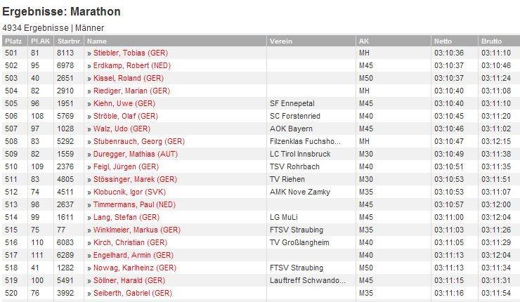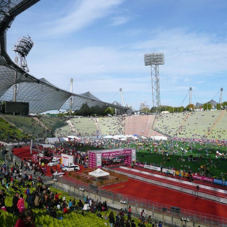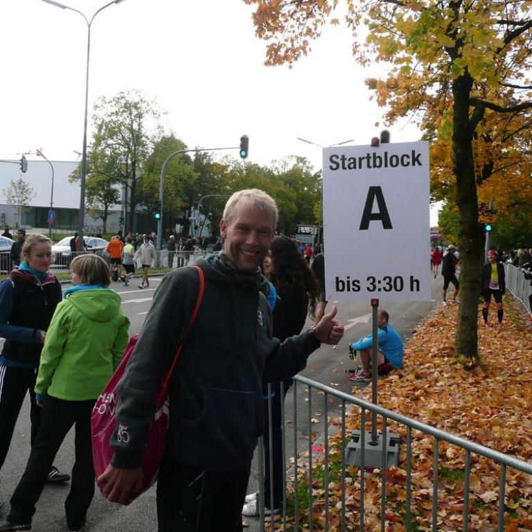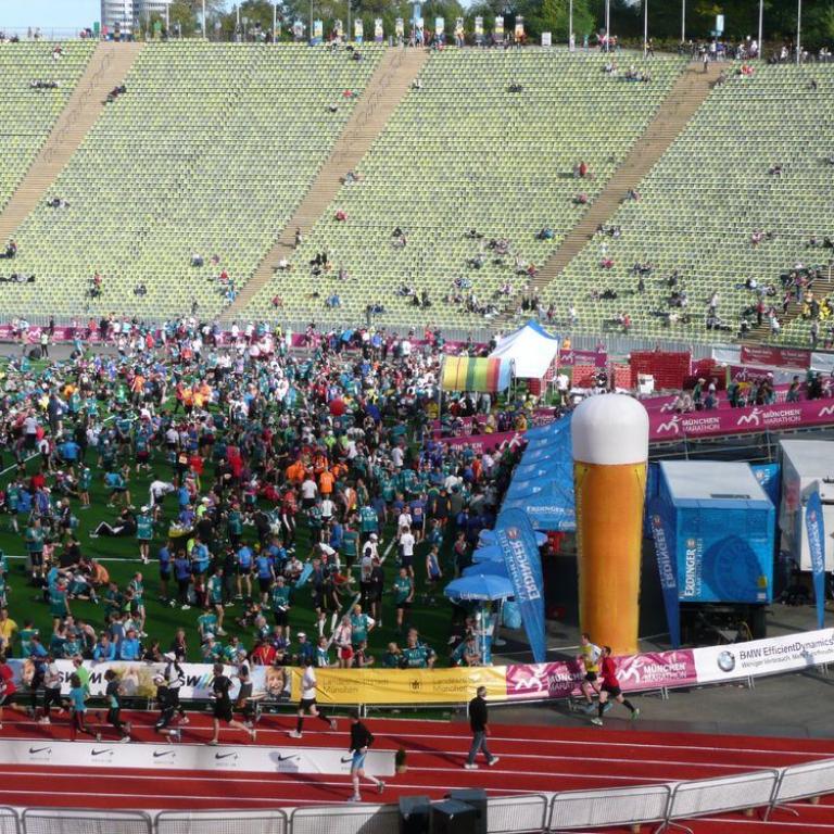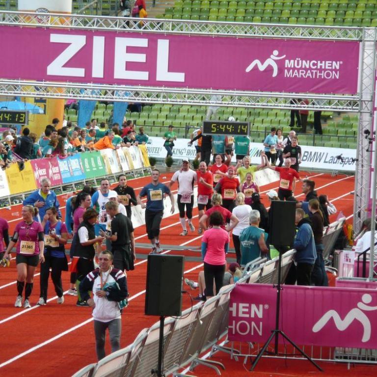Nach einer Nacht mit unruhigem Schlaf gingen wir um halb 8 zum Frühstück und fuhren dann mit der S-Bahn zum Olympiastadion. Der Marathonstart war um 10 Uhr am Olympiagelände und der Start der Halbmarathonis war erst um 13 Uhr am anderen Ende der Rundstrecke, so das Brigitte dorthin kommen und bis dahin die Zeit totschlagen musste. Es war noch ziemlich kühl, so das ich mich für ein Langarmshirt entschied, was sich später als Fehler herausstellte, weil es immer wärmer wurde. Um dreiviertel 10 standen schon hunderte ambitionierte Läufer am Start. Ich traf Karl-Heinz vom FTSV Straubing und wir unterhielten uns noch über unsere Laufstrategie. Mein Ziel war ganz klar, ich wollte die 3 Stunden Marke knacken. Mein letzter Marathon lag schon 3 Jahre zurück (abgesehen vom Ironman dieses Jahr) und da benötigte ich 3h 25 min. Theoretisch könnte ich mein Ziel aufgrund meiner aktuellen Halbmarathonzeiten (1:22:30 vor 4 Wochen) schaffen, aber mir fehlten die langen Einheiten in den letzten Wochen und Monaten. Vor einer Woche testete ich 30 km und hatte da schon Probleme nach ca. 25 km mit sehr schweren Füßen. Aber egal No Risk No Fun. Da ich meine Zeit unter 3:30 Stunden angegeben hatte, startete ich in der ersten Startwelle pünktlich um 10 Uhr. Insgesamt waren 18000 Marathon, Halbmarathon und 10 km Läufer in verschiedenen Startwellen am Start. Ich fühlte mich fit und lief gleich mal vor den 3h Pacemaker. ich lief konstant einen 4:15 er Schnitt, welcher mir keinerlei Probleme bereitete. Es ging quer durch München, den Englischen Garten und die Innenstadt. Nach 21,1 km hatte ich eine Zeit von 1:29 min auf dem Garmin und ich lag noch immer vor dem Pacemaker. Dann kam der 25. Kilometer und mich erwischte es mit dem Dampfhammer. Meine Füße wurden schwer und ich lief innerhalb kurzer Zeit nur noch auf Reserve. Als erstes wurde ich von dem 3 Stunden Pacemaker mit seinen Anhängern regelrecht überrollt und ich konnte nicht Anschluß halten. Was war los? Die lange, harte Saison machte sich bemerkbar oder die fehlenden langen Einheiten? Ich schleppte mich weiter. Erst 30 Kilometer geschafft, noch 12 kilometer zu laufen und ich eierte im 6 er Schnitt herum. irgendwie ging dann wieder der 5 er Schnitt, nachdem ich von gefühlten 1000 Läufern überholt wurde. Endlich erreichte ich die 40 km Marke und ich sah in der Ferne das Olympiastadion. 1 Kilometer vor dem Ziel schloß Karl-Heinz zu mir auf. Beflügelt von den Stadionlautsprechern, aus denen Die Toten Hosen spielten, konnte ich nochmals Gas geben und sprintete durch das Olympiastadion und kam mit 3 Stunden 11 Minuten und 3 Sekunden als Gesamt 515 er von 4934 männlichen Startern ins Ziel. Ich war maßlos enttäuscht von mir selbst, da ich mein selbstgestecktes Ziel weit verfehlte. Natürlich konnte ich meine persönliche Bestzeit schlagen, aber es wäre mehr drin gewesen. Dafür freute es mich um so mehr, als später unter meinen Anfeuerungsrufen Brigitte ins Stadion einlief. Sie hatte ihren ersten Halbmarathon geschafft und ich war sehr stolz auf sie. Natürlich auch deswegen, weil ich schließlich auch ihr persönlicher Coach war. Doch irgendwie glücklich aber mit angeschlagenen Füßen gingen wir zum Auto und traten wieder die Heimreise an. Nun gehts erstmal in eine dreiwöchige Saisonpause und dann konzentriere ich mich wieder mehr auf den Triathlonsport.