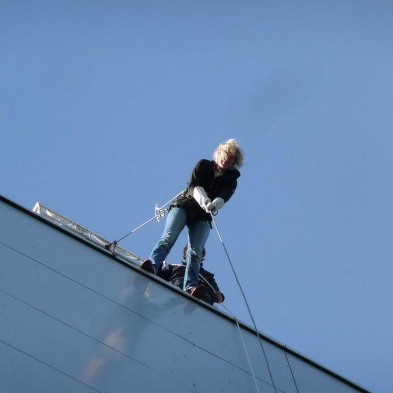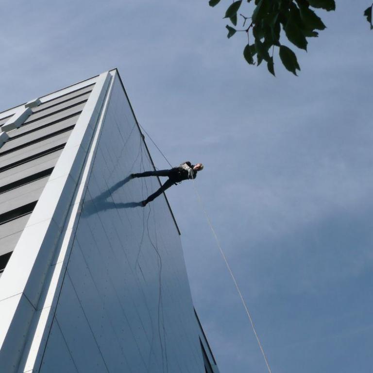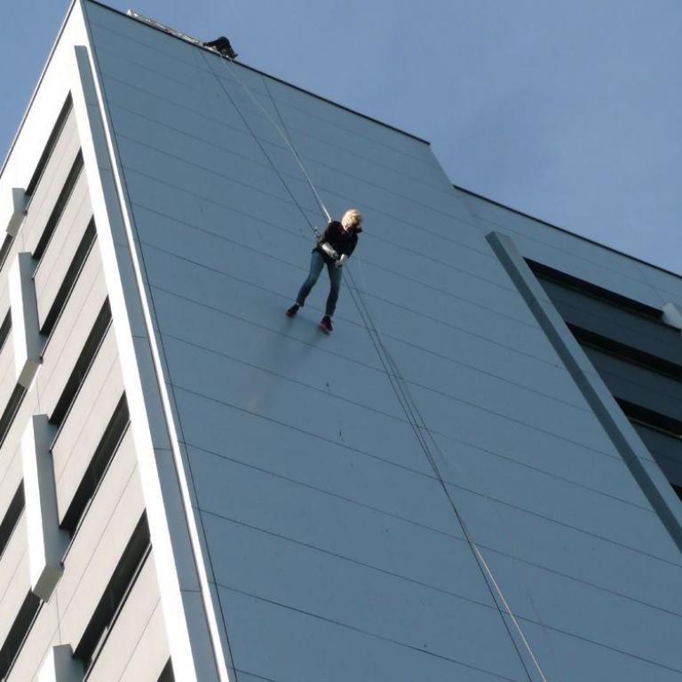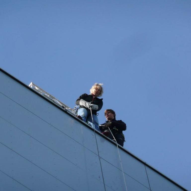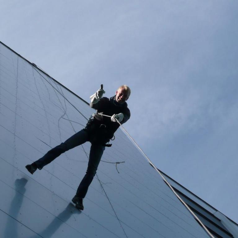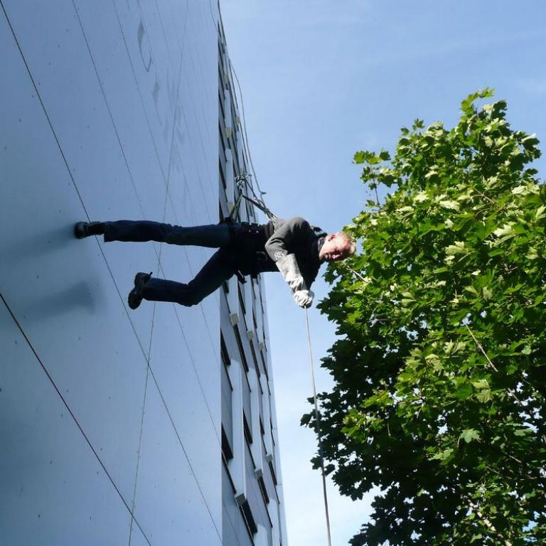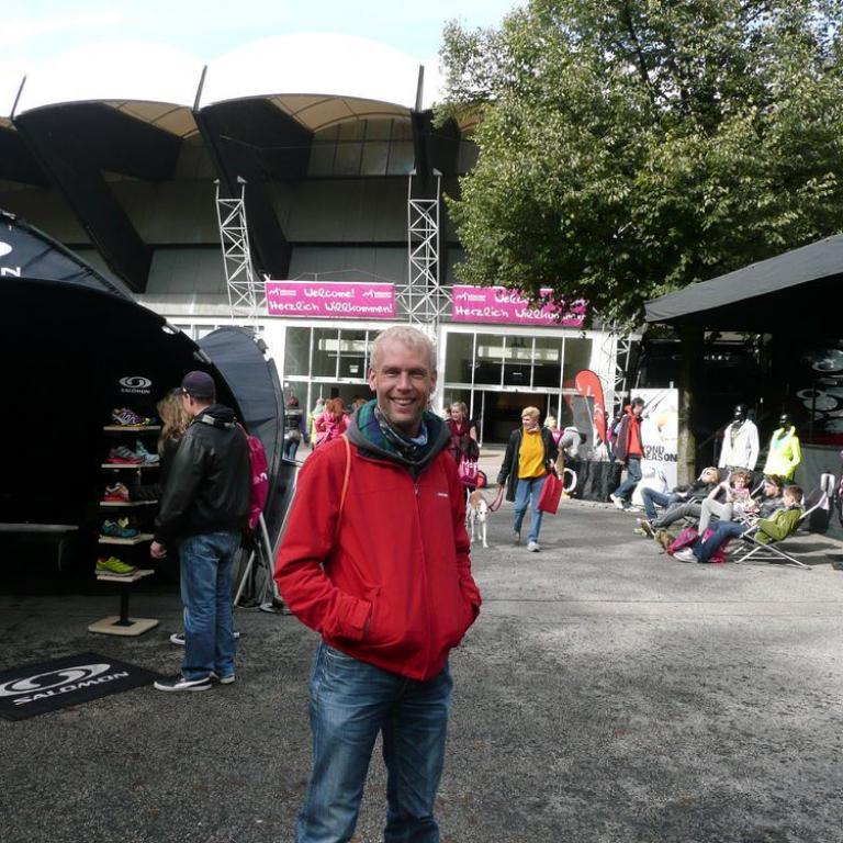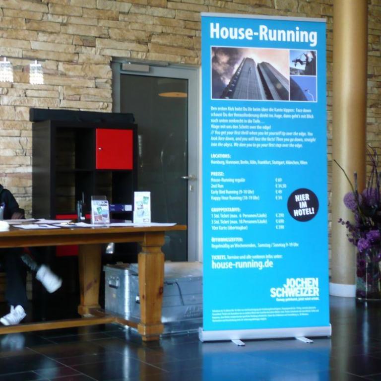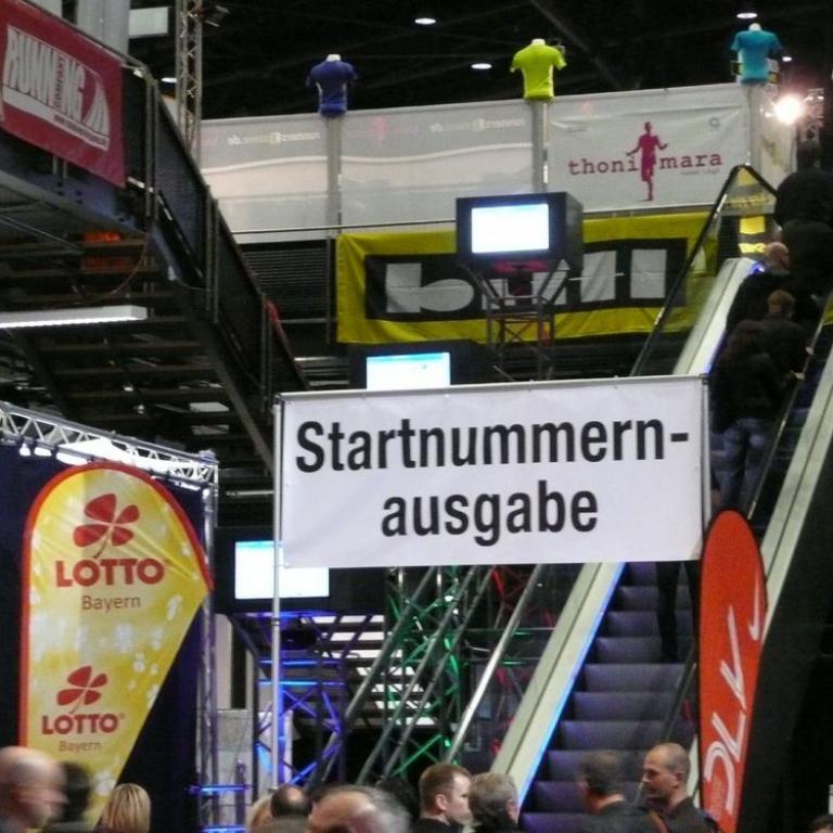 Schon früh stand ich Samstag in Laufklamotten vor der Haustüre. 2 km locker waren angesagt. Nach 10 min war ich hellwach und wieder zu Hause. Brigitte wartete schon mit dem Frühstück auf mich. Wir packten unsere Sachen und machten uns auf den Weg nach München zum Rilano Hotel. Hier wollten wir unser Glück im Houserunning von Jochen Schweizer versuchen, bevor am Sonntag der Münchenmarathon bei mir und der erste Halbmarathon bei Brigitte auf dem Plan stand. Mit einem Seil gesichert marschierten wir, mit Blick nach unten, vom Dach des Hotels an der Fassade abwärts. 50 Meter ging es in die Tiefe. Die Schwierigkeit lag darin, nicht zu rutschen, ansonsten war das Ganze relativ unspektakulär und nach 2 Minuten zu Ende. Trotzdem machte es Spaß und wir schossen viele Fotos. Nach dem Event fuhren wir zu unserem Hotel Lex, das zwischen Olympiagelände und Marienplatz liegt. Wir checkten ein und marschierten als erstes zur Eventarena am Olympiagelände, wo wir unsere Startunterlagen abholten. Wir schlenderten durch die Laufmesse und dann wieder mit der S-Bahn zu unserem Hotel. Am Abend gingen wir noch zum Nudelessen und ins Kino.