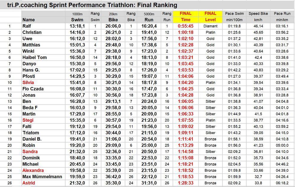 Beim 1. Mal lief ich die 5 km in 18:20 Minuten. Nicht schlecht, aber ich schaffte es mit Hilfe von Intervalltraining und schnelle Läufe 4 Wochen später eine 17:23 Minuten in einer 3:28 er Pace rauszuhauen. Schwimmen war so richtig schlecht beim 1. Versuch. Weit über 17 Minuten quälte ich mich auf dem einen Kilometer. Nach 4 Wochen ballerte ich eine 15:36 er Zeit raus. Das sind 1:33,6 min pro 100 m und konnte sich sehen lassen. Mein größtes Problemkind Bike war nach dem 1.Versuch mit einer 35 er Pace gar nicht so schlecht in meinen Augen. Nur das die meisten knapp einen 40 er Schnitt oder sogar darüber zu fahren. Somit stand ich nach der ersten Woche auf dem vorletzten Rang unserer Challenge. So wollte ich dies natürlich nicht stehen lassen und trainierte spezifischer. Auch am Rad haute ich eine Speed Einheit nach der anderen raus. Am letzten Tag lag ich auf Rang 8. Am Vormittag lief ich die schnellste Zeit auf den 5 km mit 17:23 Minuten. Jetzt musste am Rad der 5. Versuch eine weitere Bestzeit bringen. Am Abend wollte ich nochmal sehen was ich so drauf hatte. Ich gab alles, restlos alles, was in mir steckte und fuhr einen 40,64 er Schnitt. Bämmmm und ich lag dann gesamt auf dem 5. Platz.