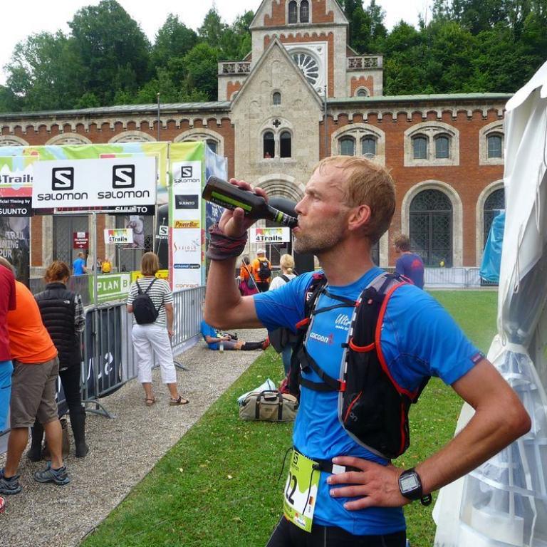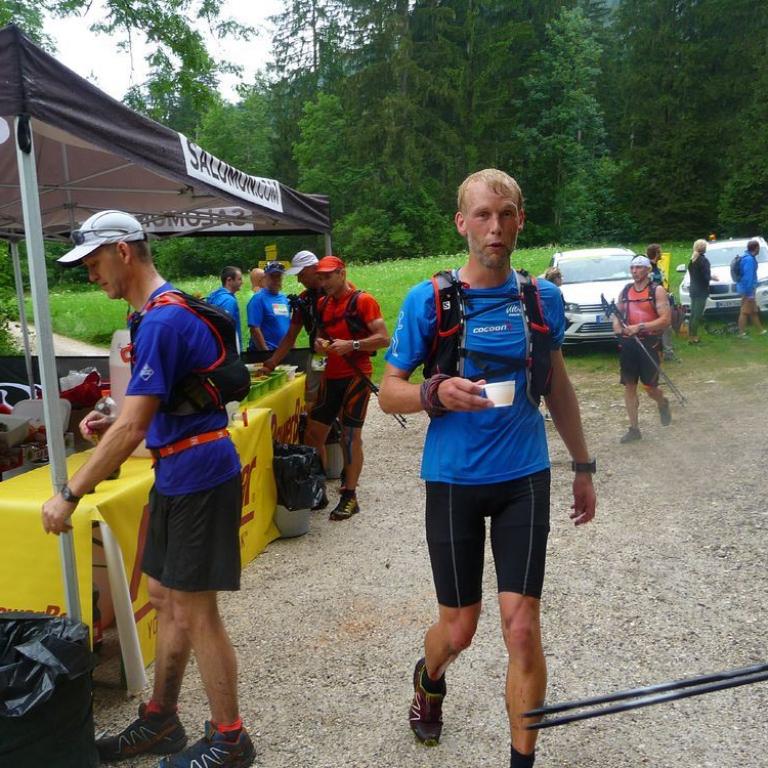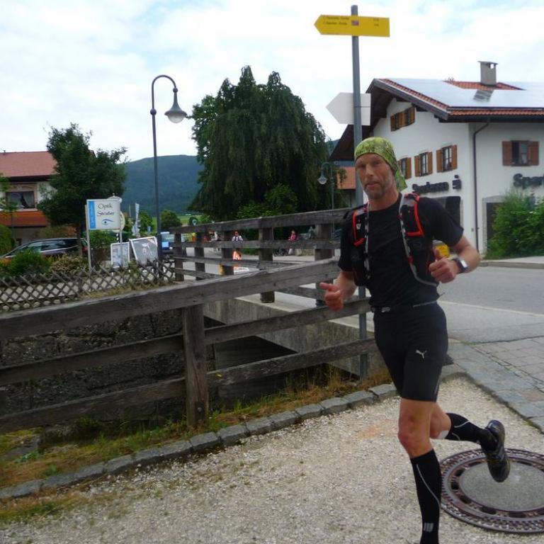 Auf geht`s zur 2. Etappe. Motivation: top, Kondition: top, Füße: bescheiden. So fuhr ich mit Papa nach Bad Reichenhall. Auch heute wurde die Strecke wetterbedingt wieder verändert. 150 Höhenmeter wurden uns erspart. Die Kilometer blieben aber gleich. 34 km und 1850 Höhenmeter waren zu bewältigen. Natürlich war ich stolz als ich mich im Startblock A bei den Topläufern wiederfand. Dank der gestrigen Platzierung durfte ich mich zu der Elite gesellen. Um 8 Uhr war der Startschuss und wie auch schon gestern sausten alle los wie Verrückte. Ich tat natürlich das gleiche und für 3 km leicht bergab brauchte ich nur 12 Minuten. Erst dann kam die erste kurze Steigung: 1000 Hm auf 6 km :-) Ich versuchte einigermaßen an einem schnelleren Feld dran zu bleiben. Ich konnte sogar den ein oder anderen überholen. Das Wetter war ideal. 18 Grad und leicht bewölkt. Auf 1386 m unterhalb des Hochstaufengipfels ging es auf einem genialen Singletrail nach Westen. Teilweise war es ziemlich rutschig und ich musste höllisch aufpassen, um nicht über ein Geröllfeld abzurutschen. Wir kamen dann zur Zwieselalm auf 1386 m von wo es über Latschen weiter nach Westen auf der Ausweichstrecke vorwärts ging. Hier war fast kein Laufen möglich, da ich hauptsächlich mit kraxeln über Latschen beschäftigt war. Im Schnitt konnte ich meine Anfangsplatzierung halten. Endlich waren wir am höchsten Punkt mit knapp 1500 Hm angelangt. Ich hatte schon wieder etwas Bedenken wegen dem Downhilltrail, aber heute ging es mir super. Ich wurde nicht überholt und ein, zwei Läufer kassierte ich sogar ein. In Breitmoos tankte ich an der Verpflegungsstation meine Flaschen auf und weiter ging es nach unten. Man glaubt es kaum, aber heute überlebte ich den Trail ohne Sturz und hohem Blutverlust :-) Wir liefen dann durch das Tal ziemlich eben bis Inzell. Heute lief es super. Teilweise war ein 4 er Schnitt auf der Geraden drin und ich lief mich richtig in einen Rausch, da einer nach dem anderen von mir überholt wurde. Soweit die Füße tragen war mein Motto. Bei Kilometer 24 kam dann die nächste Steigung. Teilweise durch Matsch und Schlamm, teilweise auf Forstwegen kämpften wir uns weitere 500 Höhenmeter bis zum Zinnkopf nach oben. Langsam ging mir der Saft in den Füßen aus. Endlich waren es nur noch 5 km bergab ins Ziel. Zuerst tat ich mich ziemlich schwer, erst langsam kam ich wieder in Tritt. Die letzten 4 km flutschen so richtig. Bis ich mich versah lief ich auch schon über die Zielmatte in 4h 16 min 41 sec. Gesamt bei den Männern konnte ich mich auf den 85. Platz verbessern und bei den Masters Men verlor ich einen Platz auf 33. Jetzt hieß es wieder regenerieren um morgen fit zu sein :-)