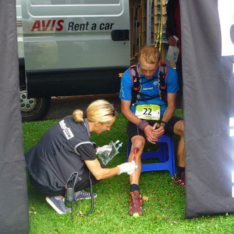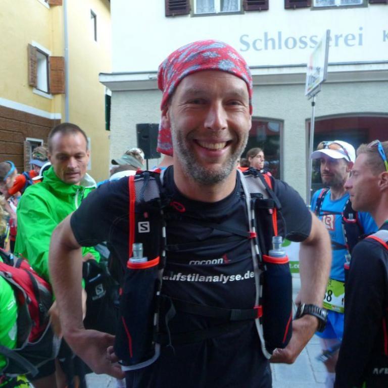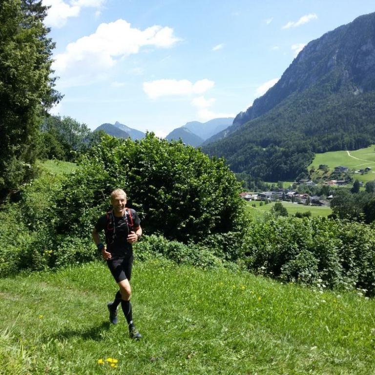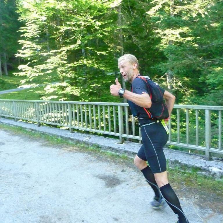 So stand ich dann am Mittwoch bei noch gutem Wetter am Start in Berchtesgaden mit 550 weiteren Verrückten aus 27 Nationen. Die Besten der Besten Trailläufer aus den verschiedenen Ländern und der No Name Winklmeier :-) Natürlich ging ich in die vordersten Reihen und stellte mich gleich mal neben den Vorjahressieger :-) Nach dem Startschuss und Highway to Hell ging es los durch Berchtesgaden mit dem Watzmann im Hintergrund. Zuerst mussten auf einer Straße steil nach oben, bis es relativ gerade auf Wanderwege in Richtung Doktorberg ging. Nach 3 km kam dann die lang ersehnte Steigung :-) Über 6 km und 1000 Höhenmetern führte uns der Störhausweg nach oben. Immer mehr Wolken zogen auf und wir hörten das erste Donnergrollen und Regen setzte ein. Bergauf ging es mir super und war nur am überholen. Ich stellte fest das Stöcke hinderlich wären. Vielleicht teste ich sie mal bei einer nächsten Etappen. Nach knapp 1 1/2 Stunden erreichte ich bei starkem Regen das Gatterl am Störhaus. Von hier ging es einen Singletrail an den Zehnerkaseralmen vorbei bergab. Dann fingen meine Probleme an. Wir kamen auf den Alpinsteig, der über 2,5 km 700 Höhenmeter so richtig steil, teilweise seilversichert und extrem rutschig über Steine und Wurzeln nach unten führt. Irgendwie bin ich bergab zu ängstlich oder ungeübt, so dass ich pausenlos überholt wurde, obwohl ich nicht mal langsam war. Mehrmals setzte ich mich auf den Hosenboden und verstauchte mir bei einem Ausrutscher den Daumen. Da dies aber noch nicht reichte stolperte ich kurz vor Ende des Trails nach vorne und bremste mit dem rechten Knie. Das Blut lief mir bis in die Socken und ich musste die Zähne zusammenbeißen. An der zweiten Verpflegungsstelle an der Holzstube wartete schon mein Papa und feuerte mich fleißig an. Dank dem schwierigem Bergabtrail waren meine Füße Matsch und ich musste tatsächlich kämpfen um in der Ebene einen 5 er Schnitt zu halten. Auf der Ausweichroute lief ich dann in Richtung Bad Reichenhall. Mehrmals kamen noch kürzere Anstiege und ein knackiger über knapp 200 Hm. Ich war ganz schön kaputt und nicht mehr so sicher das ich noch 3 weitere Etappen schaffen würde. Na toll :-) Irgendwie kämpfte ich mich die letzten Höhenmeter bergab bis nach Reichenhall, wo ich zuerst am Festplatz vorbei kam, durch die "Obere Stadt" lief, durch den ursprünglichen Stadtkern, vorbei am Florianiplatz bis zum Zielbogen in der Alten Saline. Völlig erschöpft schleppte ich mich durchs Ziel, wo ich von meinem Papa empfangen wurde und erstmal ein kühles Radler brauchte. Mein offenes Knie wurde im Medical Center gereinigt und versorgt. Die Ärzte taten natürlich alles, damit ich morgen wieder am Start stehen kann :-) Nach einer weiteren Radler, Breze und Apfel sah die Welt schon wieder anders aus. Das Ergebnis kann sich auch sehen lassen. Ich wurde 89. von 375 Männern und 32. von 164 in der Altersklasse Masters Men in 3 Stunden 7 Minuten und 44 Sekunden. Mal schauen ob ich meine Füße für morgen wieder einsatzbereit bekomme....