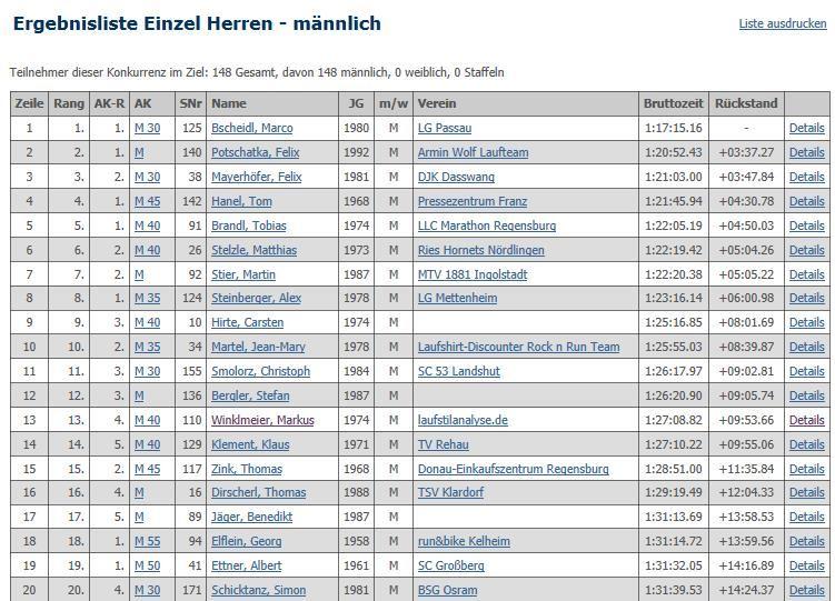Brigitte feuerte mich nach jeder Runde an. Beim Lauf merkte ich den Hals nicht wirklich und nach 3 Runden war ich an der 9. Stelle. Meine Motivation stieg natürlich wieder an und ich sauste durch die Gänge und die Parkhausspindel. Leider merkte ich nach 8 Runden, das meine Füße doch immer matter wurden. In jeder weiteren Runde verlor ich mehr Zeit und verlor auch an Plätzen. In der letzten Runde wurde ich auf den 14. Plätz verdrängt, aber mit Kampfgeist holte ich mir beim Zielsprint noch den 13. Platz zurück und konnte trotz Trainingsvorbelastung und kratzendem Hals eine sehr gute Zeit erreichen. Mit 1:27:08 war ich nur 21 Sekunden hinter meiner Vorjahreszeit. Auch die anderen Laufstilanalyseathleten erreichten sehr gute Platzierungen.
