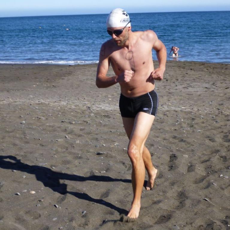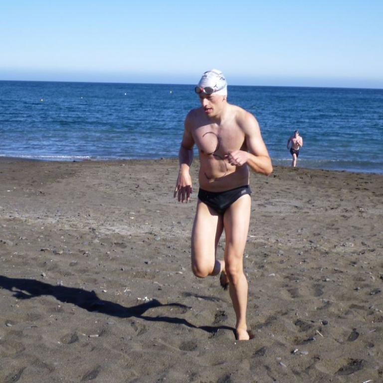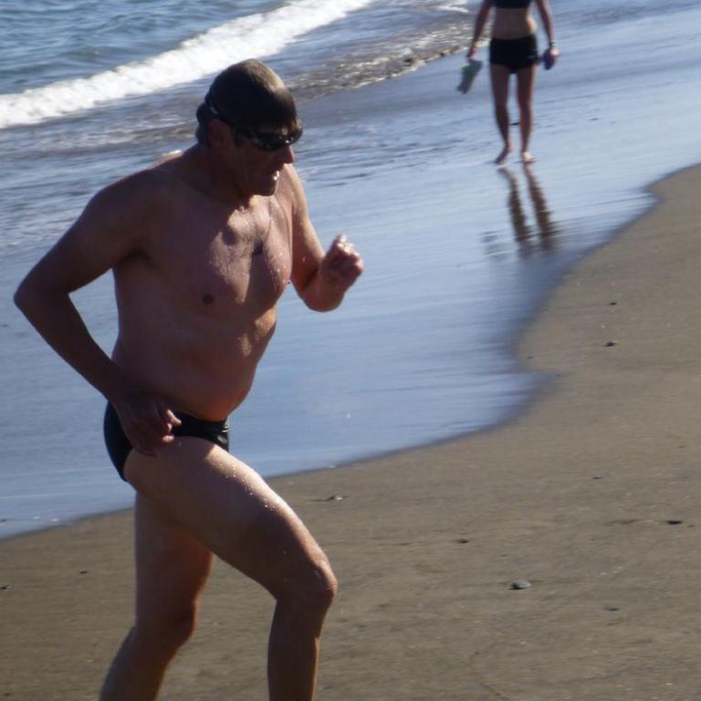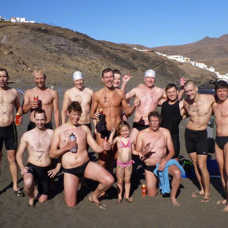 Um 16 Uhr stand der interne Laufstilanalyse.de Swim&Run Wettbewerb auf dem Programm. Da ich mich fit fühlte und von dem Bier beflügelt wurde, entschied ich mich bei dem Wettwerb mitzumachen. Mit Filzstift malte uns Ralf die Nummern auf den Körper. 11 "Verückte" standen dann am Start und ich mittendrin. Nach dem Startschuß unseres Kampfrichters Franz stürmten wir ins Meer. Ich kämpfte mich durchs Wasser, schluckte Salzwasser ohne Ende aber schaffte irgendwie die ersten 250 Meter von Boje zu Boje und wieder an Land. Wolfi, Roland und ich lieferten uns einen erbitterten Kampf um den letzten Platz, den ich letztendlich gewann. An Land mussten wir ca. 300 Meter laufen und dann wieder ab ins Wasser. Insgesamt waren es 3 Runden. Nach Runde 2 überlegte ich kurzfristig , ob ich mir die 3. Runde überhaupt antue, aber ich sprang nochmals ins 17 Grad warme Wasser und nahm auch gleich wieder einige Schluck Salzwasser. Erschöpft kam ich dann als Letzter ins Ziel, aber trotzdem zufrieden, das ganze durchgezogen zu haben. Beim Abendessen leitete Ralf die Siegerehrung und Done bekam seine "Goldene Ananas" überreicht. Auch der letzte Tag des Trainingslagers machte wieder sehr viel Spaß.