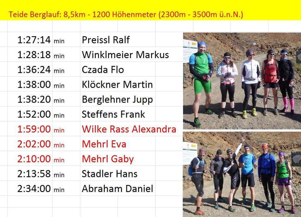 Es war Raceday: Berglauf der Laufstilanalyse.de Gruppe vom Parkplatz Montana Blanca von 2300 m zur Seilbahnbergstation Teide auf 3550 m. Wir fuhren mit mehreren Autos hoch und trafen uns dann bei der Parkmöglichkeit. Wir hatten herrliches Wetter, aber extreme Windverhältnisse, so dass die Seilbahn geschlossen war und deshalb alle später auch nach unten laufen musste. Die erste Gruppe mit den Mädels, Daniel und Hans startete 15 min vor uns. Gaby 5 min vor uns und dann die Speedgruppe mit Ralf, Martin, Franky, Floh, Jupp und mir. Es war klar das es ein heißer Fight werden würde. Floh brach gleich mal raus, gefolgt von Jupp, Ralf und Martin. Franky und ich gingen das ganze erst einmal langsam an. Meine Lungen mussten sich erst an die dünne Luft gewöhnen und ich kam deshalb nur gemächlich in Tritt. Zuerst kassierte ich Jupp und Martin ein. Nach 4 km hatte ich dann auch schon Floh. Ralf war in Führung aber in Sichtweite. Nach und nach überholte ich die Mädels und Hans und Daniel. Ab Kilometer 5 war nur noch schnelles gehen möglich, da es zu steil und auf den Geröllpfaden nicht mehr einfach war. Teilweise stieg ich auf allen Vieren weiter. Auf 3250 m kam ich am Refugio Altavista vorbei, hielt aber nicht an und kam langsam zu den ersten Schneefeldern. Ich gab nochmals Gas, was mir dank der Kälte auch zu Gute kam. Nach 1h 28 min 18 sec erreichte ich 1 Minute hinter Ralf als Zweiter von 13 Startern die Bergstation der Teideseilbahn. Insgesamt waren es 8,6 km und 1300 Hm. Ein paar Minuten nach uns sausten auch schon Floh, Martin und Jupp ins Ziel. Wir zogen uns kurz um und Floh, Jupp, Martin und ich entschieden uns, trotz der Sperre des Teides und widrigen Windverhältnisse auf den 3718 m hohen Vulkan zu steigen. Innerhalb 20 Minuten erreichten wir auch schon den Gipfel wo uns der Wind um die Ohren blies und der Schwefelgestank in der Nase biss. Wir hatten eine traumhafte Aussicht über ganz Teneriffa und waren stolz hier zu stehen. Wieder lauftechnisch ging es den Berg hinunter, da uns langsam bei den Minusgraden hier oben fror. Nach weiteren 1 Stunden erreichten wir ziemlich kaputt den Parkplatz und fuhren zurück ins Hotel, wo wir uns ein Siegerbier an der Poolbar genehmigten.