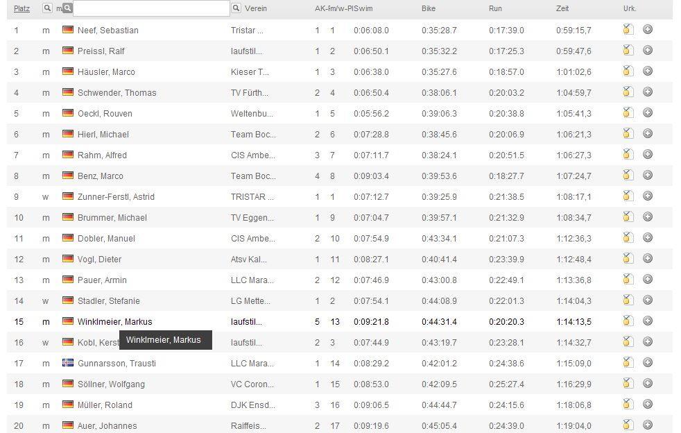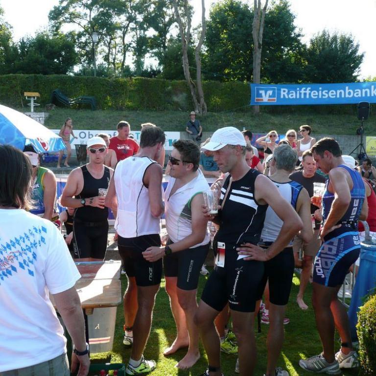 Zum 2. Mal startete ich beim Vilstaltriathlon in Rieden. Letztes Jahr selbe Zeit war es ein Schwimmdisaster. Dieses Jahr sollte es besser werden, leider war der Volksfestbesuch mit 3 Maß Bier am Tag davor nicht gerade optimal. Gut das die Startzeit erst um 16 Uhr war :-) Wie auch ein Jahr davor, wurde im 10 Sekunden Abstand gestartet. Ich war als 61. dran und schon befand ich mich auch im Wasser. Ich kam ganz gut voran ging nach ca. 8 Minuten nach 400 Metern (4 Minuten schneller als das Jahr davor) aus dem Wasser und sprintete zur Wechselzone. Rauf auf das Rad und los ging es gleich nach 3 Kilometern hinauf auf einen Berg mit 17 % Steigung. Hier musste ich ganz schön kämpfen aber trotzdem hatte ich relativ frische Beine. Auch auf der Radstrecke konnte ich 4 Minuten gegenüber dem letzten Jahr gut machen. Nach 23 Kilometer kam ich wieder bei über 30 Grad in die Wechselzone und startete auf die Laufstrecke über 5 Kilometer. Ich konnte super Gas geben und war nur am überholen, so wie ich es gewohnt war. Nach 20 Minuten kam ich ins Ziel mit 1 Stunden und 14 Minuten, über 9 Minuten schneller als das Jahr davor. Natürlich empfing mich im Ziel gleich Brigitte und gratulierte mir zum super Rennen. Ich wurde Gesamt 21 er (Sprint und Volkstriathlon) von über 100 Teilnehmern und in der Staffel erreichten wir mit der Laufstilanalyse.de den 2. Rang was uns natürlich sehr freute.