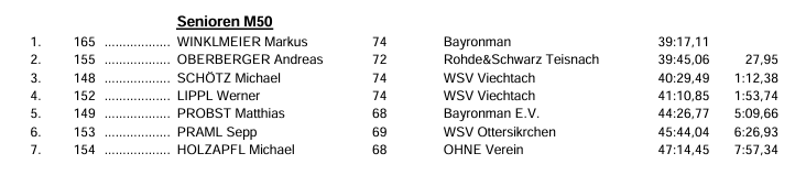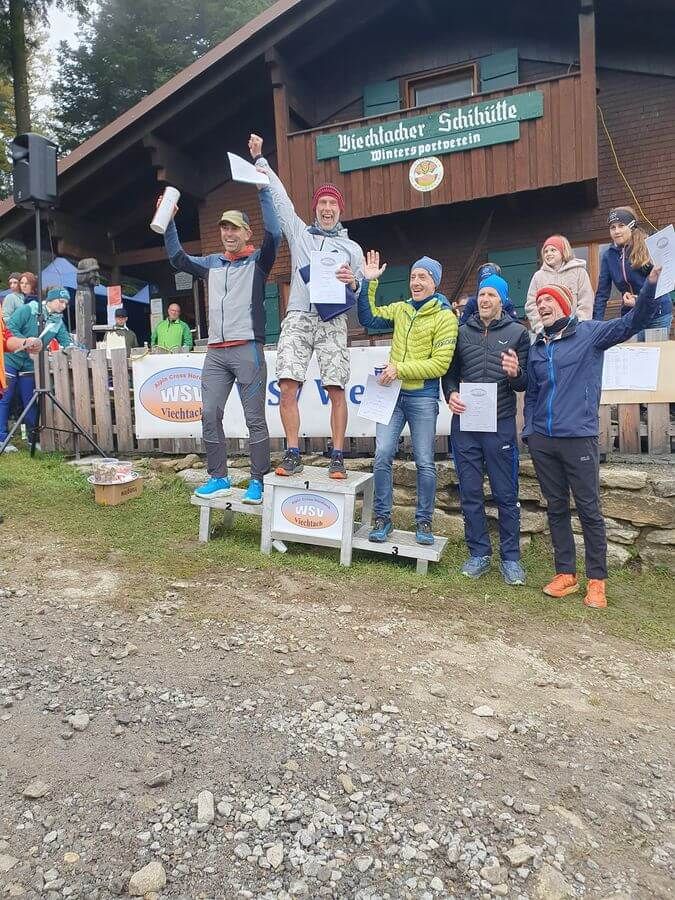 Nun war ich an der Reihe. Neben mir standen starke Läufer wie Tom Wanninger, Flo Schedlbauer, Martin Pfeffer und einige junge Talente. Mir war klar, dass ich ganz vorne keine Chance haben würde – aber ich wollte alles aus mir herausholen. Die Strecke führte zunächst steil hinauf zum Pröllergipfel. Über den Nordhang ging es anschließend rutschig bergab – nasse Steine und Wurzeln machten die Passage tricky, und mein Schuhprofil war auch nicht mehr das Beste. Bis zum Gasthaus Hochpröller verlor ich einige Plätze. Erst auf dem flachen Forstweg Richtung Hinterwies konnte ich wieder Tempo aufnehmen und einige Läufer überholen. Mit frischen Kräften und angefeuert von meiner Familie nahm ich den zweiten Anstieg in Angriff. In Sichtweite lief Andi, den ich als direkten Konkurrenten in meiner Altersklasse M50 kannte – mein Ziel war klar: vor ihm ins Ziel kommen! Zum dritten und letzten Mal ging es hinauf auf den Pröllergipfel. Bergab verlor ich wieder ein paar Meter, doch auf der flachen Passage konnte ich aufschließen. Die letzten Meter bergauf gab ich alles – und konnte mich schließlich absetzen. Nach 39 Minuten überquerte ich als Sieger der Altersklasse M50 die Ziellinie. Timi lief die letzten Meter an meiner Seite ins Ziel, was mich sehr freute. In der Gesamtwertung belegte ich Platz 11 – ein gutes Ergebnis bei diesem hochkarätigen Starterfeld.