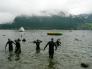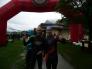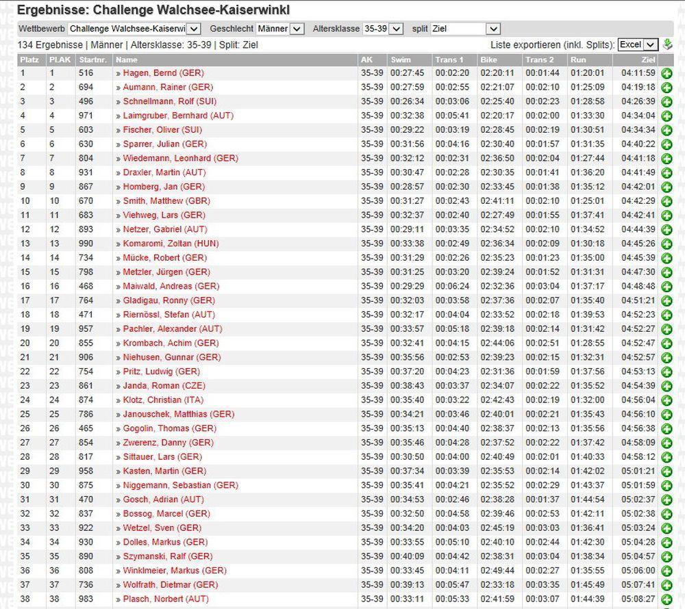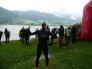 Nachdem mich der Wecker aus dem Schlaf holte und ich für das Fenster hinaus schaute, dachte ich nur zwei Wörter: "Scheiß Wetter". Es regnete in Strömen. Na toll! Trotzdem wollte ich das Event durchziehen. Um kurz vor 8 Uhr trafen wir uns in der Wechselzone bei Regen, Regen und nochmals Regen. Einige Athleten holten ihre Bikes aus der Wechselzone und gingen gleich gar nicht an den Start. Ich war schon vor dem Wettkampf völlig durchnässt, was aber meine Motivation nicht minderte. Um 9:25 Uhr stand ich dann mit Brigittes Bruder Hans, der seinen ersten Triathlon überhaupt bestritt, Roland und Christoph am Start in der AK 30-39. Startschuss and Go! Da ich in der ersten Reihe startete, entkam ich den Schlägereien und konnte ziemlich entspannt zur ersten Boje schwimmen. Es lief super und ich musste mich direkt bremsen um nicht zu viel Energie zu verlieren. Nach knapp über 33 Minuten 45 Sekunden stand ich auch schon wieder an Land und wurde von Brigitte, Dani, Bianca, Wolfi, Katrin und Sabine angefeuert. Den Wechsel schaffte ich in knapp über 4 Minuten und ab ging es mit dem Tribike auf die Strecke. Es regnete extrem stark, so dass ich mit Brille nichts mehr sehen konnte, also fuhr ich die komplette Strecke ohne. Ich fühlte mich richtig gut und kam ganz gut voran und war fast nur am Überholen. Da die Strecke zum letzten Jahr verändert worden war, kannte ich sie nicht und musste bei den Bergabpassagen höllisch aufpassen. Die Bremsen funktionierten dank der Nässe kaum noch, die Straße war dank Regen und Kuhscheiße ziemlich rutschig und viele Kurven erschwerten das Ganze. Trotzdem schaffte ich die 90 Kilometer in 2 Stunden und 49 Minuten, obwohl auch noch 1100 Höhenmeter zu überwinden waren. Nach knapp über 2 Minuten Wechsel war ich auch schon auf der Laufstrecke. Mit einem 4:10 er Schnitt lief ich los. Meine Füße mussten sich erst an die Laufbewegung gewöhnen, was mir aber ziemlich schnell gelang. Auch auf der Laufstrecke war ich nur am Überholen, was mir ziemlich Spaß machte. Die meiste Motivation bekam ich aber, wenn ich an Brigitte und dem Laufstilanalyse Fanblock vorbei kam. 4 Runden um den Walchsee waren zu meistern. Die erste Runde schaffte ich mit einer 4:12 Pace, die zweite mit 4:26. Nur die dritte Runde wurde etwas härter, so dass ich auf 4:49 zurückgehen musste. In der letzten Runde konnte ich mich wieder etwas steigern, aber eine Zeit unter 5 Stunden war nicht mehr drin. Trotzdem lief ich in 5 Stunden und 6 Minuten mit neuer persönlicher Bestzeit unter Anfeuerungsrufen überglücklich ins Ziel. Zum Abschluss der Triathlonsaison konnte ich nochmals ein super Ergebnis vorweisen. Ich wurde 221. von ca. 1100 männlichen Startern in der Gesamtplatzierung und erreichte einen 36. Platz in der Altersklasse. Auch John, Hans, Gabi, Eva, Franz, Roland und Christoph finishten mit super Zeiten und können stolz auf sich selber sein. Dank des perfekt ausgearbeiteten Trainingsplanes von Ralf und Laufstilanalyse.de, der optimalen Versorgung durch Caro und Nutritional-Finetuning, der perfekten Radeinstellung durch Iron Trizone und Brigitte der besten Ehefrau der Welt, die mich immer und überall unterstützt, konnte ich zum Schluss noch einen perfekten Wettkampf hinlegen. Aber ich wäre nicht ich, wenn die Saison zu Ende wäre. Noch immer bin ich nicht ausgebrannt, nein, das Gegenteil, hochmotiviert. Die nächsten 7 Wochen stehen im Zeichen des reinen Laufsports. Ich will als Hauptevent Anfang Oktober den Bodenseemarathon meistern, dazwischen gibt"s den Berglauf Kine vom Kaitersberg, auch beim Landkreislauf bin ich am Start. Und zum Abschluss werde ich noch am Wolfgangseelauf mitte Oktober teilnehmen. Dann geht"s für 3 Wochen in die Saisonpause. Wie immer sind meine Ziele hochgesteckt, aber machbar .