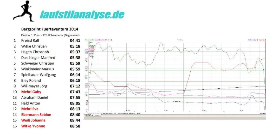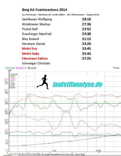 Wir schliefen heute bis um 8 Uhr und gingen dann gemütlich zum Frühstück. Um 10 Uhr fuhr ich mit den Laufstilanalyseathleten zum 30 Kilometer entfernten Startpunkt für das heutige Bergrennen. Brigitte fuhr mit Hans, Mario und Sabines Freund eine kleinere Tour. Das 8 Kilometer Bergrennen lief als Jagdstart ab. Die Zeiten errechneten sich aus dem gestrigen Bergsprint. Ich durfte als drittletzter auf die Strecke und startete zur Aufholjagd. Nach dem ich alle überholt hatte, stand mir nur noch Wolfi im Weg. Da ich 45 Sekunden nach Wolfi gestartet bin, war es nicht so einfach den Abstand zu verringern. Wolfi kam als erster ins Ziel, aber nur 5 Sekunden hinter ihm kam ich als zweiter an. Alle gaben alles und kamen mit super Zeiten nach den 8 Kilometern ins Ziel. Wir fuhren dann über Pajara nach Hause. Auch den Pajara Berg brauste ich mit einem Affenzahn hinauf und dann nach Hause. Dort traf ich mich gleich mit Ralf zum Koppellauf. Die erste Hotelrunde (1,7 km) liefen wir in einer 4:16 Pace, die zweite in 3:53 Pace und in der letzten Runde konnte ich mit Ralf nicht mehr mithalten und schaffte nur noch eine 3:57 Pace. Nach der dringend nötigen Dusche machten wir es uns am Pool in der Sonne gemütlich, bevor es zum Abendessen ging.