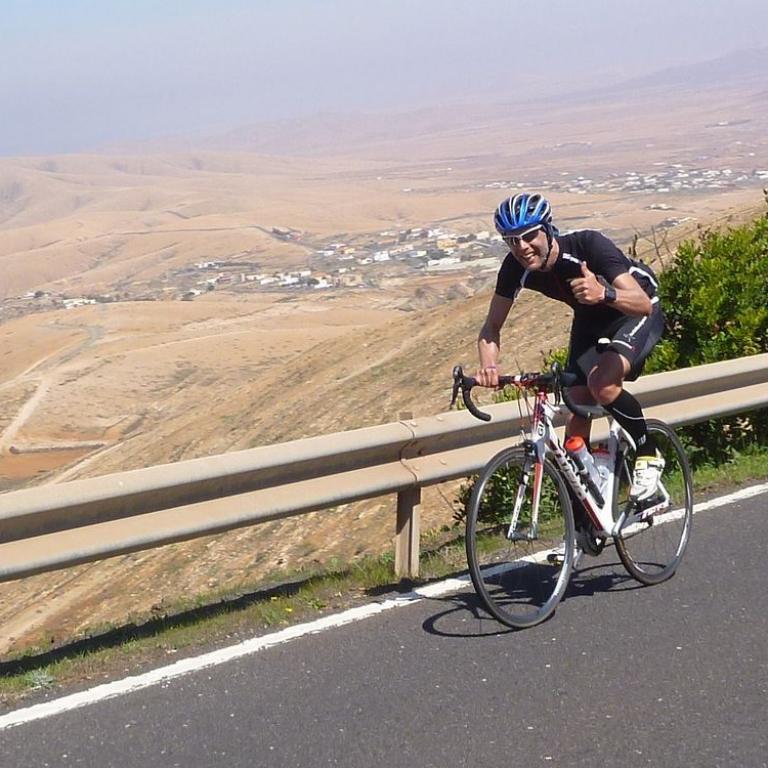 Um 7 Uhr liefen wir auf den Hügel hinter dem Hotel. Natürlich machte mir der Trail viel Spaß. Nach 45 Minuten und knapp 8 Kilometer erreichten wir wieder unser Hotel. Nach dem Frühstück holte Brigitte ihr Leihrad und wir drehten eine kleine Runde. Um dreiviertel 10 fuhren wir mit den Mädels nach Cardon, wo um viertel nach 11 der Start zum Bergsprint geplant war. 30 Sekunden vor uns starteten die Mädels und dann waren wir an der Reihe. Leider kam ich nicht in die Klickpedale rein und verlor einiges an Zeit. Als Letzter startete ich dann eine Aufholjagd auf der 110 Höhenmeter und 1 Kilometer langen Bergstrecke. Ich konnte einige von uns überholen, bevor ich auf meinen Battle Partner Christian traf. Ich konnte ihn überholen und bis kurz vor dem Ziel die Führung halten, aber dann zog er mit einer Radlänge an mir vorbei und kam dadurch vor mir ins Ziel. Trotzdem machte das Rennen wieder sehr viel Spaß. Danach fuhr ich wieder mit Brigitte langsam zurück, das sie ja in ihrer Schwangerschaft nicht zu hoch mit dem Puls kommen sollte. In Gran Tarajal suchten wir uns ein nettes Strandcafe und aßen eine Kleinigkeit. Zurück im Hotel ging ich zum Schwimmen mit den Anderen Athleten. Im Anschluss legten wir uns an den Pool und tranken gemütlich eine Dose Bier, bevor es zum Abendessen ging.