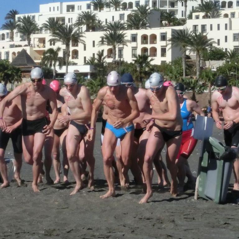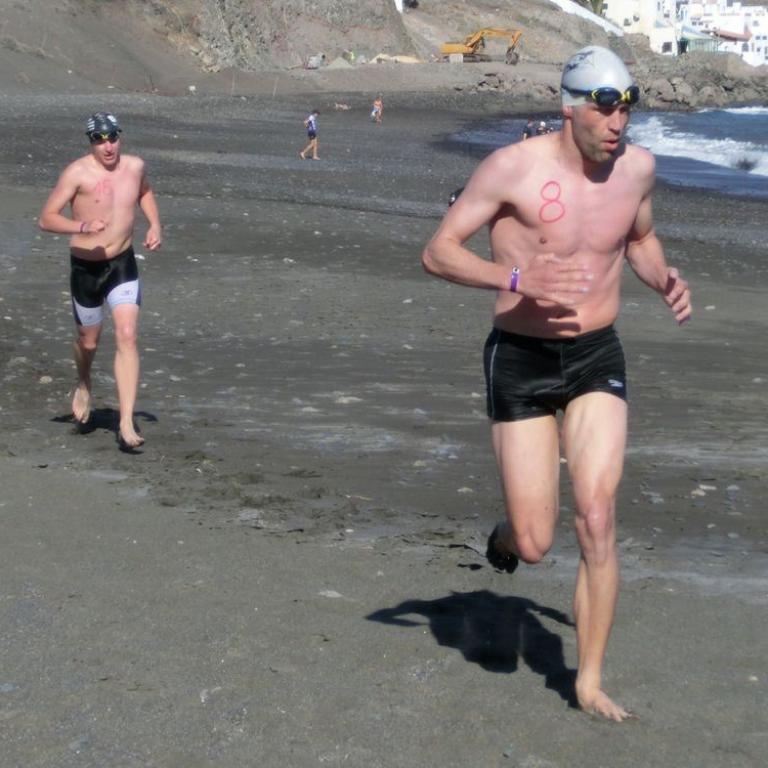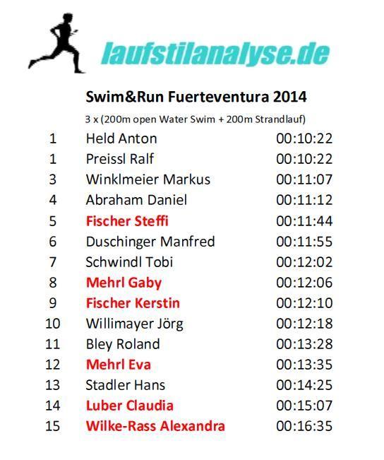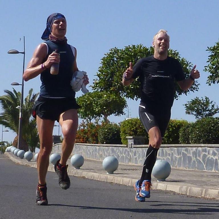 Gleich nach dem Frühstück starteten wir Richtung Süden mit Ziel Jandia. Wir hatten herrliches Wetter und es war etwas wärmer als die letzten Tage. Ich fuhr mit Ralf, Tobi, Christian und Jörg. Nach 1h 40 min und 50 Kilometer erreichten wir Jandia. Ralf und Christian fuhren noch zur nächsten Ortschaft und der Rest drehte um. Jetzt hieß es kämpfen, denn wir hatten extremen Gegenwind. Wir kamen durch Wüstenlandschaft und hatten immer wieder einen wunderbaren Blick auf das Meer. Done schloss sich uns an und wir kämpften zusammen gegen den Wind. Nach insgesamt 100 Kilometern 1500 Höhenmetern und 4 Stunden erreichten wir wieder unser Hotel. Nach einer Dusche und Regi Drink fühlte ich mich fit für den "härtesten" Wettkampf des Jahres, den Swim&Run Fuerteventura. Um halb 4 trafen wir uns am Pool, wo wir unsere Startnummern aufgemalt bekamen. Am Strand steckten wir noch die Strecke ab und schon standen 16 Athleten der Laufstilanalyse an der Startline. 3 Runden mussten wir bewältigen, ca. je Runde 200 m Schwimmen und 150 m Lauf. Nach dem Startschuss war ich gleich an dritter Stelle hinter Ralf und Done. Im Wasser liefert ich mir noch ein Duell mit Daniel, was ich aber für mich entscheiden konnte. Nach den drei Runden erreichte ich das Ziel als Gesamt Dritter. Ich konnte mit meiner Leistung sehr zufrieden sein. Beim Abendessen gab es noch eine Siegerehrung, wo Ralf super Preise für uns bereithielt. Ich gewann eine externe USB Festplatte. Coole Sache und wieder ein super gelungenes Laufstilanalyseevent.