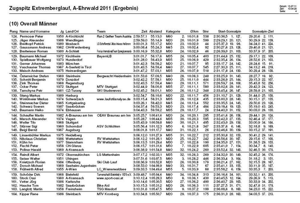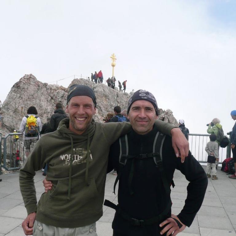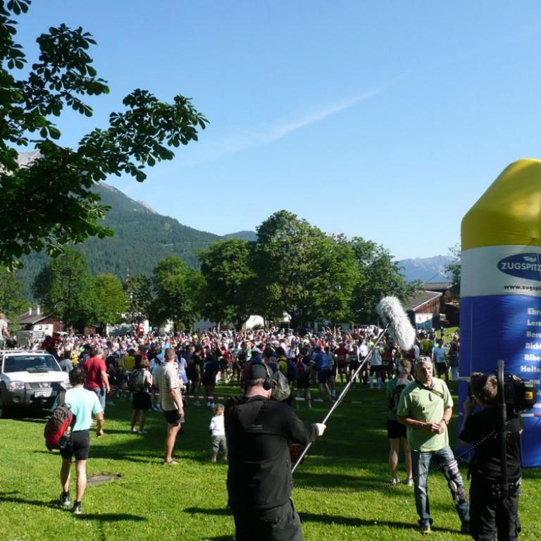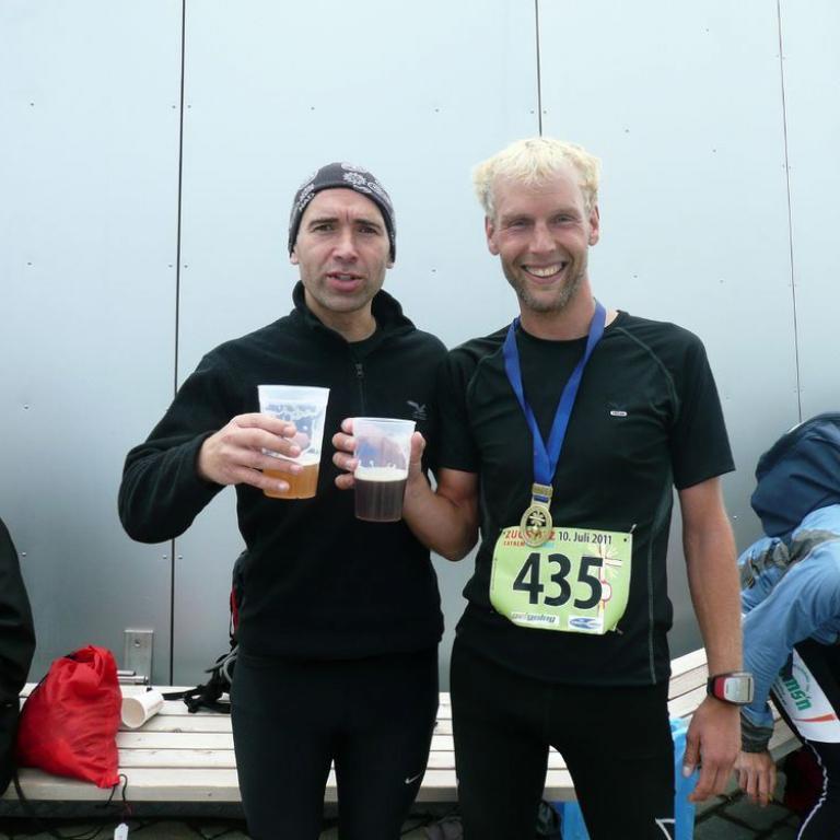 Schon am Samstag fuhren wir über den Globetrotter in München nach Ehrwald. Am Abend holten wir unsere Startunterlagen und gingen später noch zum Steakessen. Mit dabei waren Wolfi und Brigitte. Letztere war natürlich unser Maskottchen für den harten Lauf. Fast 2300 Höhenmeter und 17,9 Kilometer bis man auf der Zugspitze, den höchsten Berg Deutschlands steht. Sonntag früh war es soweit, obwohl wir zum 2. Mal starteten, waren wir schon etwas nervös. Nach dem Frühstück (Semmel mit Nutella) ging es nach Ehrwald Richtung Start. Das Wetter sah vielversprechend aus. Für Nachmittag waren Gewitter angesagt, aber da wollten wir dann schon wieder vom Berg herunten sein. Um viertel nach 9 war es dann so weit. Startschuß in 1000 Meter Höhe. Es waren viele internationale Läufer (England, USA, Ägypten ...) am Start. Zuerst ging es relativ eben durch Ehrwald hindurch weiter auf einer teilweise geteerten Forststraße schon mit guter Steigung. Viele Läufer mussten hier schon gehen. Den ersten Kilometer fühlte ich mich nicht fit und ich merkte das harte Training in der Woche vorher, aber dann kamen die Füße immer besser in den Tritt und ich konnte immer wieder überholen, da ich relativ weit hinten gestartet bin. Nach ca. 500 Höhenmeter erreichten wir die Ehrwalder Alm wo die erste Verpflegungsstation war. Nun liefen wir auf Forststraßen zwischen Kühe hindurch, weiter bis zur Hochfeldernalm auf fast 1800 Meter. Hier hatten wir eine herrliche Aussicht auf die umliegenden Berggipfel. Von hier ging nur noch ein schmaler Steig über steile Almwiesen weiter, wo auch Laufen teilweise unmöglich war. Zuerst mussten wir auf fast 2200 Hm hinauf. Ich fühlte mich Top in Form, wurde aber immer wieder ausgebremst, da das Überholen fast unmöglich war. Auf einem Grad angekommen ging es dann steil bergab und wir rutschten und liefen gleichzeitig so schnell es die Vorderleute zuließen nach unten. Relativ schnell ging es dann wieder auf über 2000 Meter hinauf und wir waren am Gatterl, der österreichischen, bayerischen Grenze. Ab hier waren wir im Hochgebirge. Über Fels und Stein stiegen und liefen wir weiter bis zur Knorrhütte, wo wir nochmals eine Verpflegungsstation vorfanden. Wolfi war mir dicht auf den Fersen. Von der Hütte ging es über Geröll und dann auch Schnee steil nach oben. Nur kurze Passagen konnte man Laufen, ansonsten war schnelles Gehen bzw. Steigen angesagt. Kurz vor der Seilbahnstation Sonn-Alpin überholte mich Wolfi und konnte sich etwas absetzen. Ich trank 2 Isogels, die ich in der Laufhose hatte und spürte sofort die Energie. Am Sonn-Alpin konnte ich Wolfi wieder einholen. Dort stand auch Brigitte mit Kamera und Anfeuerungsrufen. Nun hieß es Gas geben für die letzten 400 Höhenmeter, den Steig hinauf ins Ziel. ich fühlte mich wieder topfit. Zusammen liefen wir weiter. Über das Geröll konnte man nur steigen. Teilweise gab es Drahtseilversicherungen an den man sich hochziehen konnte. Auf halber Strecke merkte ich ein ziehen im linken Fuß. Ich dachte nur, scheiße ein Krampf und schon war der linke Fuß ausser Gefecht. Wolfi musste ich leider ziehen lassen und ich quälte mich die letzten Meter ins Ziel und verpasste um 3 Minuten die 3 Stunden Marke. Trotzdem war es wieder ein herrliches Gefühl auf dem Dach Deutschlands zu stehen und von Hunderten Zuschauern gefeiert zu werden. Ich wurde 140. von über 500 Läufern. Im nächsten Jahr muss die 3 Stunden Marke natürlich fallen. Wolfi erreichte den 130. Platz was mich sehr gefreut hatte.